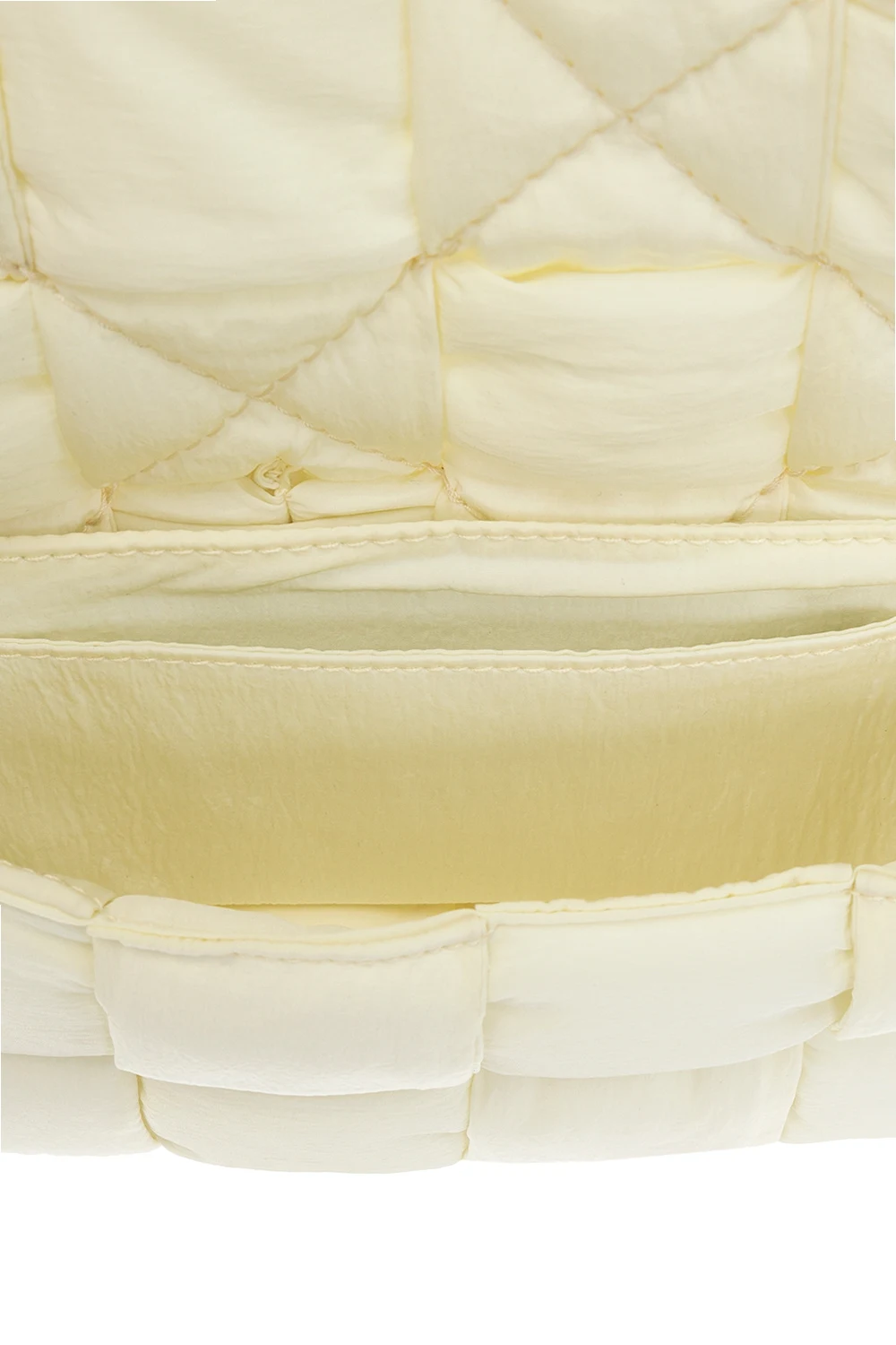 Light yellow ‘Cassette Mini’ handbag from Bottega Veneta. Crafted from fabric with the label’s signature Intreccio weave, this model features a fold-over top with magnetic snaps, adjustable shoulder straps, silver-tone metal hardware and one internal compartment with one slip pocket.