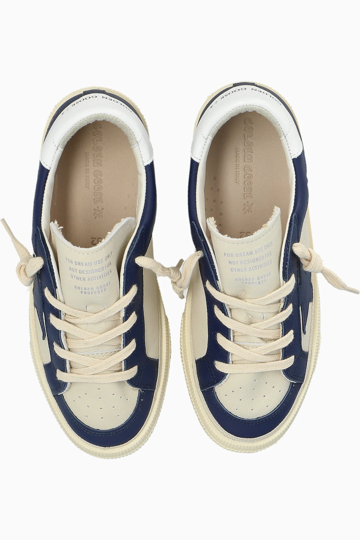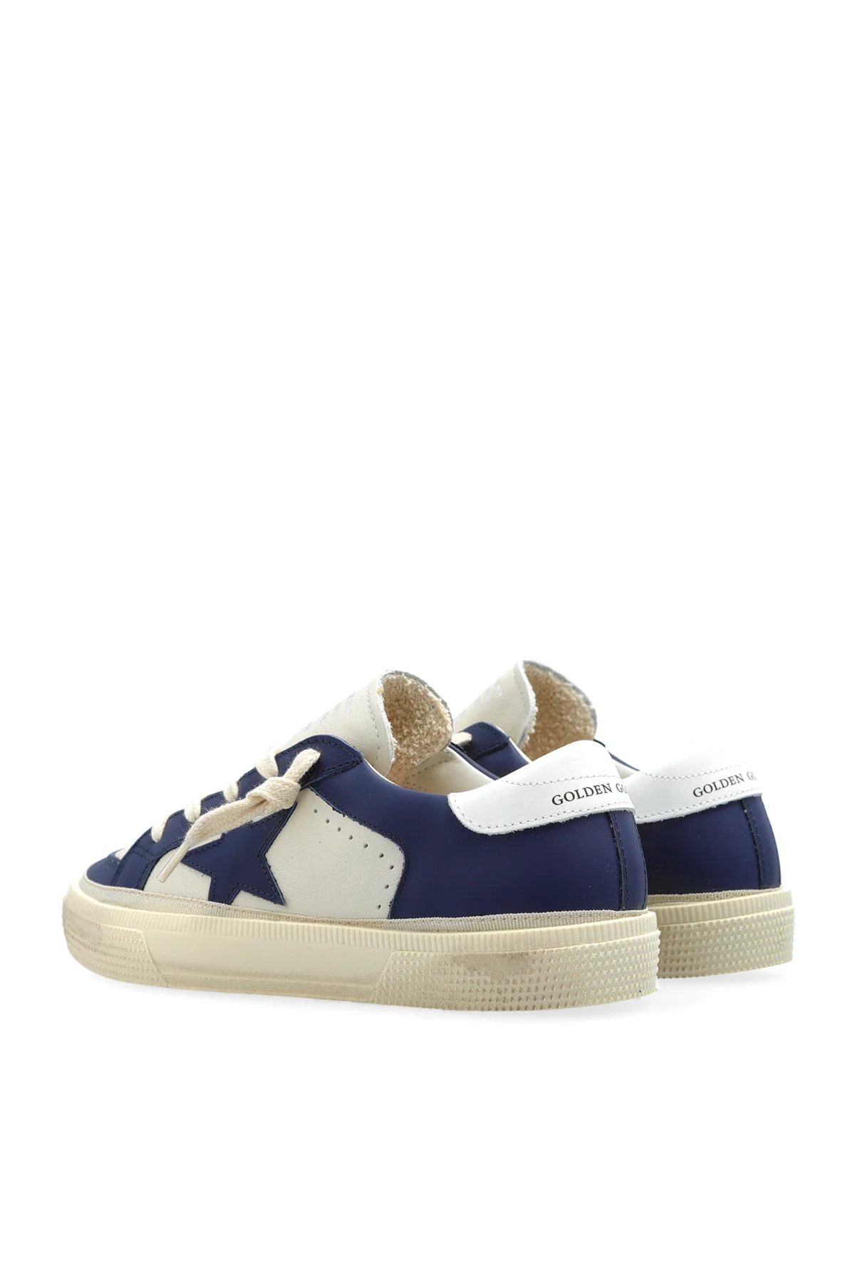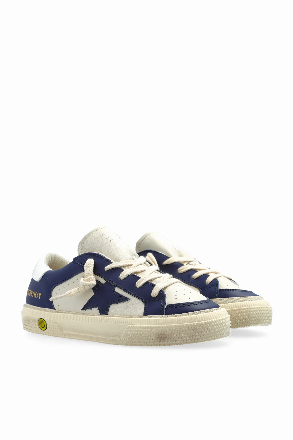 Presenting the May With Double Quarter And Toe, an exquisite creation from the renowned Golden Goose Kids collection. These children\'s sports shoes epitomize a seamless fusion of style and function, crafted with the utmost precision and care. The dominant navy hue is gracefully complemented by white accents, culminating in a visually striking design. The exterior is fashioned from premium leather, ensuring durability and a luxurious feel, while the interior combines soft leather with high-quality materials for unparalleled comfort. Distinctive features include a navy star emblazoned on the side and the iconic \"GOLDEN GOOSE\" inscription on the heel. The creamy sole and laces provide a sophisticated contrast to the navy elements, enhanced by a whimsical yellow smiley detail. Embodying a blend of classic sportiness and modern flair, these shoes are perfect for the discerning young fashionista. Why Choose This Product? Expert craftsmanship from the prestigious Golden Goose. Unique design elements with a playful twist. Superior comfort with a soft leather interior. Chic and versatile color palette. Signature distressed effect for a fashionable edge.