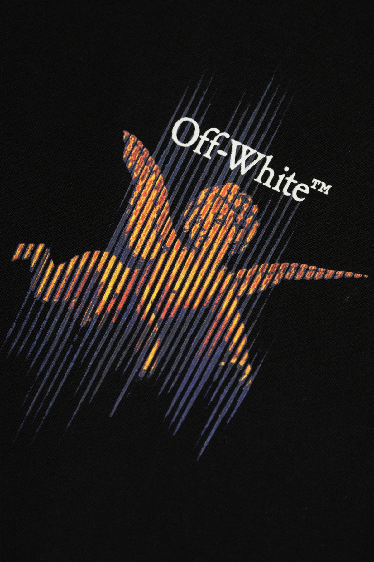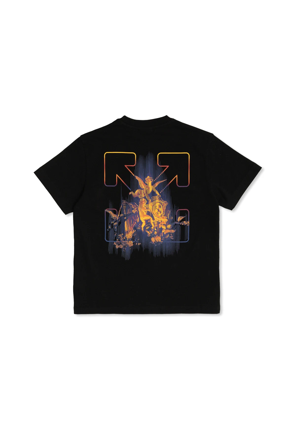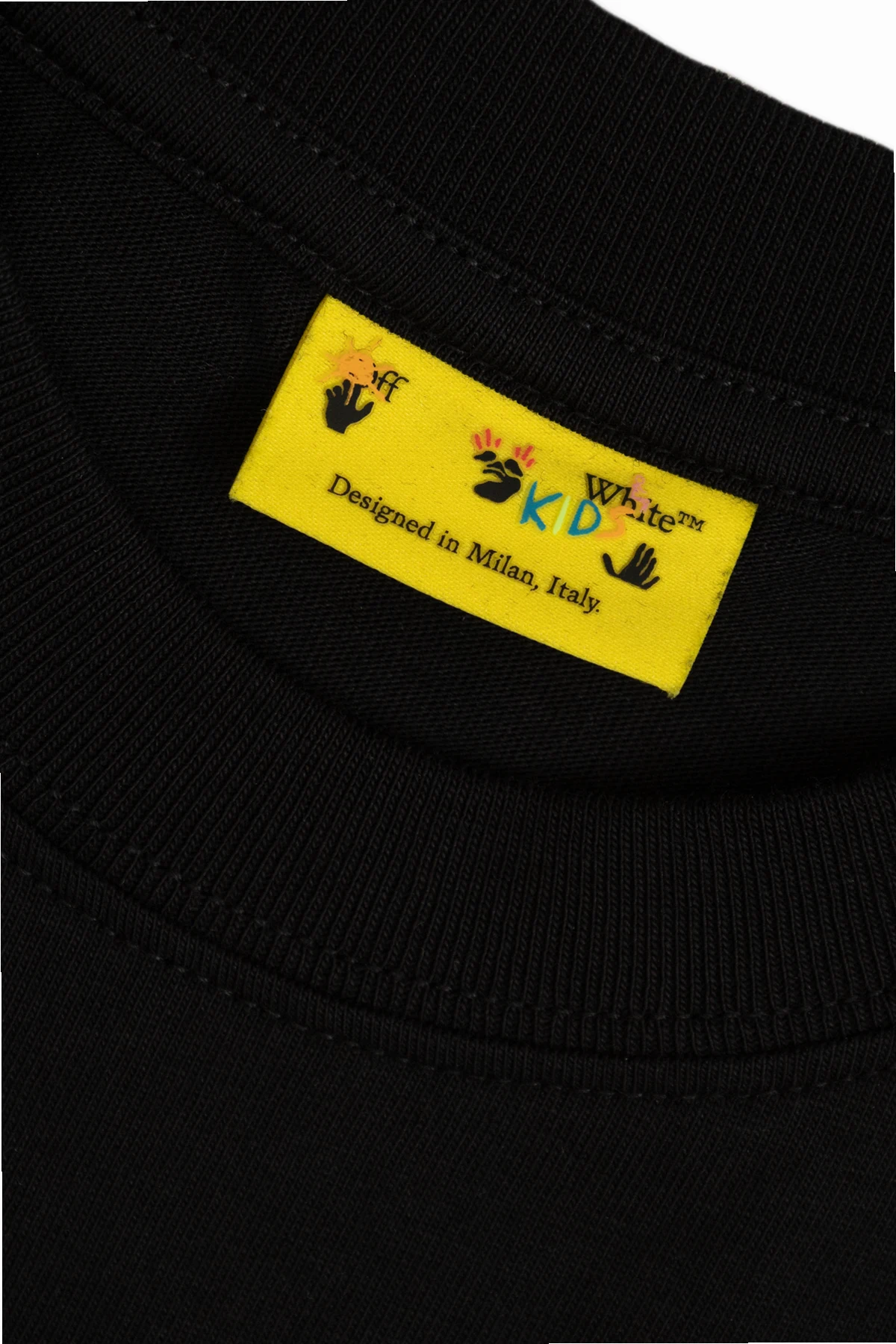 Introducing the Off-White Kids T-shirt, a paragon of youthful elegance and modern culture, crafted exclusively for the discerning young gentleman. This black T-shirt is an exquisite addition to Off-White\'s illustrious collection, designed for boys aged 4 to 14. The front of this luxurious garment features a vibrant print of an angel with the iconic \"Off-White™\" inscription, enhanced by dynamic vertical lines. The back is adorned with a striking angel motif encircled by arrows, rendered in bold shades of yellow and orange, creating a stunning contrast against the black fabric. Meticulously crafted from the finest 100% cotton, this T-shirt offers unparalleled comfort and style. It bears a distinct yellow label inscribed with \"Off-White™ KID,\" signifying its Milanese origin and exceptional attention to detail. Why Choose This Product? Exclusive design with iconic Off-White™ motifs. Exceptional comfort from premium cotton fabric. Unique blend of Italian craftsmanship and modern flair. Part of a prestigious collection by renowned designer Virgil Abloh.