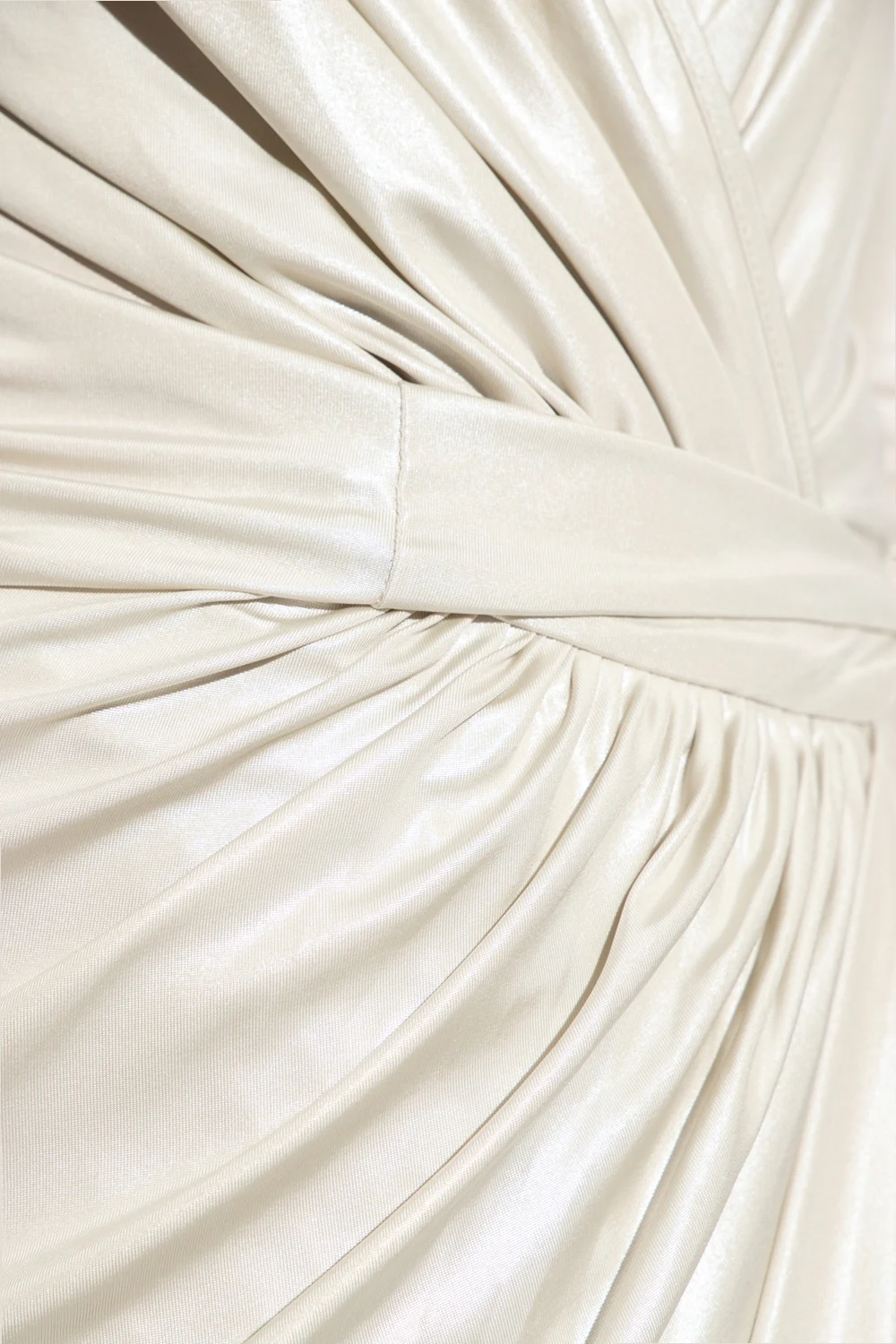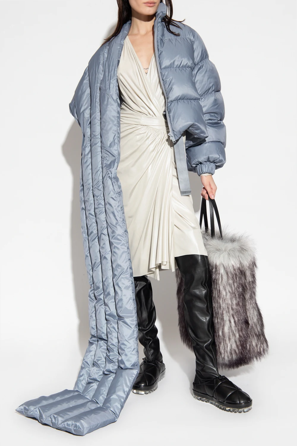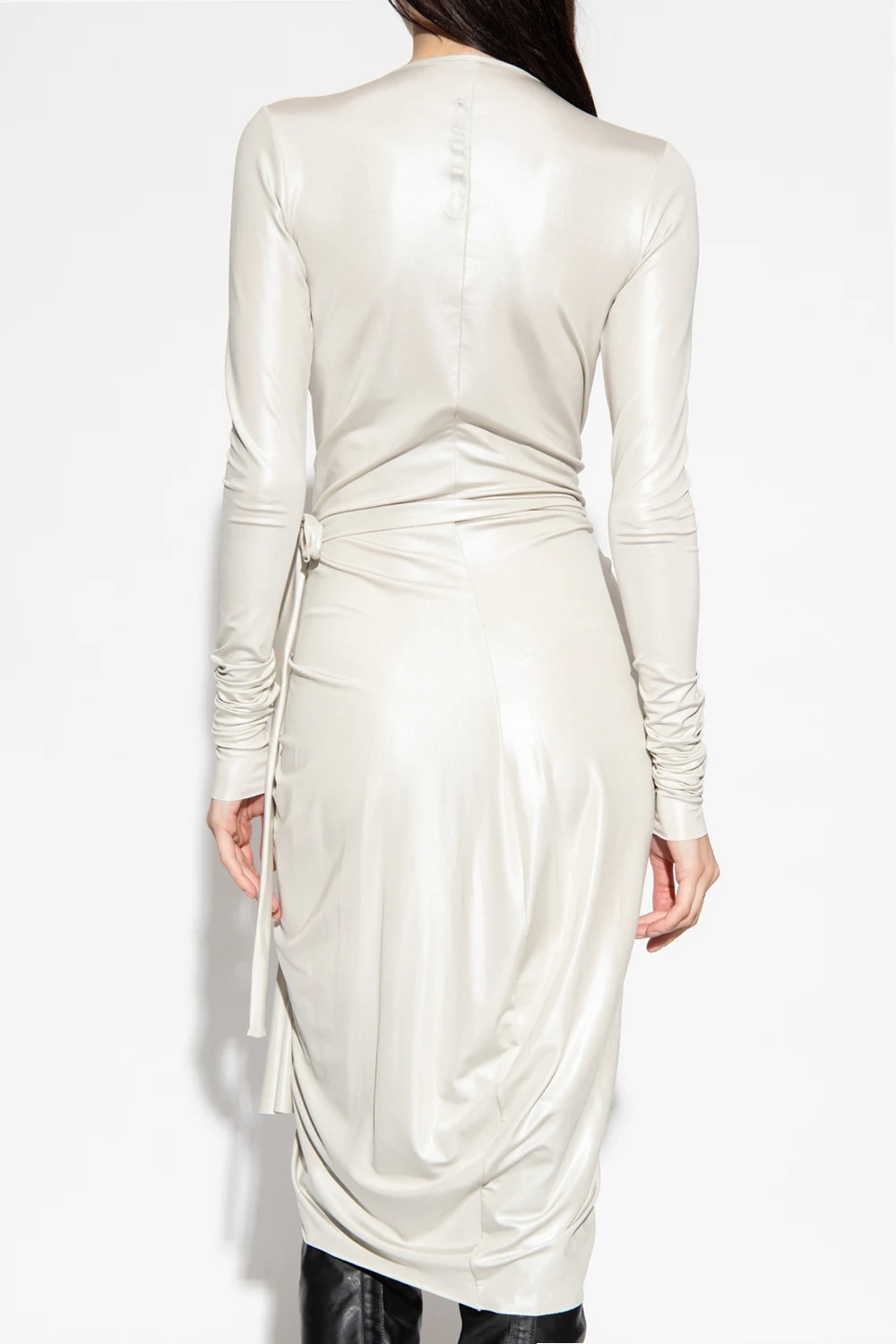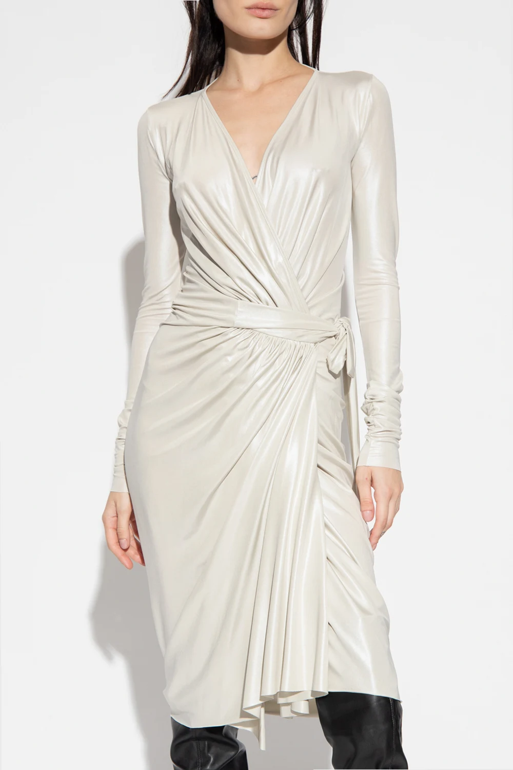 Light grey ‘Vered’ wrap-over dress from Rick Owens Lilies. Crafted from stretchy fabric with a shiny finish, this design features a waist belt, draped details, V-neck and long sleeves.