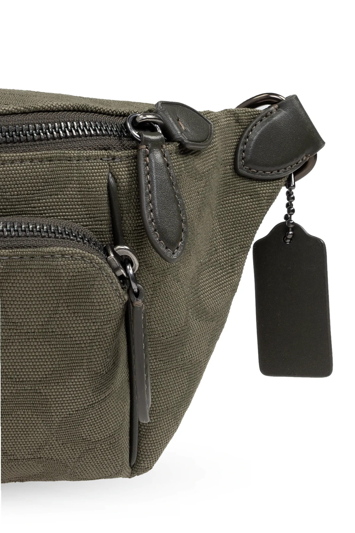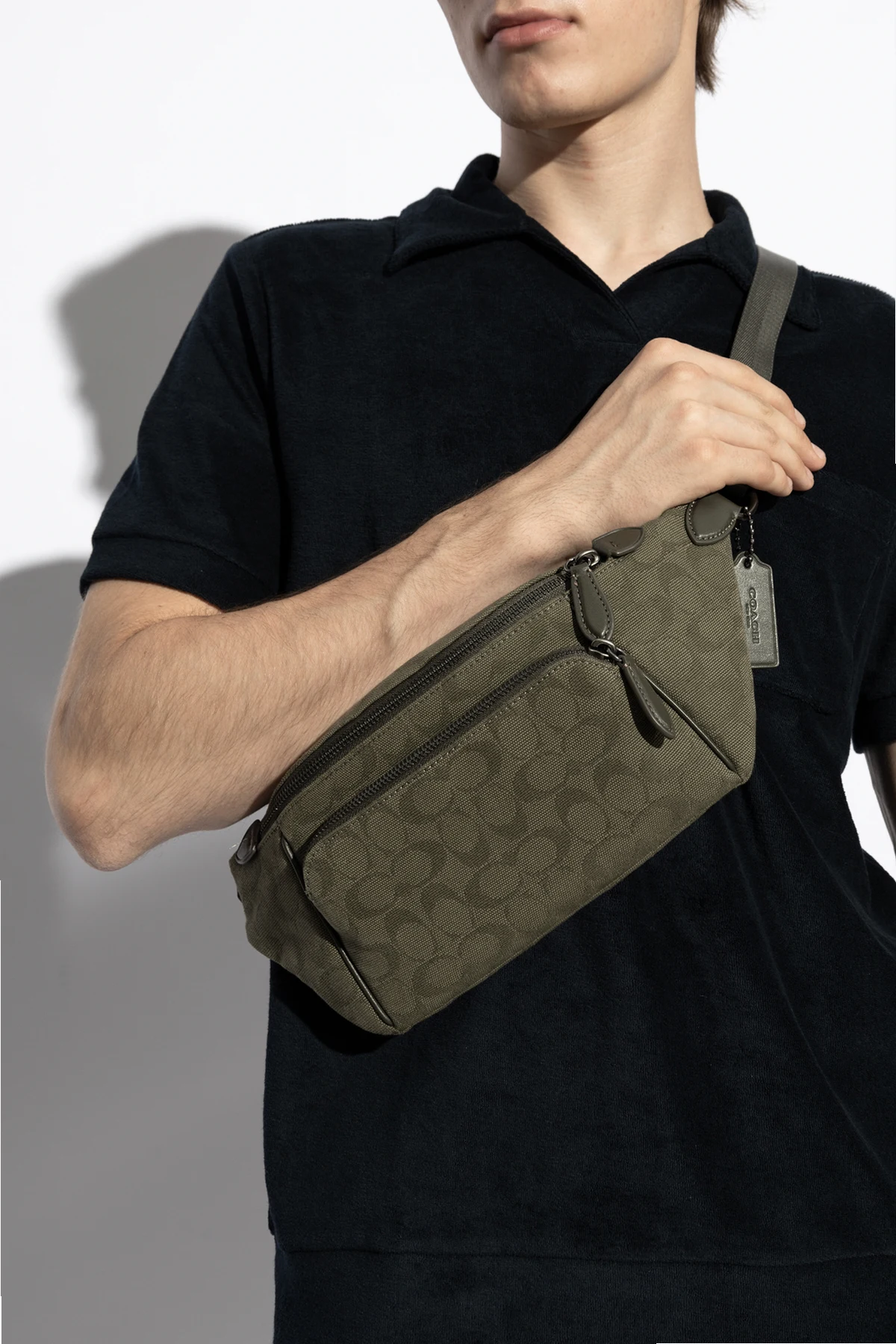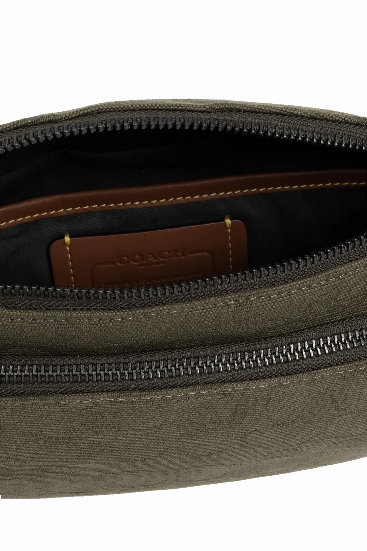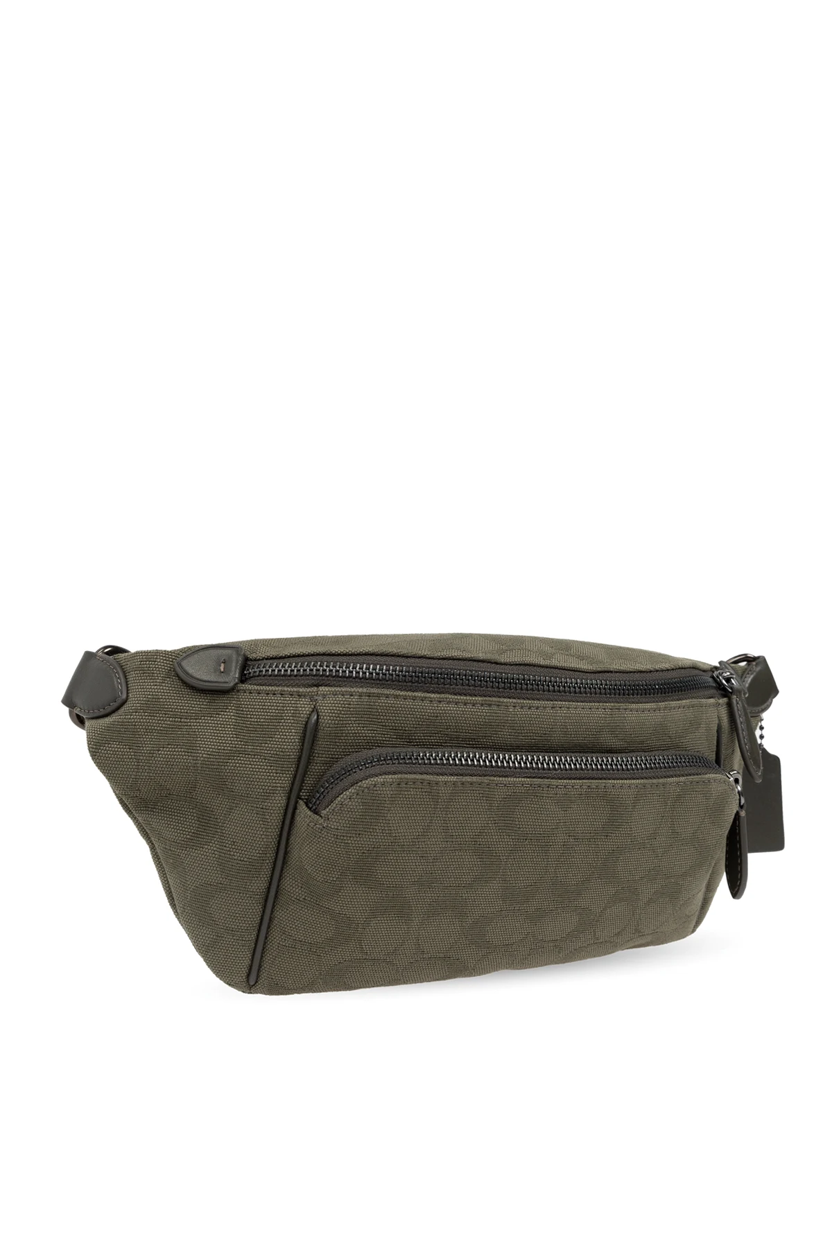Introducing the epitome of sophistication and functionality - the Coach Waist Bag in an elegant khaki green. Crafted with precision, this accessory marries a compact and streamlined silhouette with softly rounded edges, exuding an air of refined simplicity. The bag’s surface is adorned with a subtle, repetitive monogram pattern, a distinctive hallmark of luxury. Made from premium-quality, durable canvas with a finely textured finish, it promises not only style but longevity. The attention to detail is evident in its functional elements, including a main zippered compartment and a front zip pocket for easy access to essentials. The adjustable strap with a secure closure allows for versatile styling, while leather accents on zipper pulls and possibly the brand logo on the internal label, alongside a branded tag, underscore its exclusivity. Internal branding, visible on the main compartment\'s inner side, attests to the bag’s authenticity and its alignment with the standards of exclusive brands. Its practicality is enhanced by multiple pockets and robust construction, typical of luxury items. Why Choose This Product? Exquisite craftsmanship and high-quality materials ensure durability and style. The luxury monogram pattern and leather details add a touch of elegance. Functional design with multiple pockets for organized storage. Versatile wearability made possible by the adjustable strap. A testament to authenticity with branded internal labels.