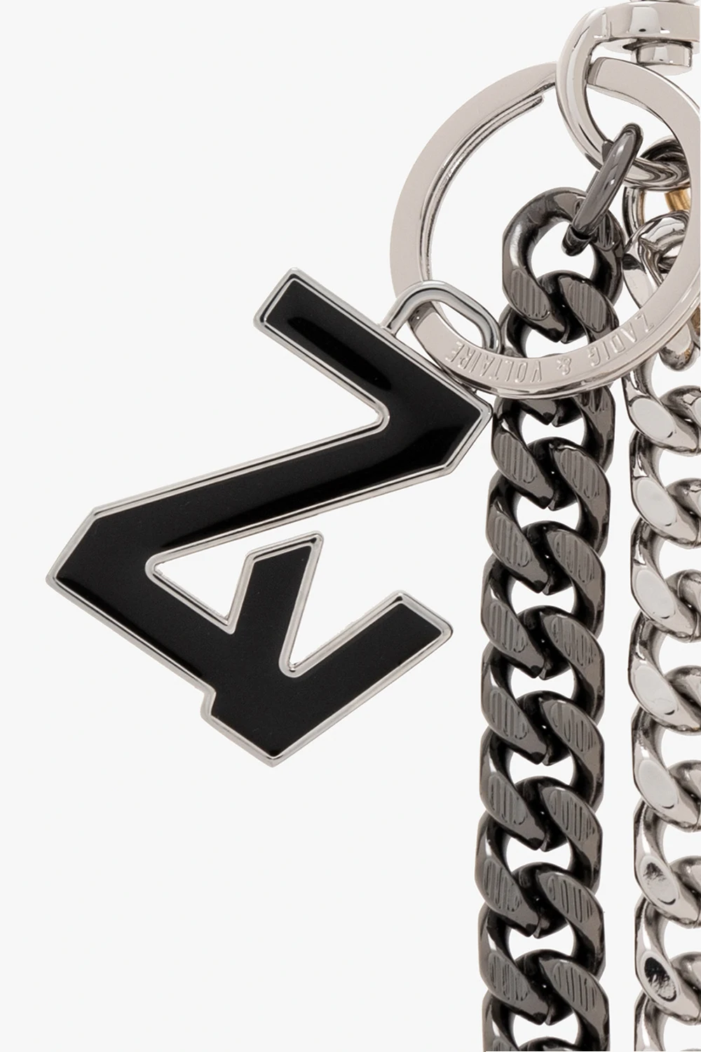 Silver-tone key ring from Zadig & Voltaire. Made from brass, this item features a logo-shaped charm, a lobster clasp fastening and three chains in silver-tone, gold-tone and black.