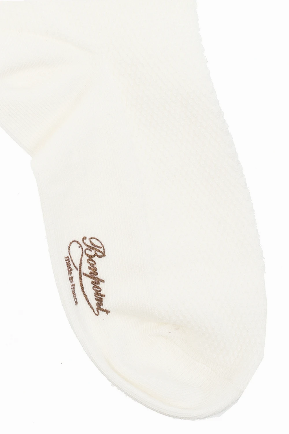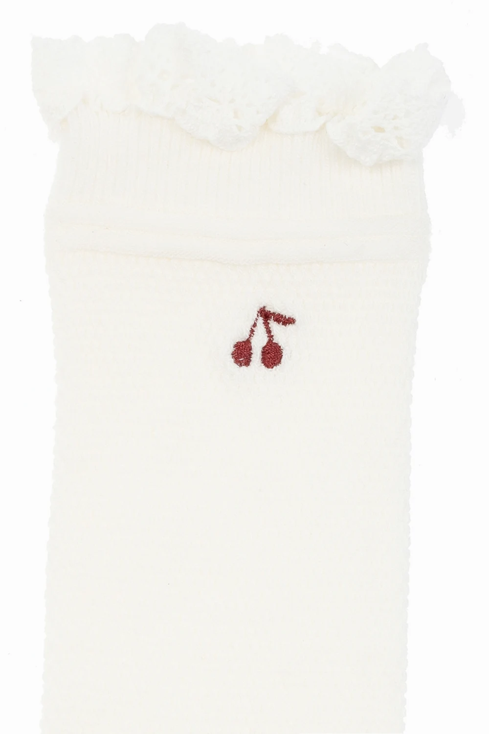 Cream socks from Bonpoint Kids. Crafted from a ribbed cotton knit, this pair features cherry embroideries and an elastic edge with a lace ruffle.