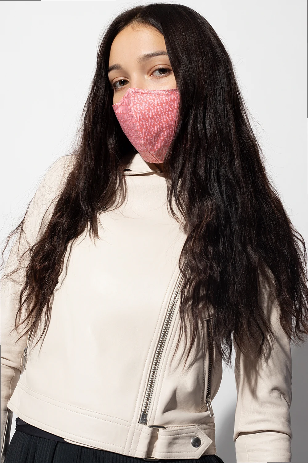 Pink and white face mask from Michael Michael Kors. Made of cotton, this item showcases a logo pattern.
