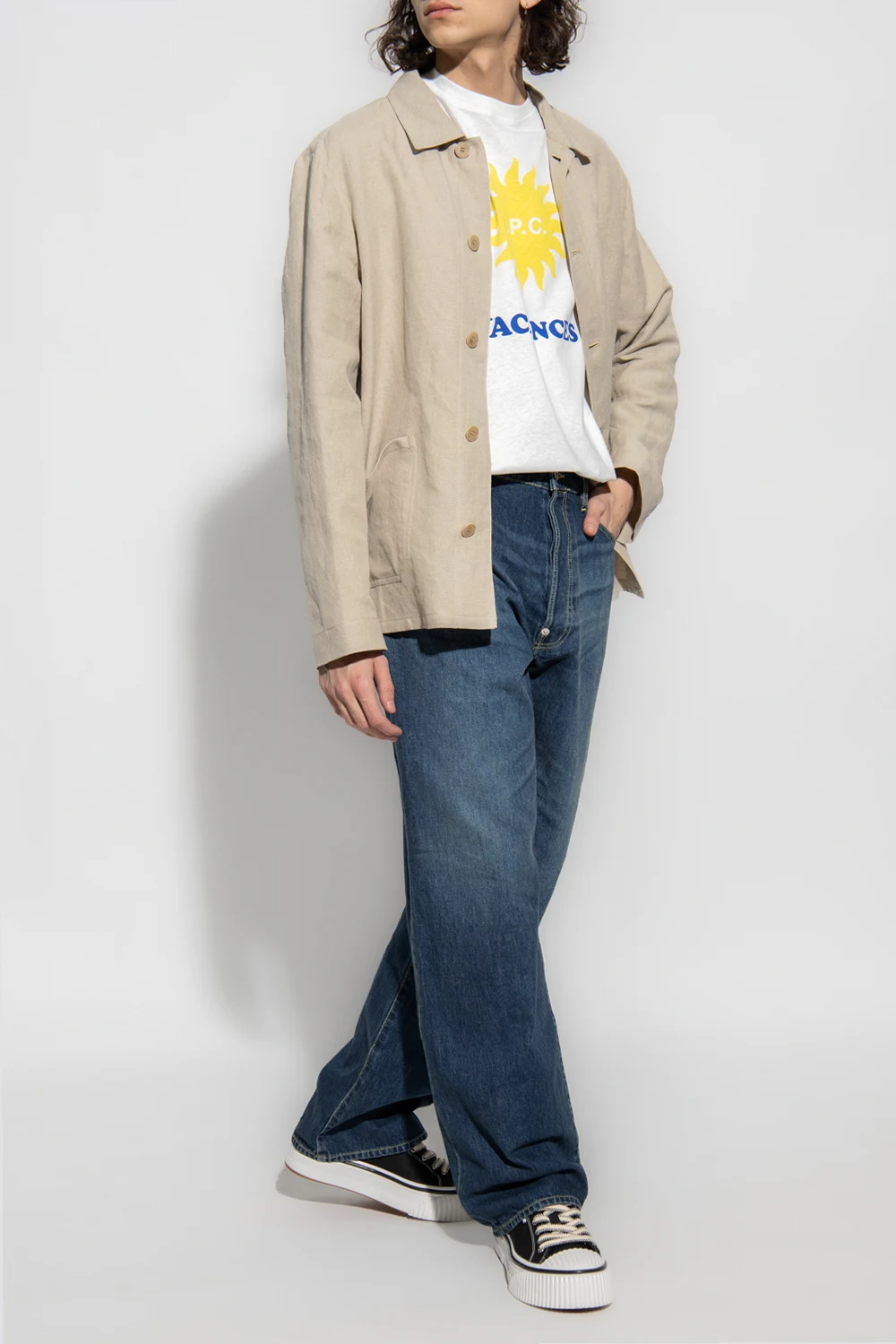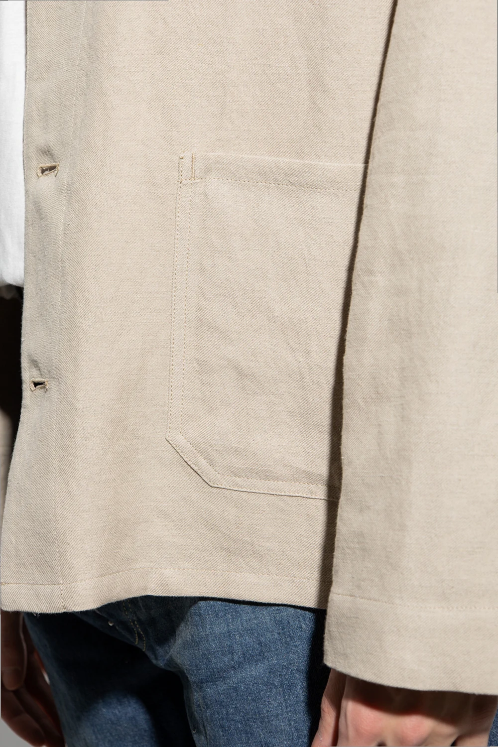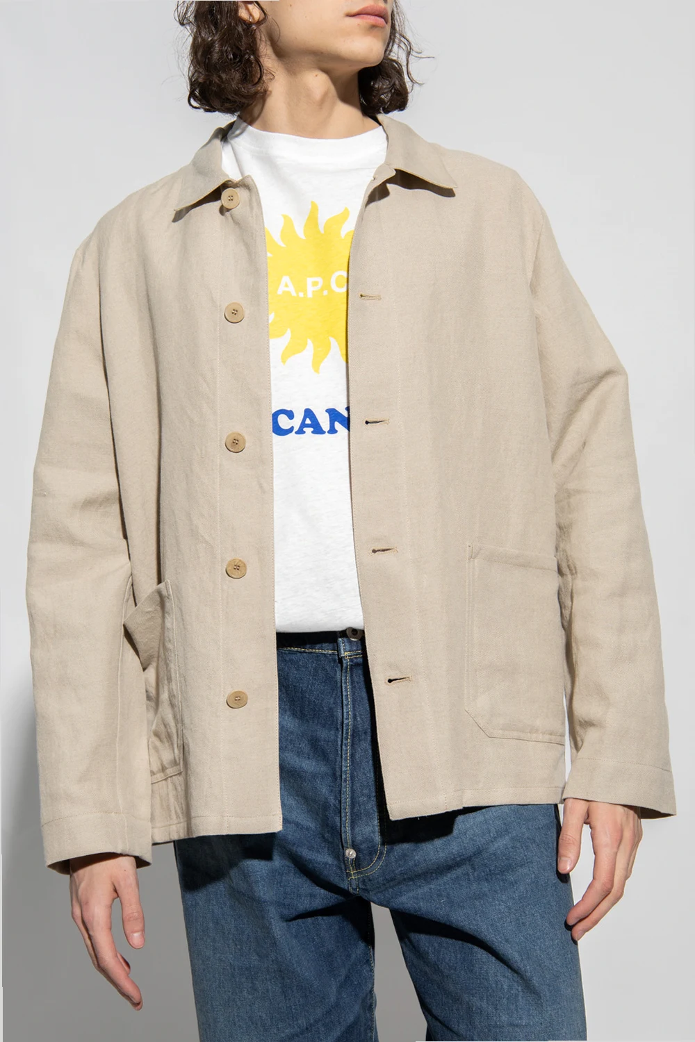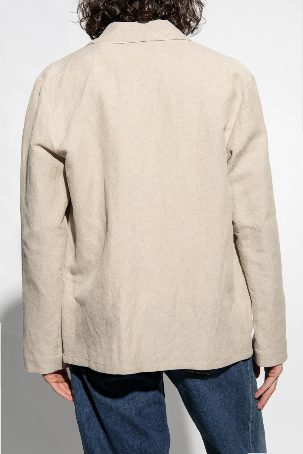 Beige blazer from A.P.C. Crafted from a linen and cotton blend, this style features button fastenings, two slip pockets and long sleeves.