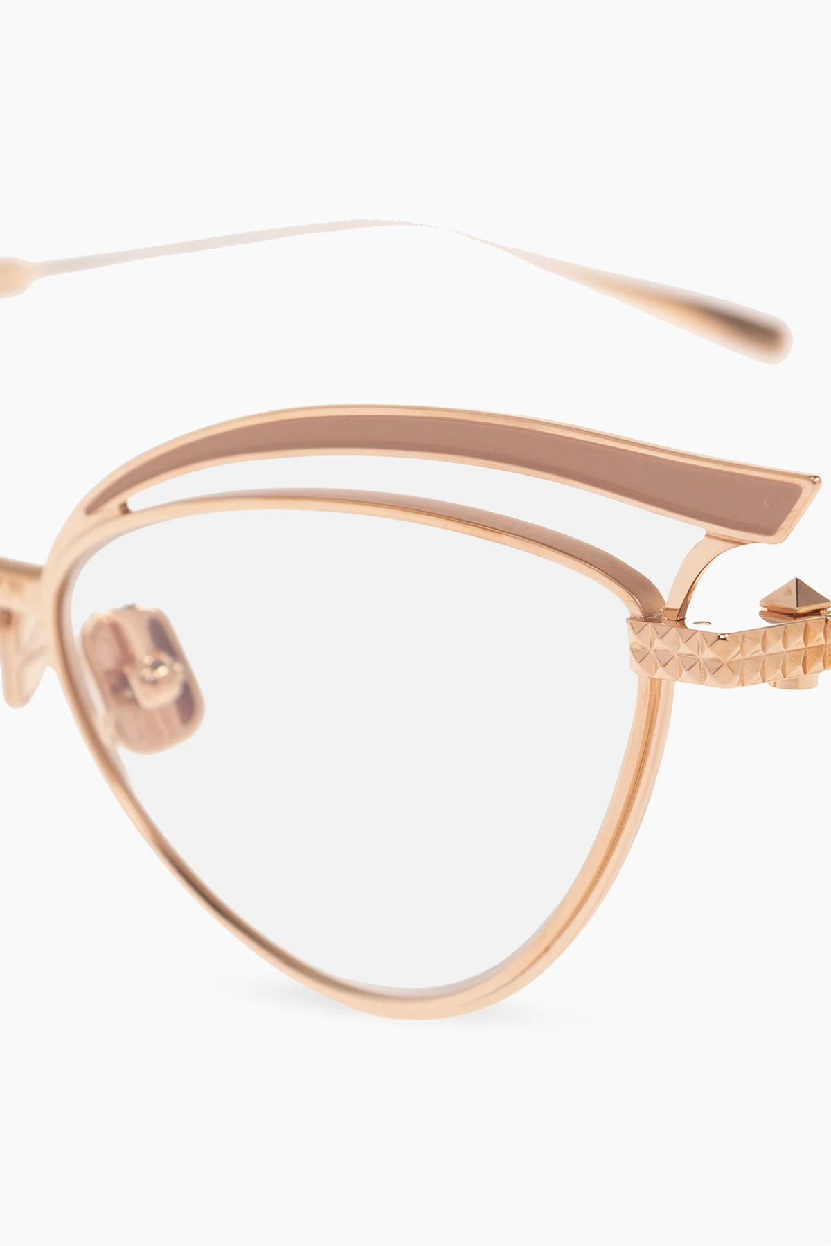 Rose gold-tone optical glasses from Valentino Eyewear. This cat-eye pair features side inserts with a logo and clear lenses. Case included.