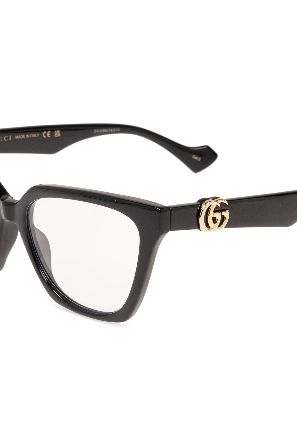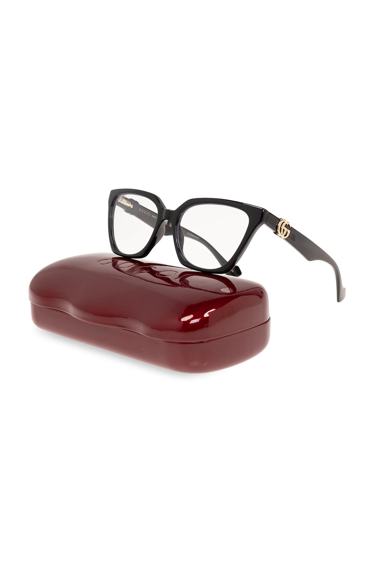 Black optical glasses from Gucci. This model showcases a cat-eye framework, gold-tone logo plaques on the temples, transparent lenses and an attached magnetic sunglasses overlay featuring brown lenses with UV protection. Comes with a case, whose colour is individually selected for each pair of glasses.