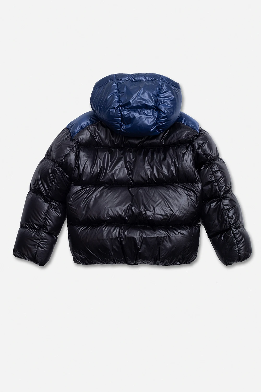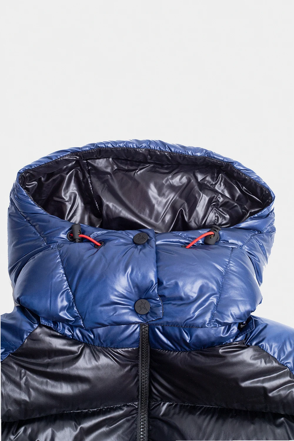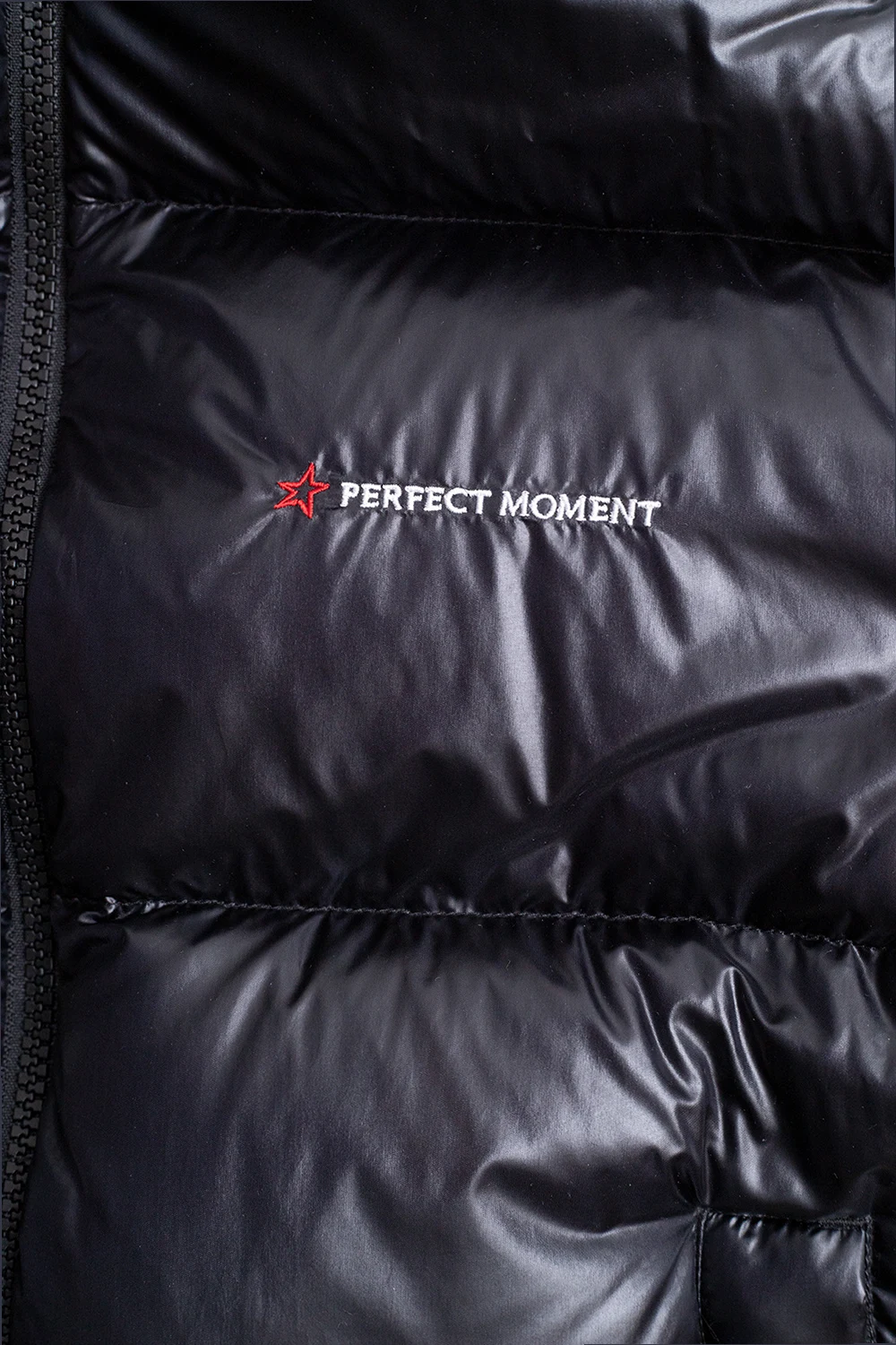 Black and navy blue ski jacket from Perfect Moment Kids. Filled with breathable Allied 700 down, this style features a zip fastening, a detachable drawstring hood, white and red logo embroidery on the front, two zip pockets and an elasticated bottom hem and cuffs. It offers water-repellent properties.
