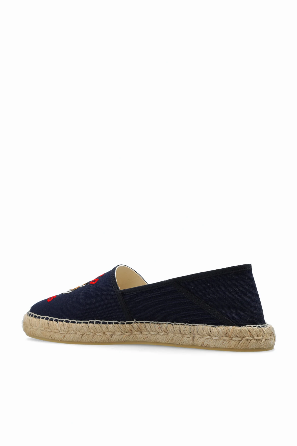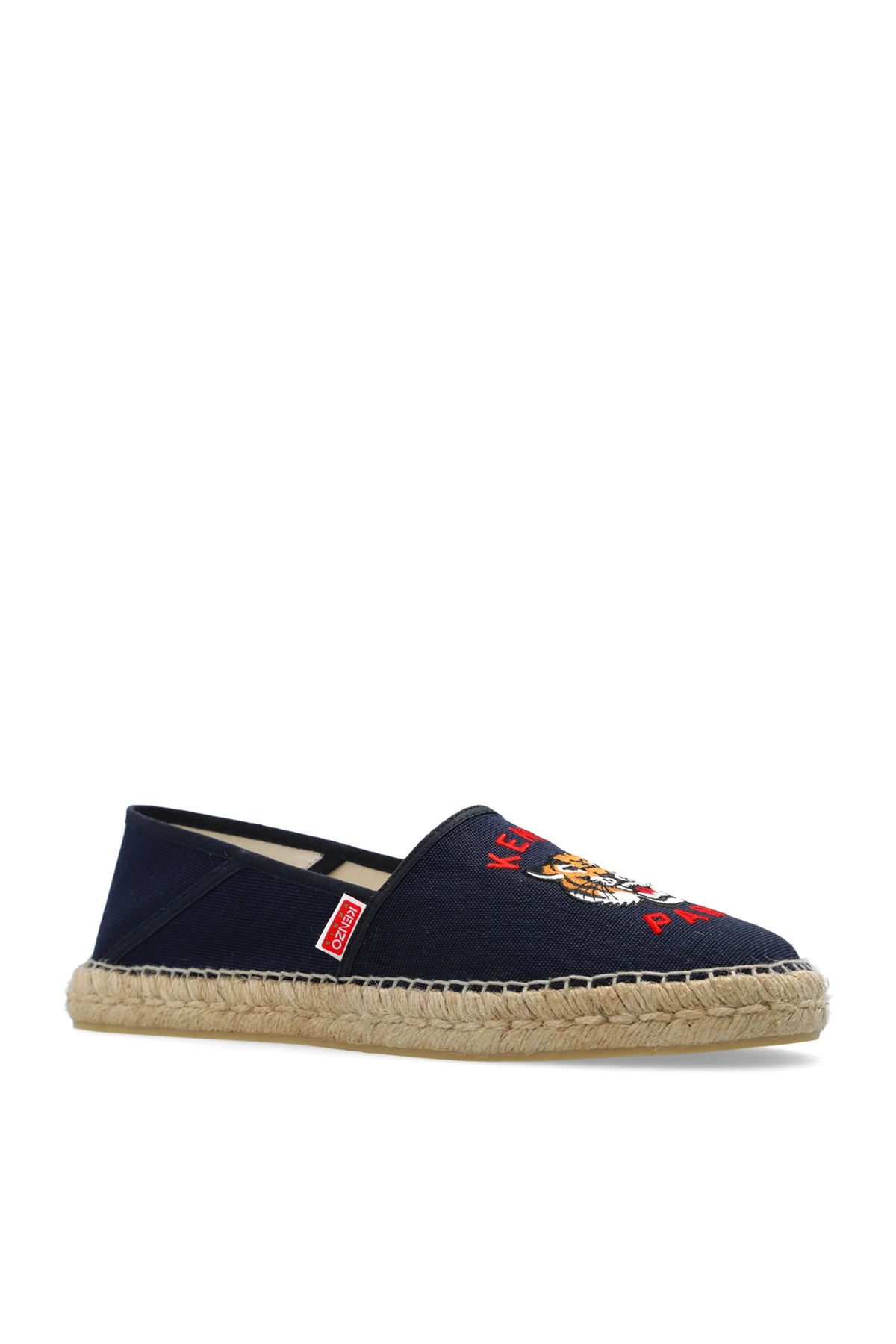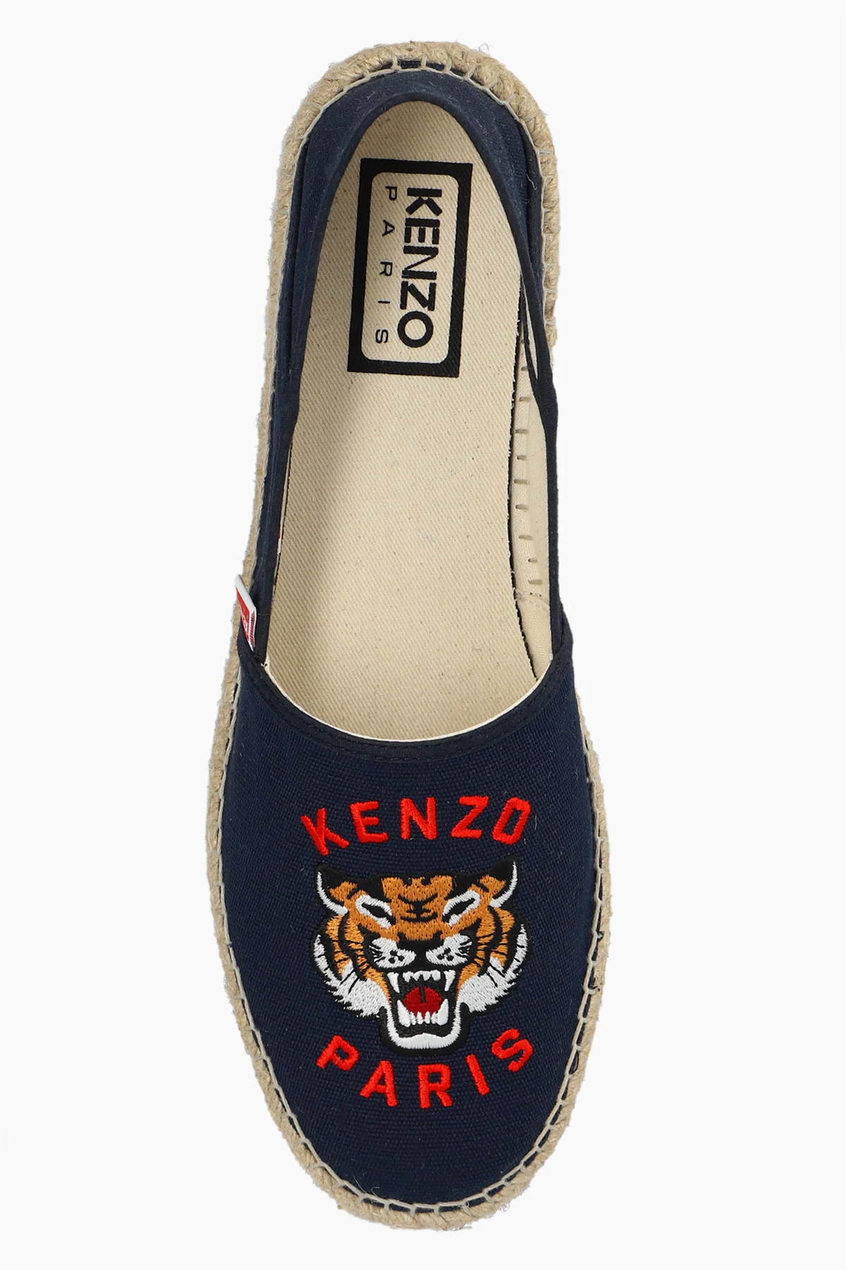 Navy blue espadrilles from Kenzo. Made of fabric, this model sits on a beige rubber sole and showcases graphic embroidery with a motif of animals and the brand\'s logo.