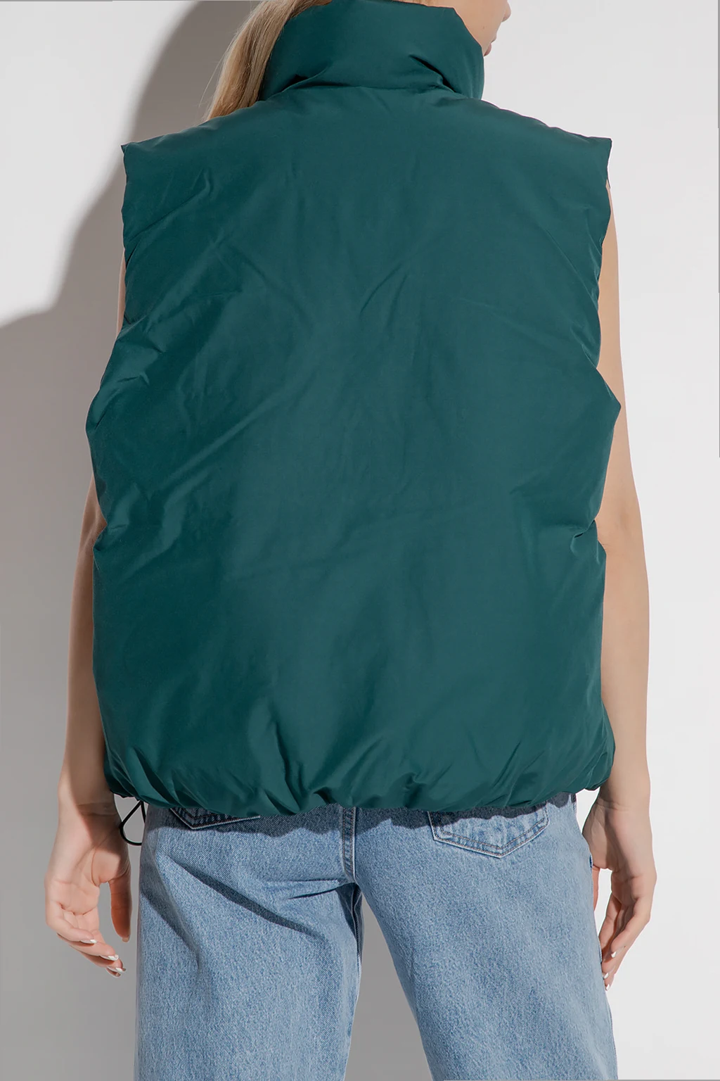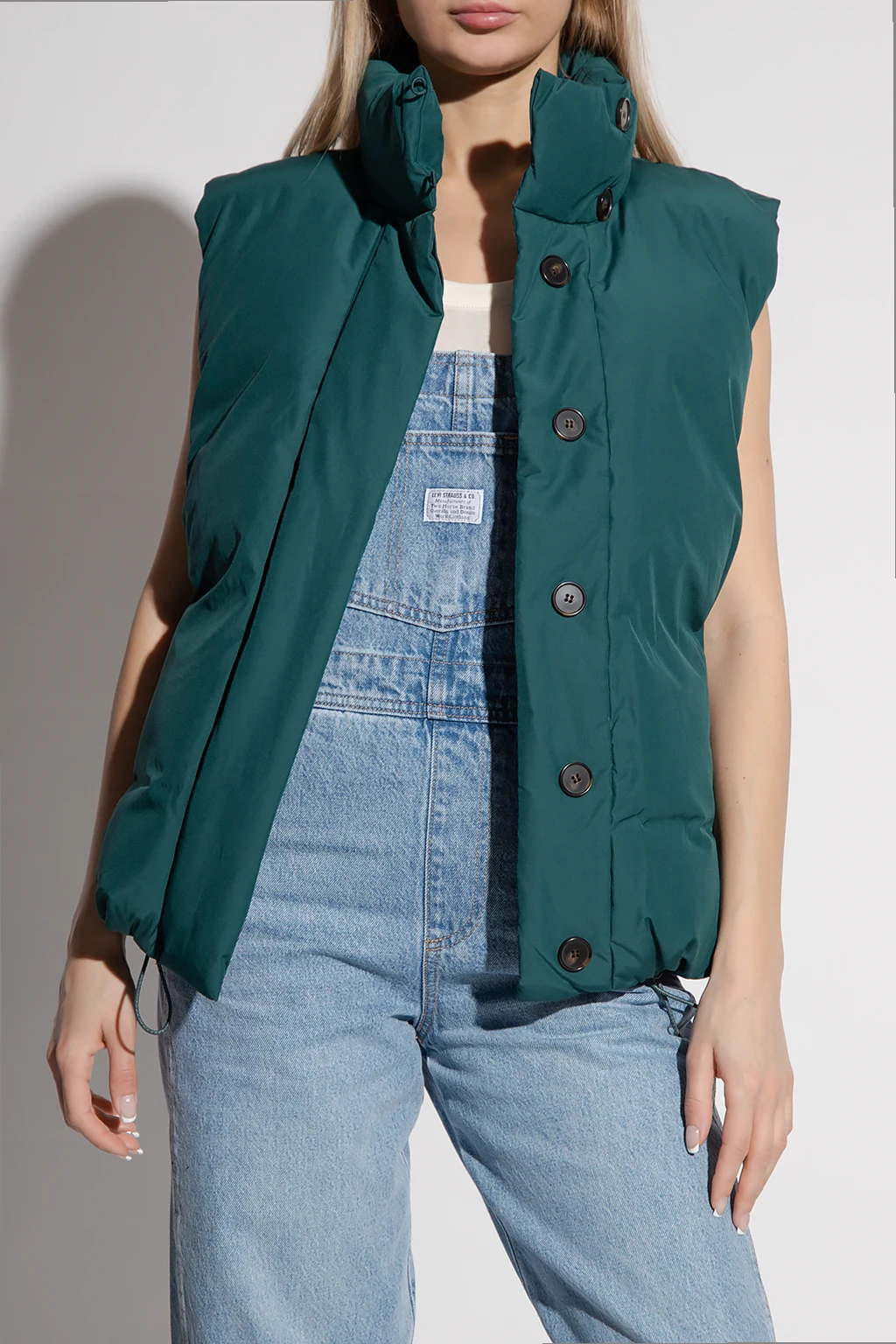 Green vest with a standing collar from Levi’s, the ‘Performance’ collection. Embroidered with a grey logo, this style features snap closures, two pockets with snaps and a drawcord-adjustable hem.