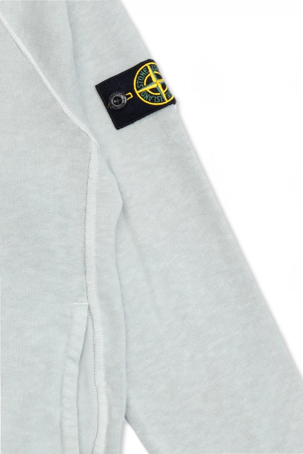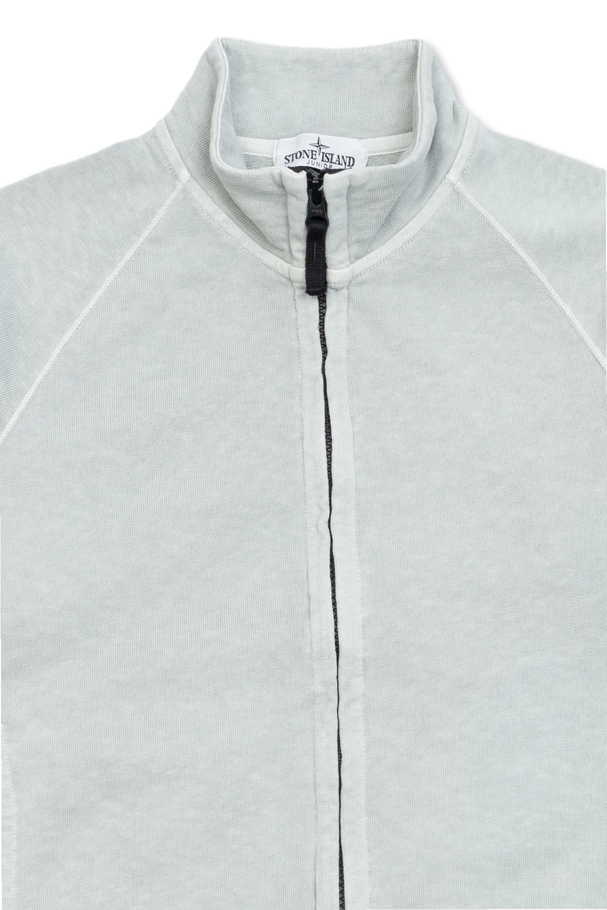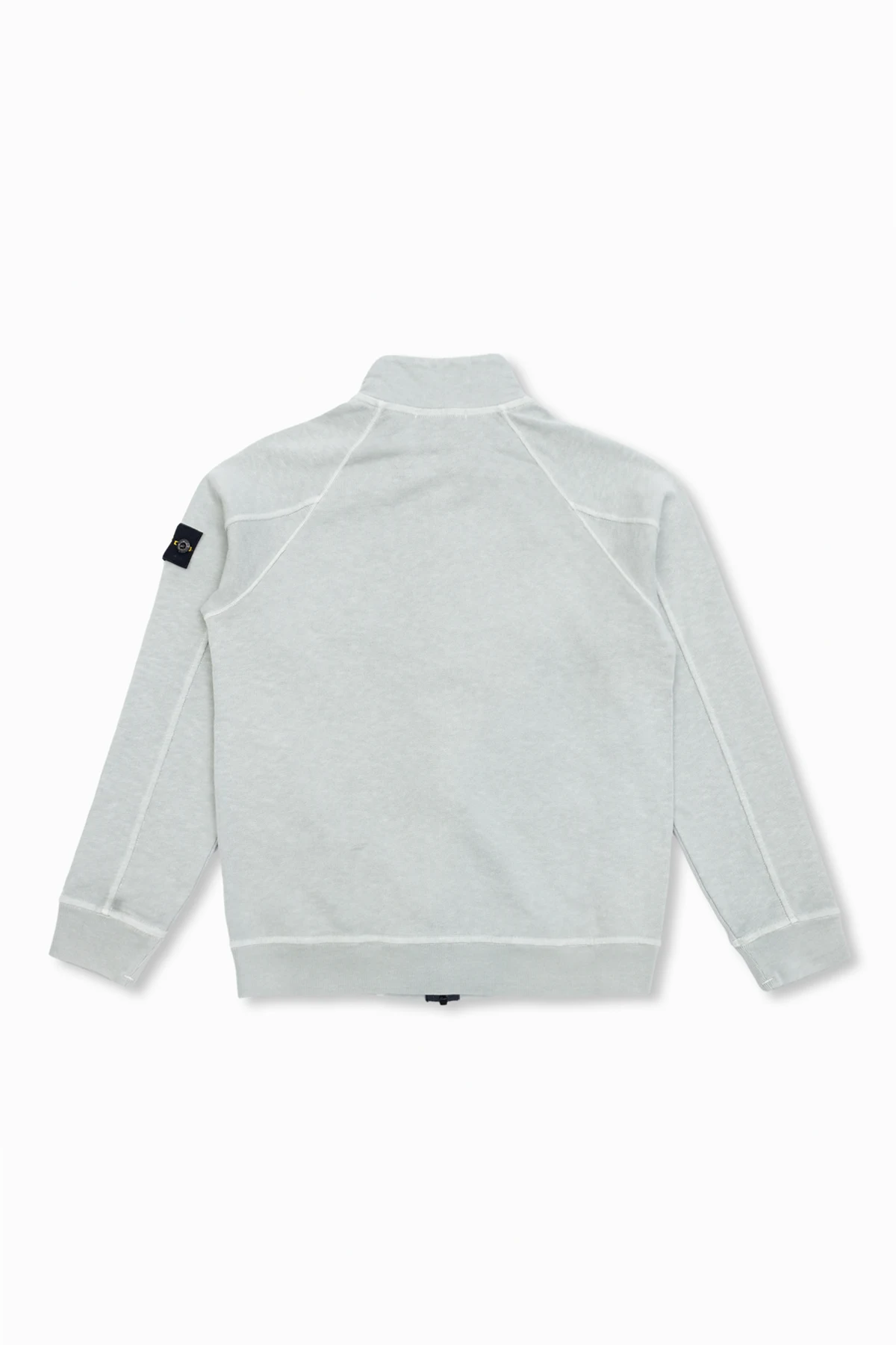 Light grey sweatshirt from Stone Island Kids. Made of cotton. Fastened with a zip, this design features side pockets, a black sleeve patch with a logo in yellow and green as well as ribbed trims at the hem and cuffs.