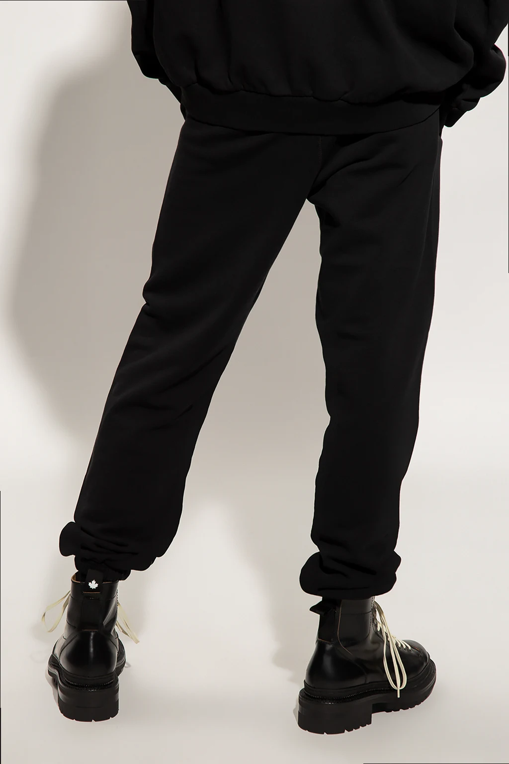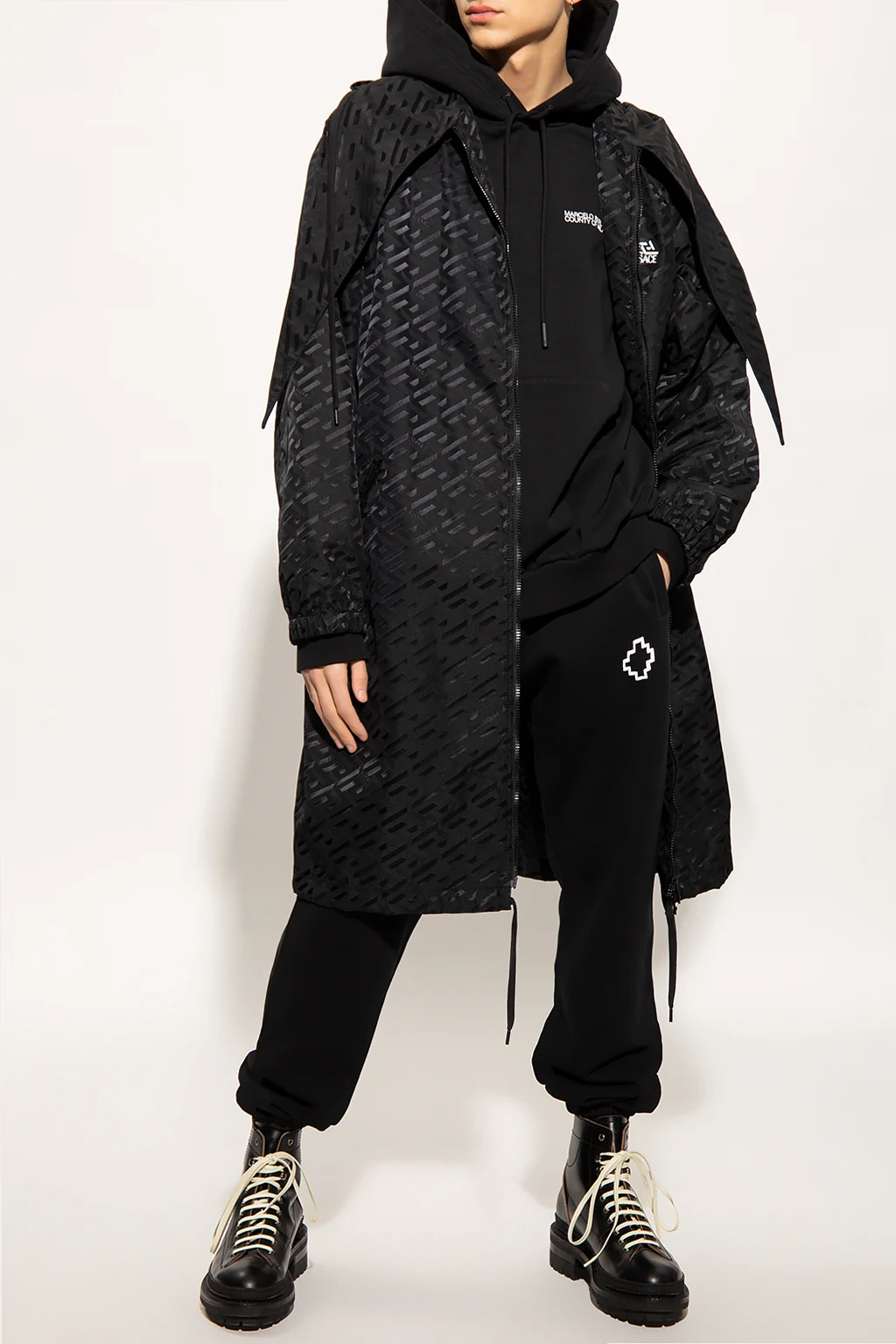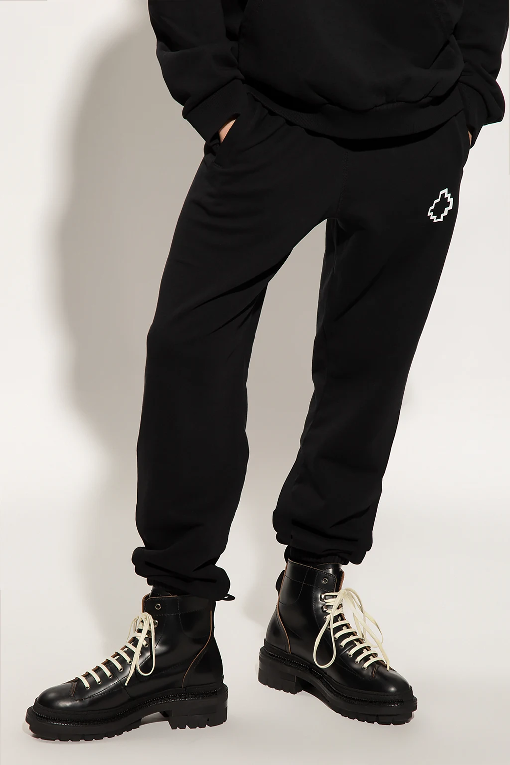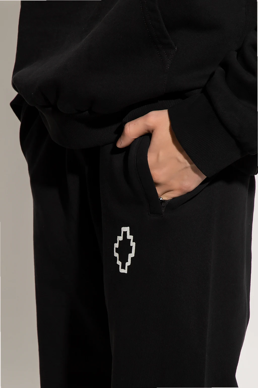 Black sweatpants from Marcelo Burlon. Made of organic cotton, this garment features an elastic waistband with drawstrings, a white logo print, two front zip pockets, snap-fastened back pocket and long sleeves with ribbed cuffs.