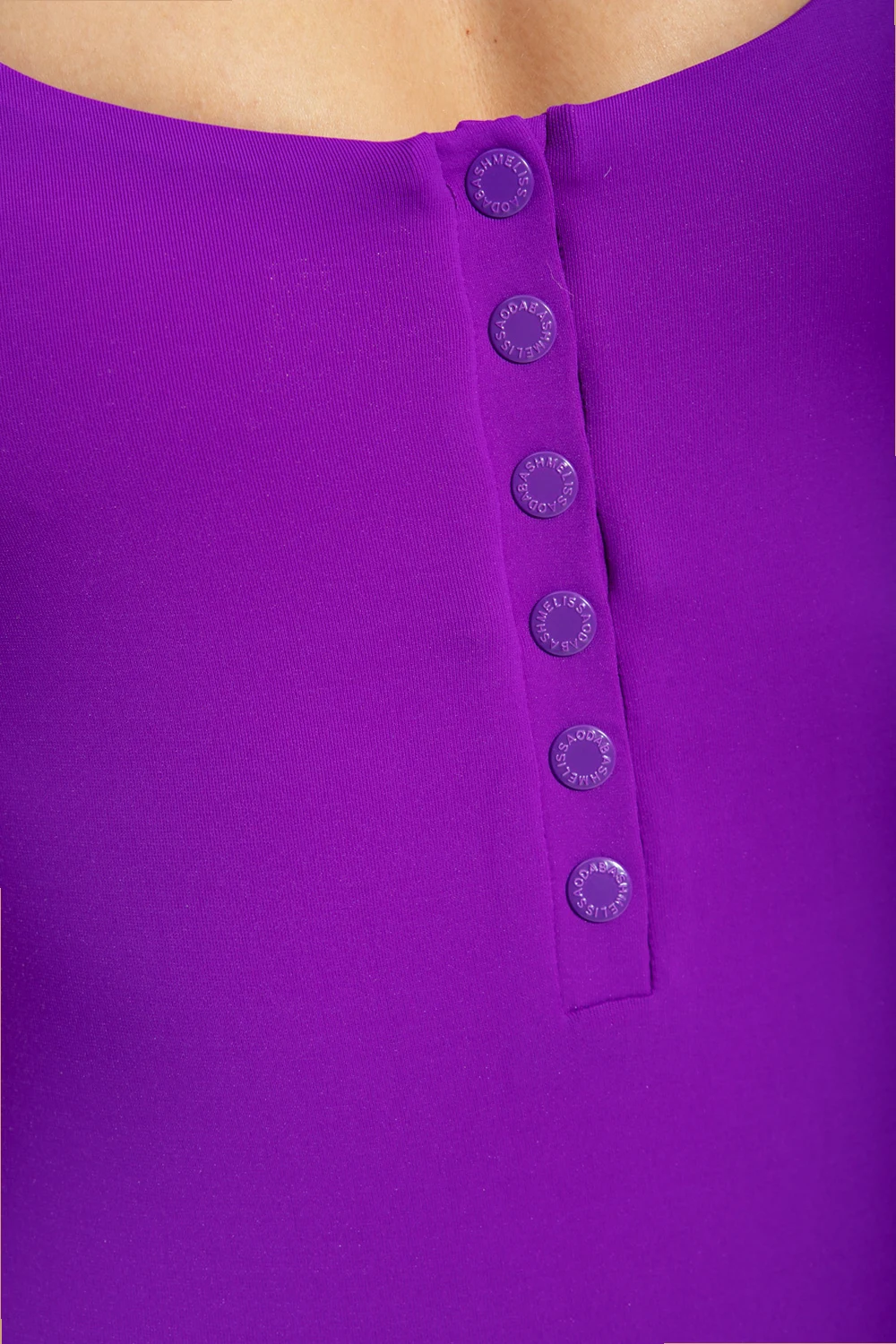 Purple ‘Taormina’ one-piece swimsuit with shoulder straps from Melissa Odabash featuring a round neck with snap closures and cups with removable pads.
