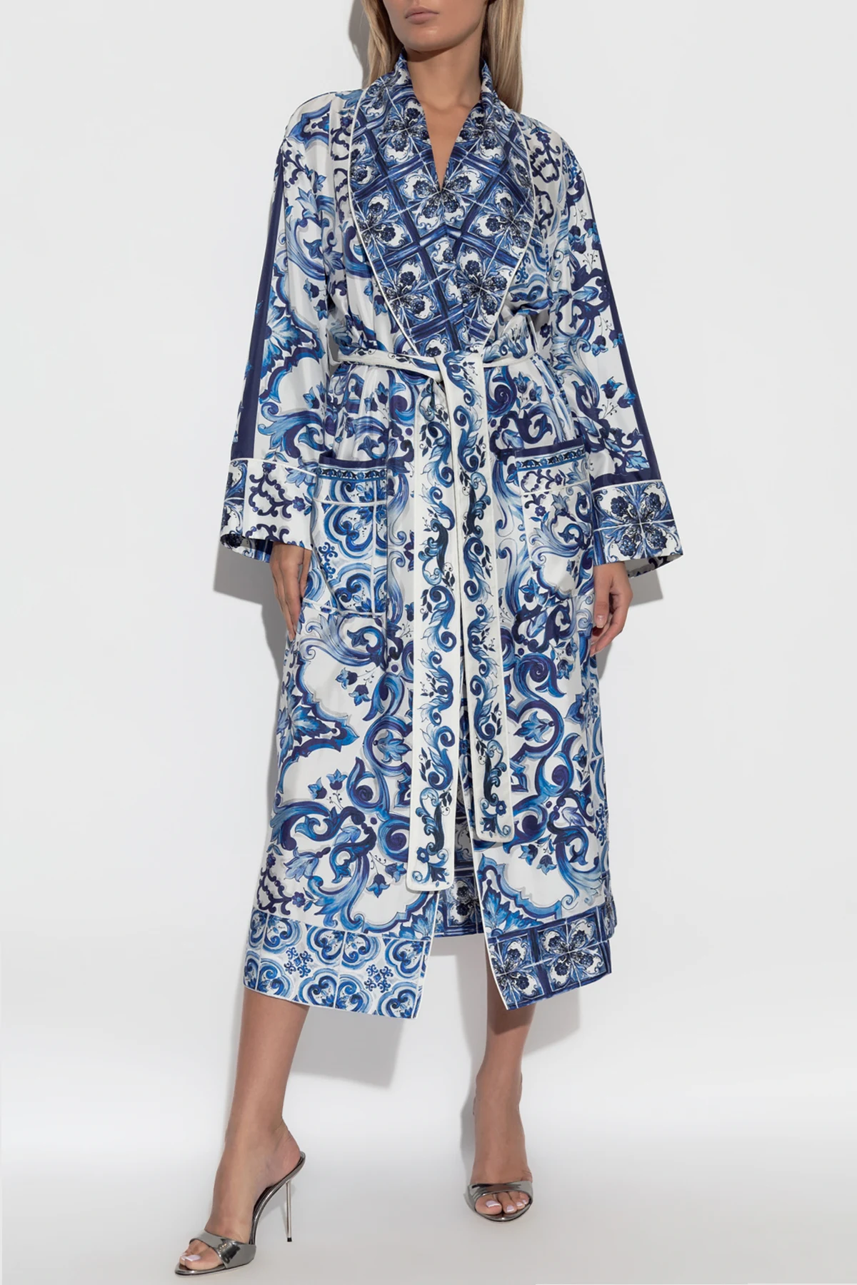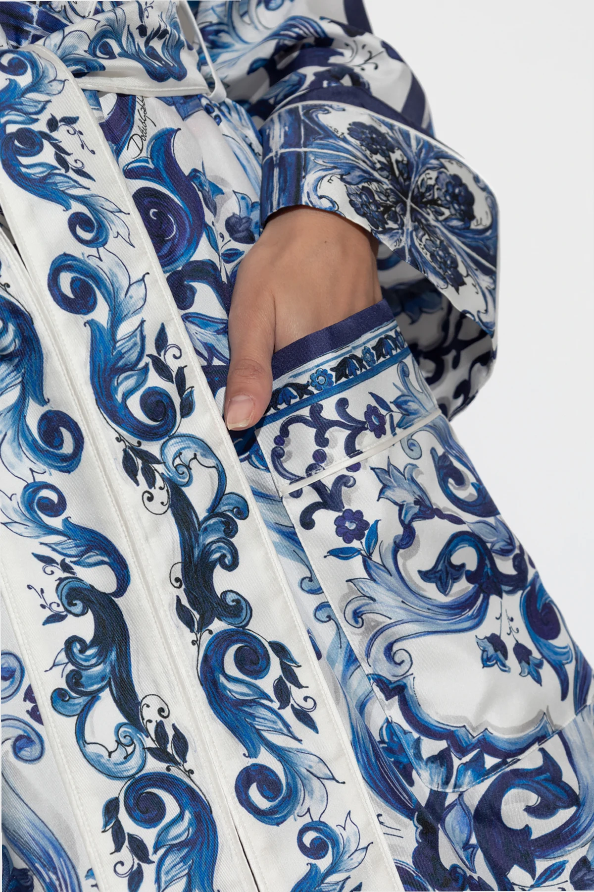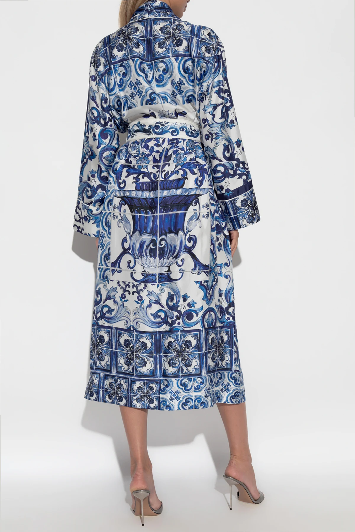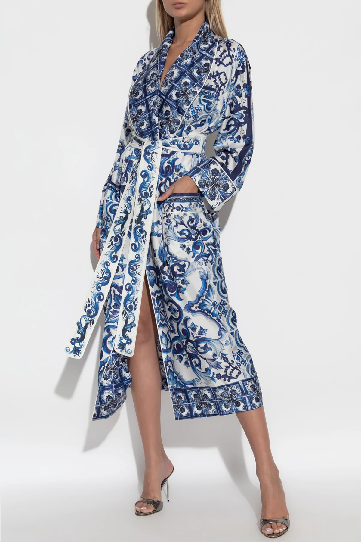 Introducing the Silk Robe, an epitome of refined elegance and luxurious comfort. This exquisite garment, designed by the renowned Dolce & Gabbana, is crafted from the finest silk, ensuring a delicate touch and unparalleled sophistication. The robe features a classic, long silhouette with full-length sleeves, offering a timeless appeal. The rich, decorative pattern in shades of blue and white, reminiscent of intricate mosaics, adds a touch of opulence to this masterpiece. A wide collar and a waist tie belt accentuate its elegant design, while intricate embellishments along the sleeves and the front further highlight its exclusive charm. Functional yet stylish, this robe includes two convenient slip pockets, seamlessly blending practicality with high fashion. The dominant blue and white hues enhance its luxurious aesthetic, making it a perfect addition to any discerning wardrobe. Why Choose This Product? Designed by the iconic Dolce & Gabbana, a symbol of unparalleled elegance. Crafted from 100% silk, offering a soft, luxurious feel. Rich decorative pattern adds a unique, sophisticated touch. Includes practical slip pockets for added convenience. Perfect for those who appreciate luxury and refined style.