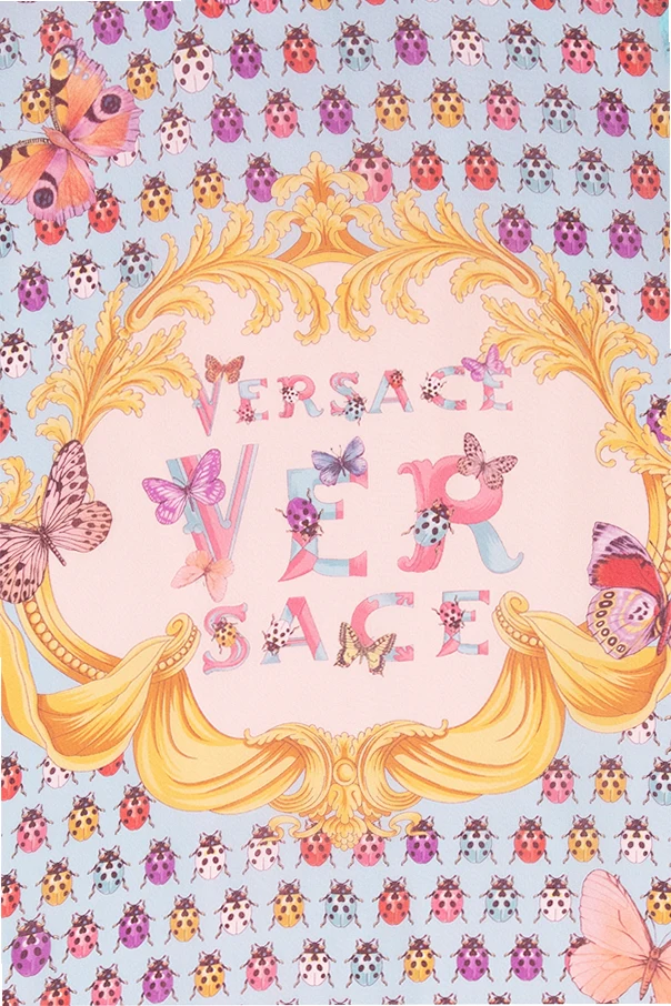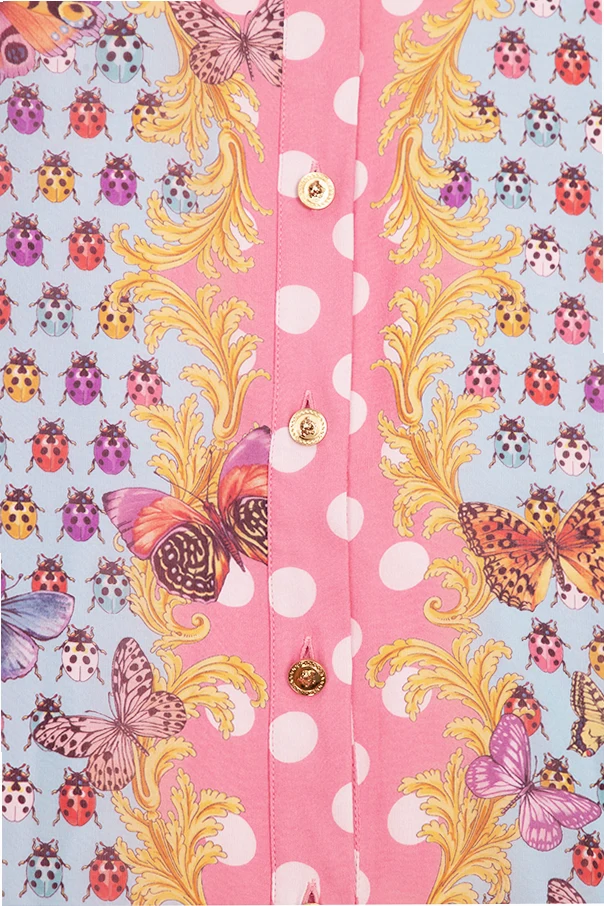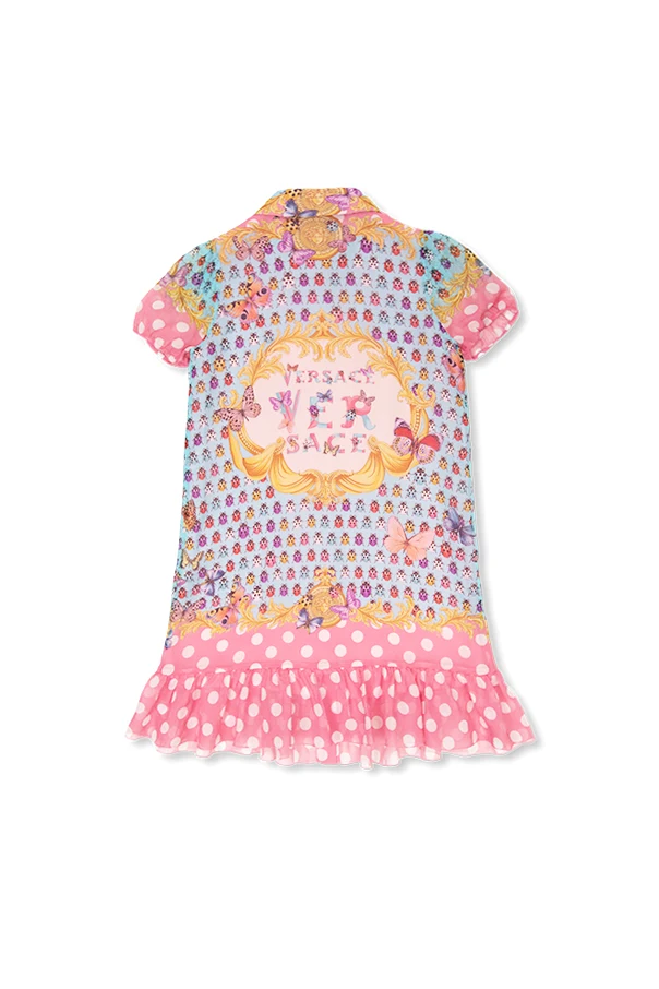 Multicoloured dress from Versace Kids, the ‘La Vacanza’ collection. Made of silk, this style showcases the brand\'s ‘Heritage Butterflies & Ladybugs’ print. It is complete with a collared neckline, button fastenings, short sleeves and a ruffled hem.