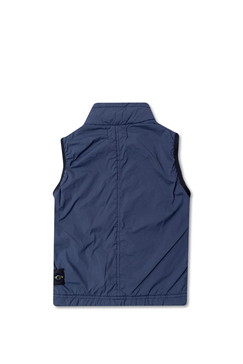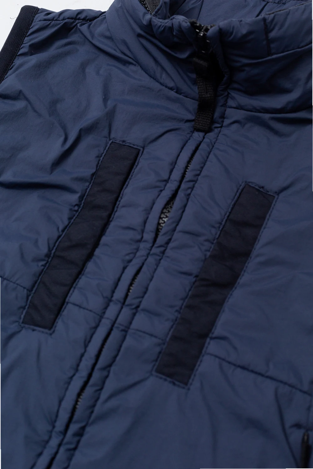 Navy blue vest from Stone Island Kids. Crafted from non-translucent, super stretch nylon padded in Polartec® Alpha® - a gauzed run-proof polyester substrate, ultra-breathable and extremely reactive to changing temperatures. It features a zip fastening, a hood concealed in the collar, two snap-fastened pockets, two zipped pockets and a detachable logo patch on the side.