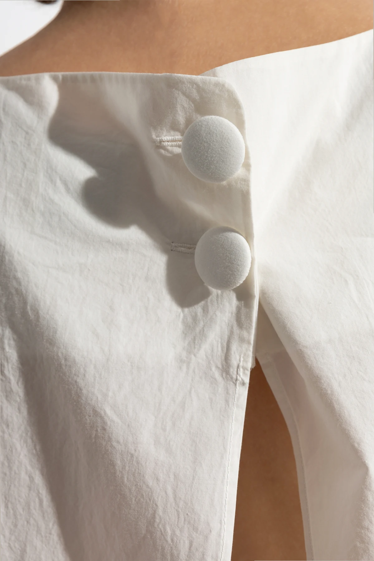 Introducing the Lucas top, an exquisite piece from the exclusive collection by POSSE. Crafted with meticulous attention to detail, this top epitomizes a blend of simplicity and sophistication. Designed by the renowned Australian brand founded by Danielle Mulham, the Lucas top is a testament to timeless elegance and modern refinement. Constructed from 100% premium cotton, this top features a lightweight and airy feel, ideal for warmer days. The asymmetrical, loose fit offers a contemporary and avant-garde silhouette, with a shorter front and an elongated back creating a cascading effect. The pristine white hue accentuates its minimalist and elegant character. Distinctive details include a stylish back slit for enhanced comfort and two large, round buttons covered in the same fabric, adding a subtle yet sophisticated decorative touch. The sleeveless design makes it a versatile piece, perfect for pairing with various ensembles. Why Choose This Product? Exclusively designed by POSSE, a brand known for chic and feminine apparel. Made from natural, high-quality cotton for unbeatable comfort and breathability. Asymmetrical design with a cascading effect for a unique and modern look. Elegant back slit and fabric-covered buttons for added sophistication. Versatile white color, perfect for creating various stylish outfits. Epitomizes sustainable and ethical fashion practices.
