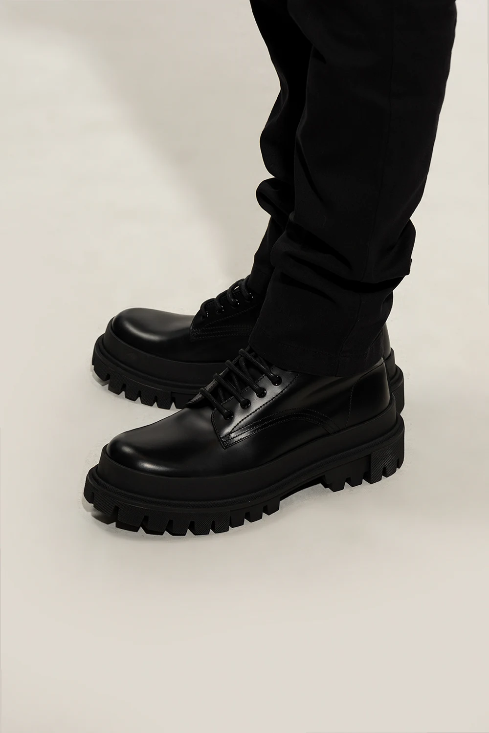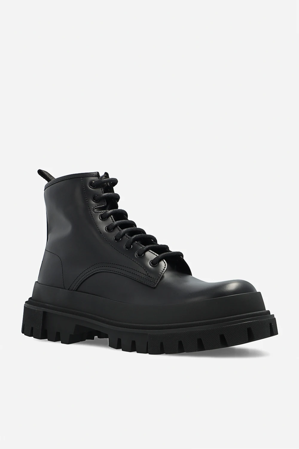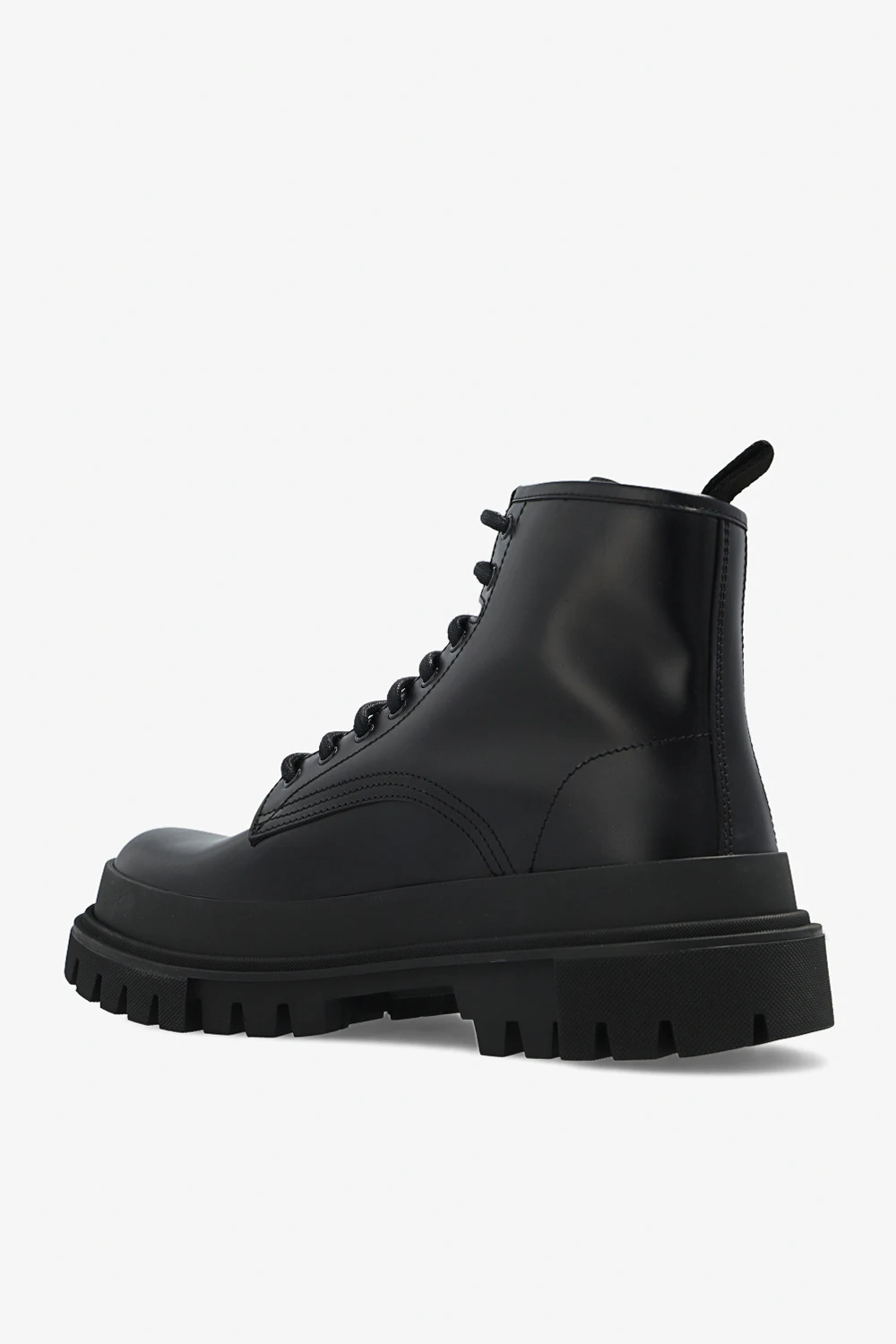 Black combat boots from Dolce & Gabbana. Made of leather, this lace-up pair features a metal logo-engraved appliqué and black rubber sole.