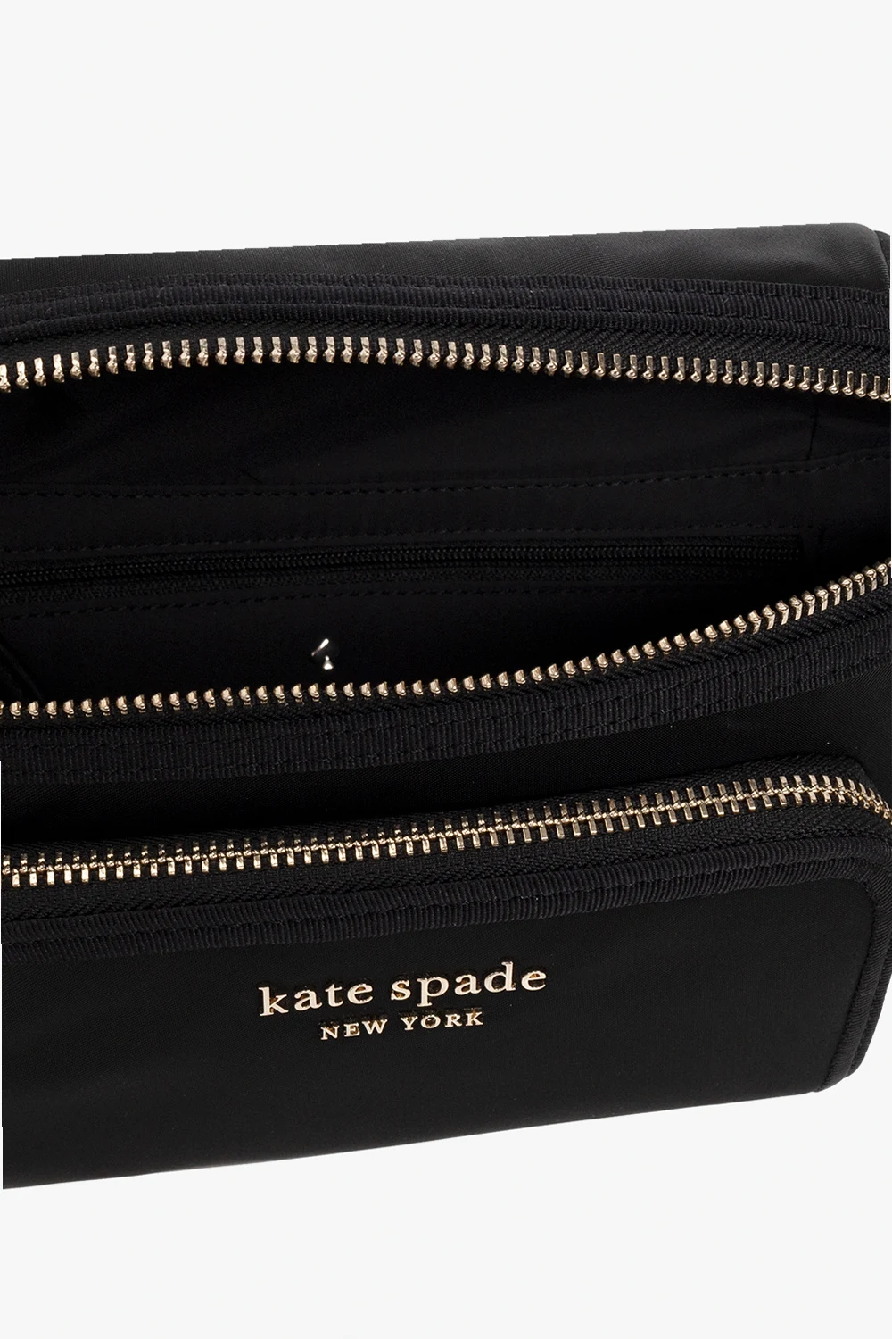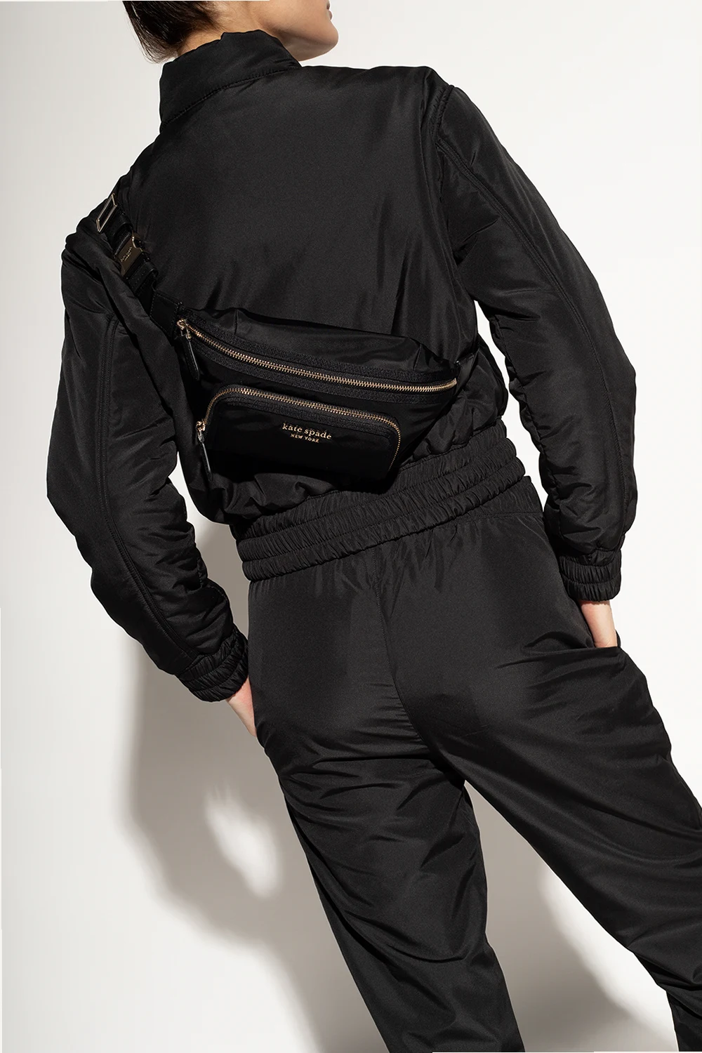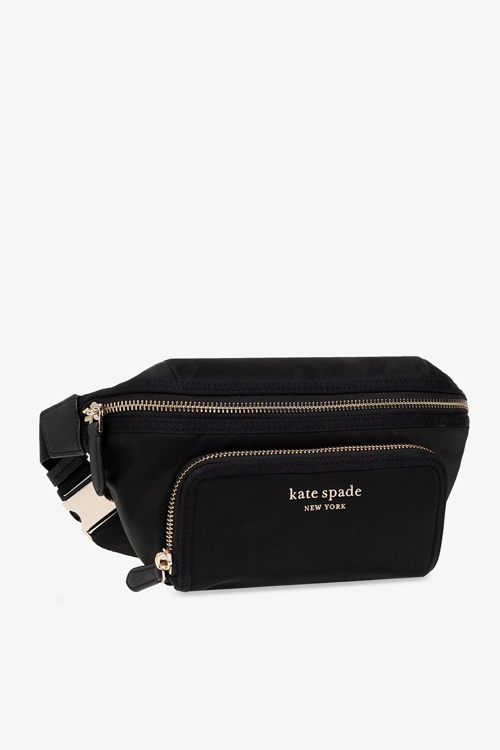 Black ‘The Little Better Sam’ belt bag from Kate Spade. Produced in part from recycled materials, this model features a front zip pocket, metal logo appliqué, adjustable shoulder strap with a buckle, light gold-tone metal hardware and one internal compartment with one zip pocket.