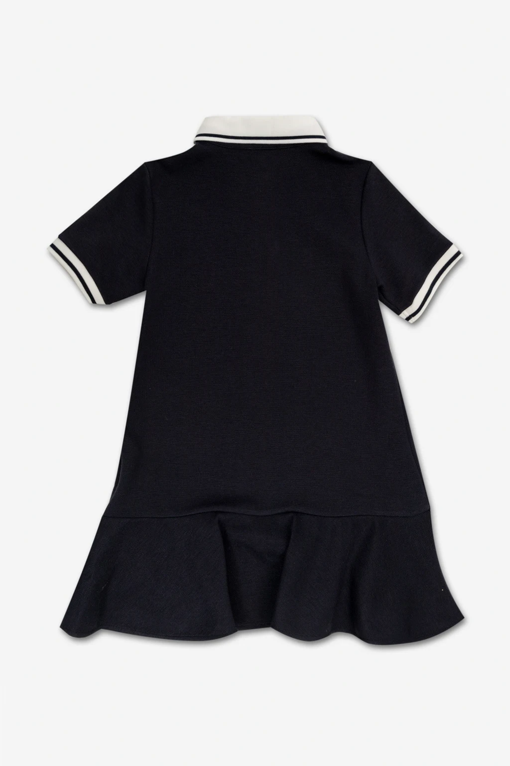 Navy dress from Dolce & Gabbana Kids. This design features a white collar with buttons, this design features a white logo embroidery, short sleeves with ribbed cuffs and flared skirt with a ruffle.