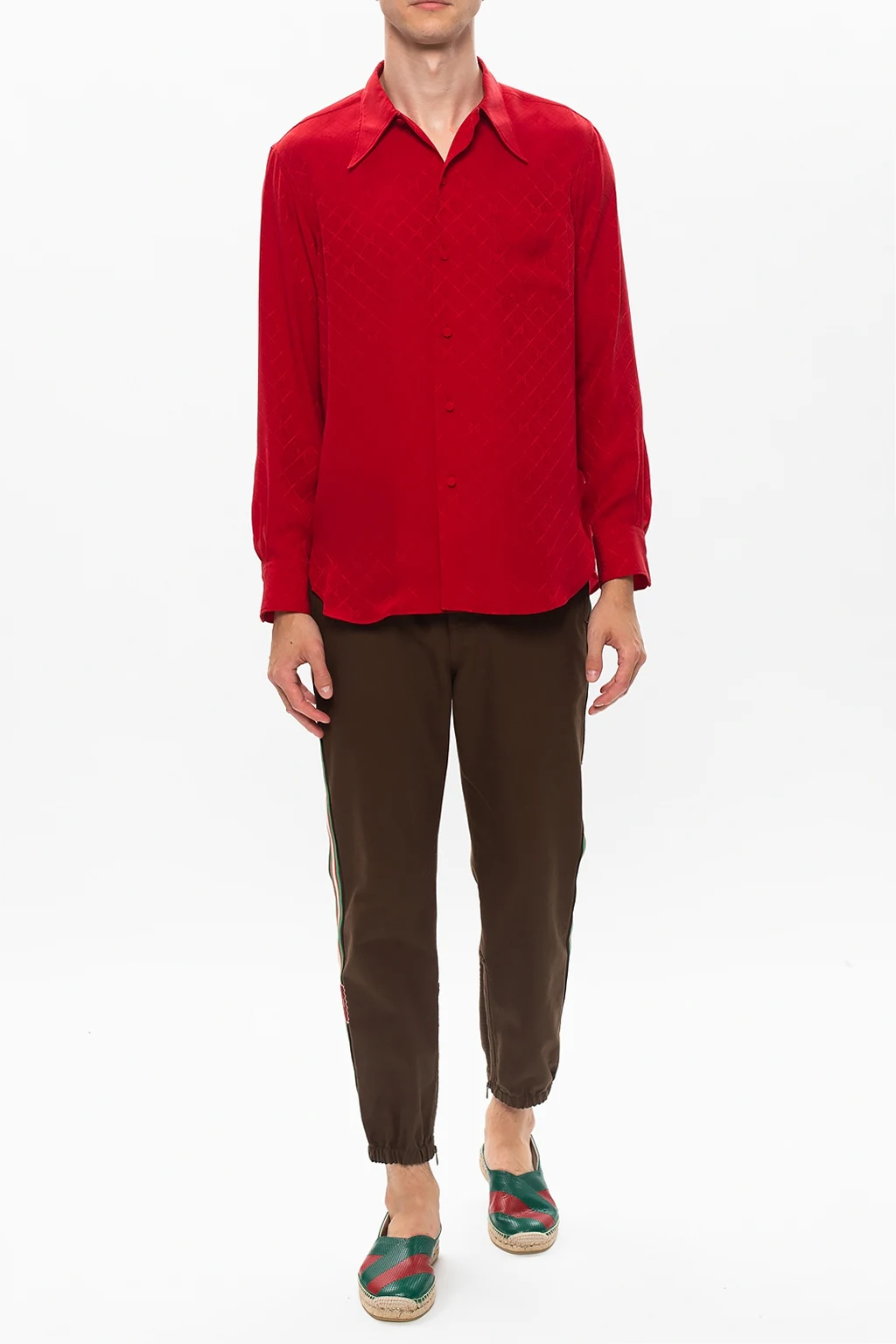 Green and red ‘Malaga Kid’ espadrilles from Gucci. Crafted from leather, this pair features a decorative stripe pattern and white rubber sole with woven details.