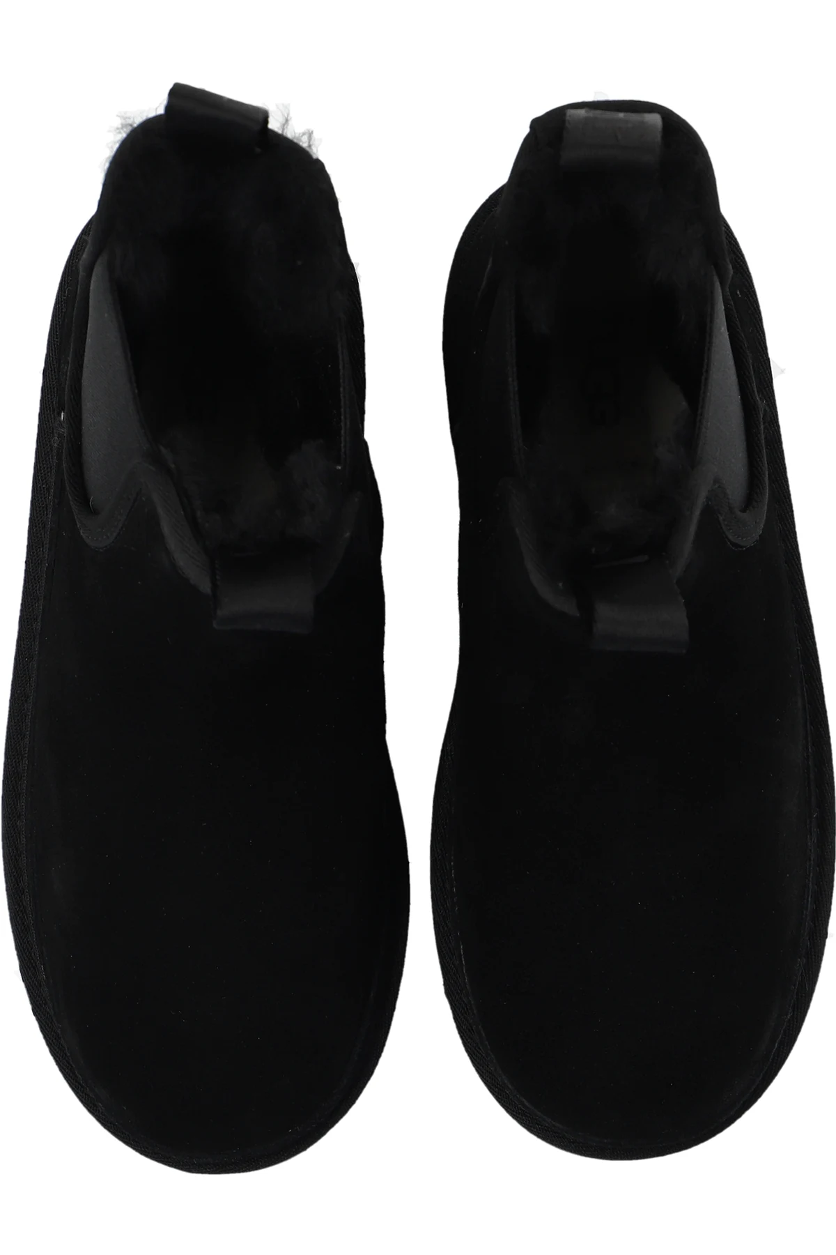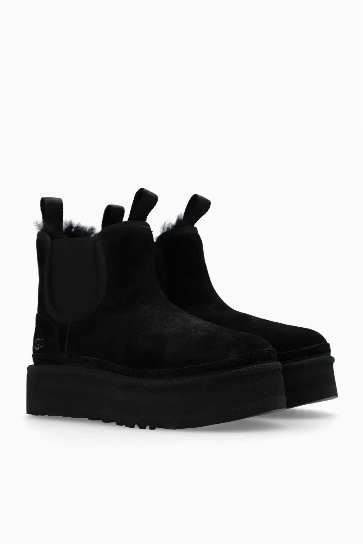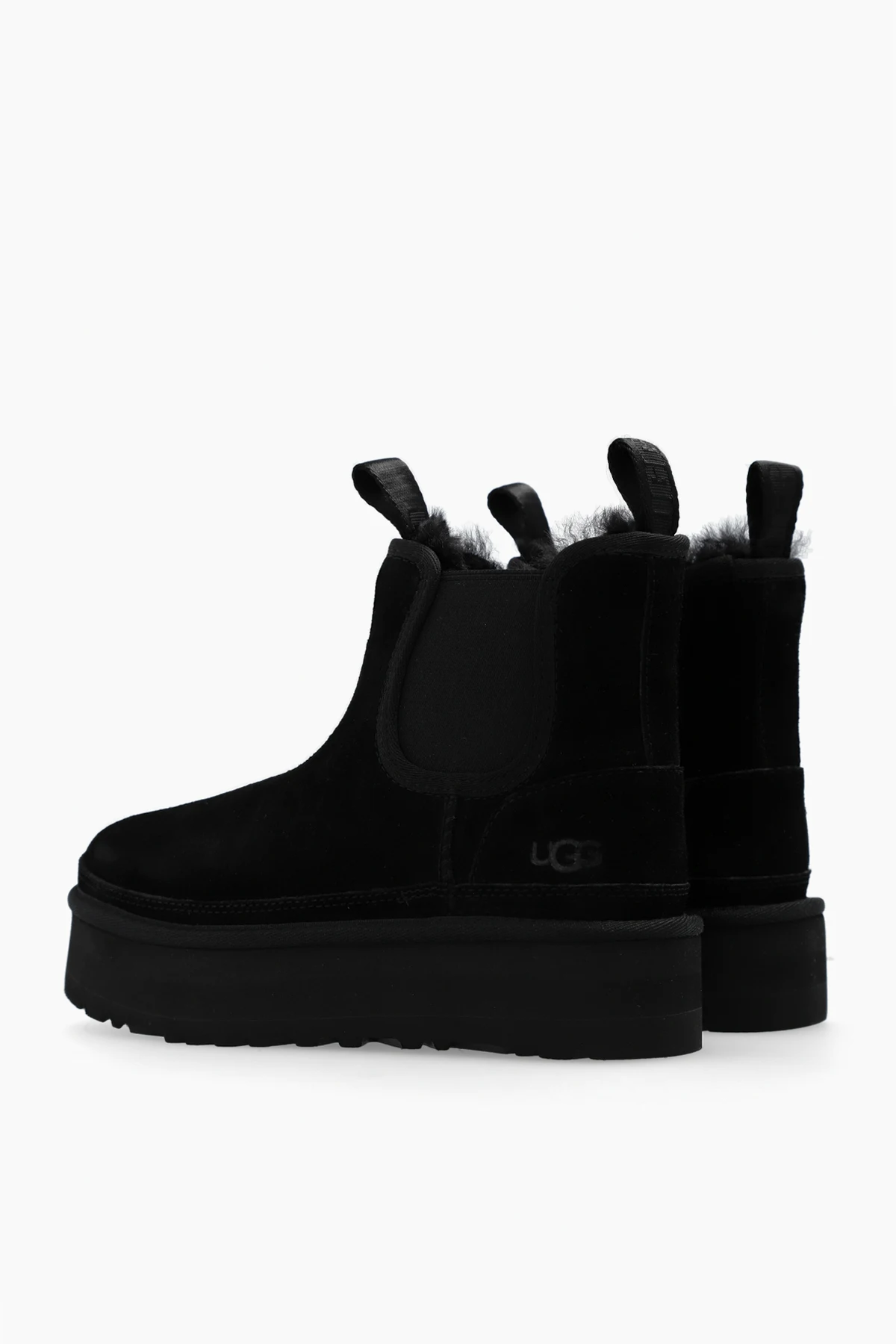 Black ‘K Neumel Platform’ snow boots from UGG Kids. Crafted from suede, this slip-on pair features elastic side panels, embossed logo, UGGplush™ lining made from wool and recycled materials and pink rubber Treadline by UGG™ outsole.
