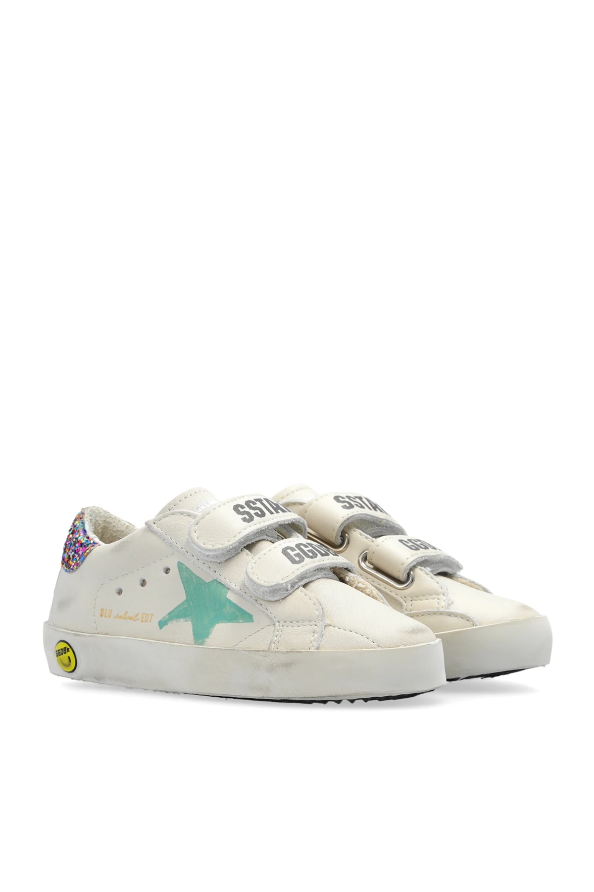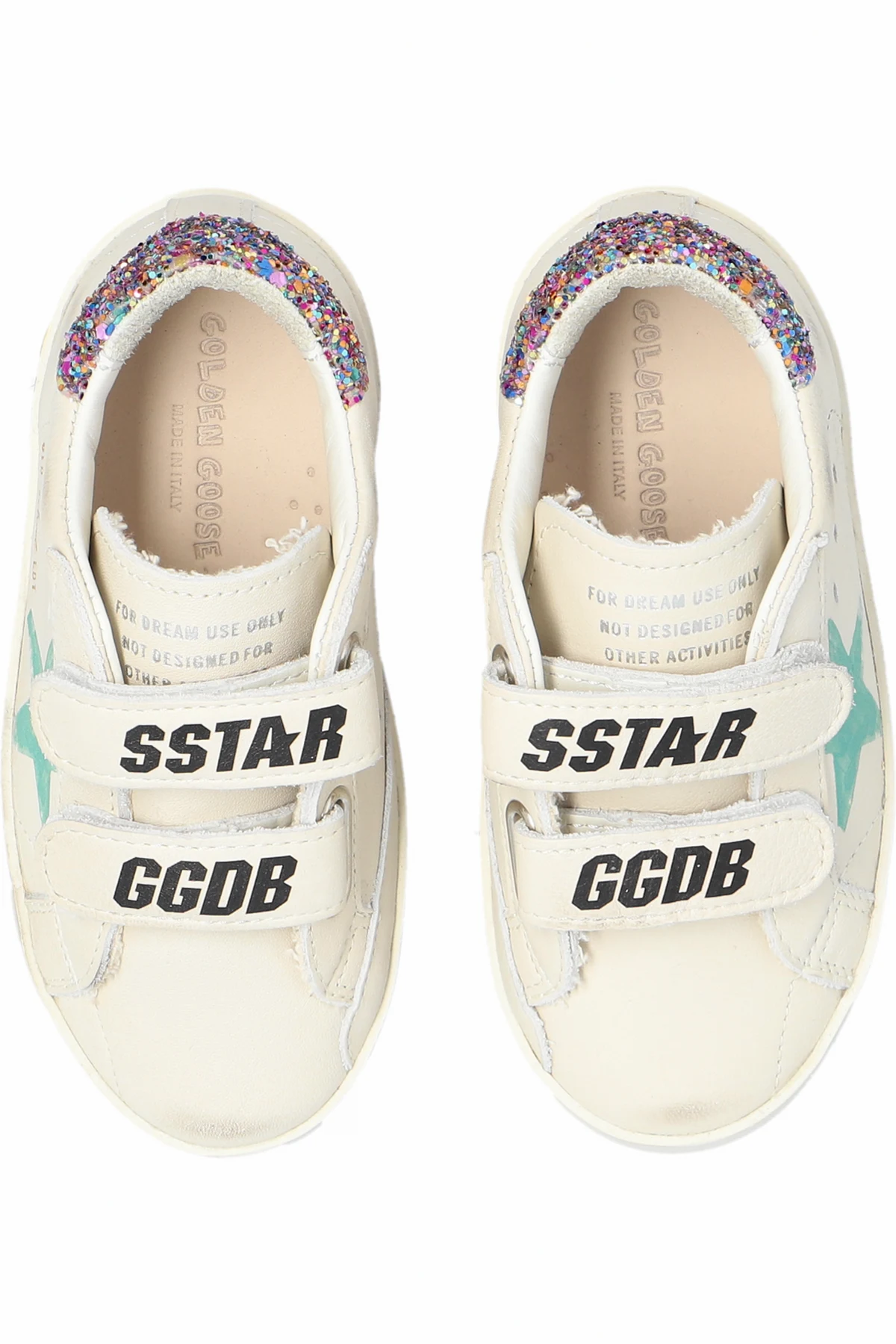 Introducing the Old School Witm Print Star sports shoes from the exclusive Golden Goose Kids collection. These children\'s sneakers exude elegance while providing unparalleled comfort and style. The classic shape of these shoes is accentuated by a distinctive large green star on the side. The upper is crafted from premium ivory-toned material, beautifully contrasted by a multicolored glittery heel. The shoes feature two black Velcro straps with the inscriptions \"SSTAR\" and \"GGDB,\" ensuring a secure and adjustable fit. Further enhancing their charm, the shoes display the golden \"OLD SCHOOL EDT\" inscription on the side and a yellow circular logo with a black pattern on the heel sole. Inside, the shoes are lined with soft leather, promising a plush and comfortable experience. The flat white rubber sole offers excellent grip, making them perfect for any adventure. Golden Goose, a renowned Italian luxury brand, seamlessly blends traditional craftsmanship with an iconic star motif and a unique distressed finish. Their designs are inspired by global experiences and memories, blending urban style with vintage accents. Why choose these shoes? High-Quality Materials: Expertly crafted with a leather exterior and interior. Unique Design: Features a large green star and multicolored glittery heel. Comfort: Soft leather lining and secure Velcro straps. Durability: Robust rubber sole ensures excellent grip. Exclusive Brand: From the prestigious Golden Goose Kids collection.
