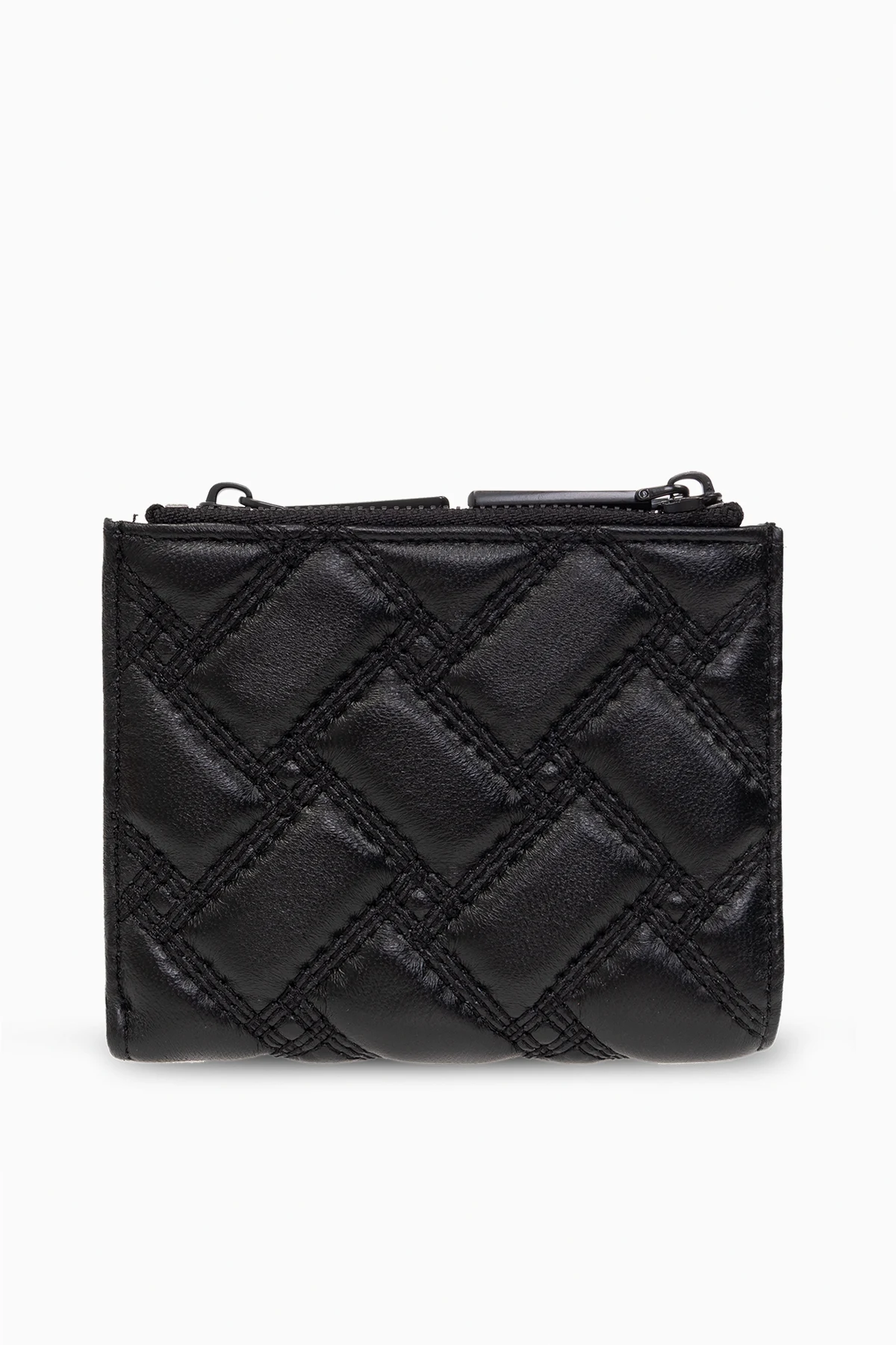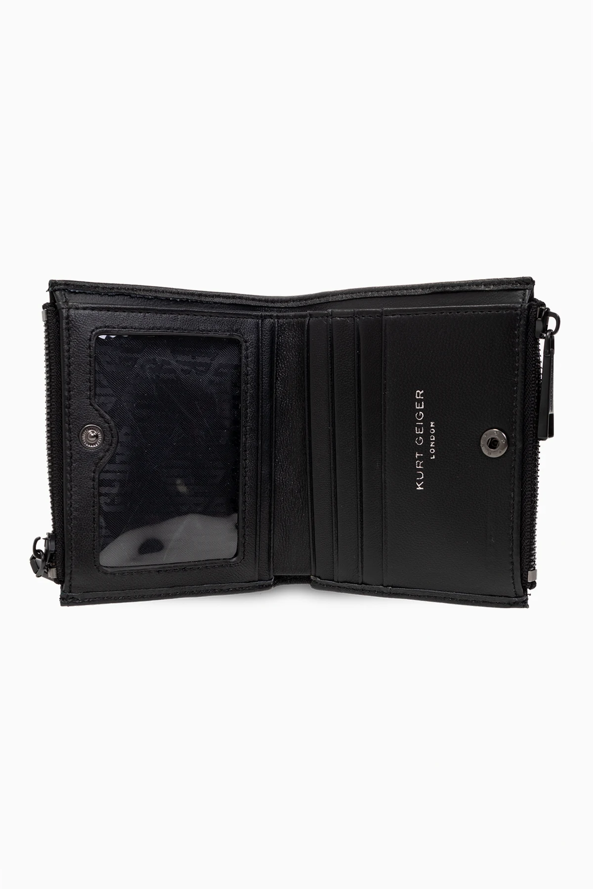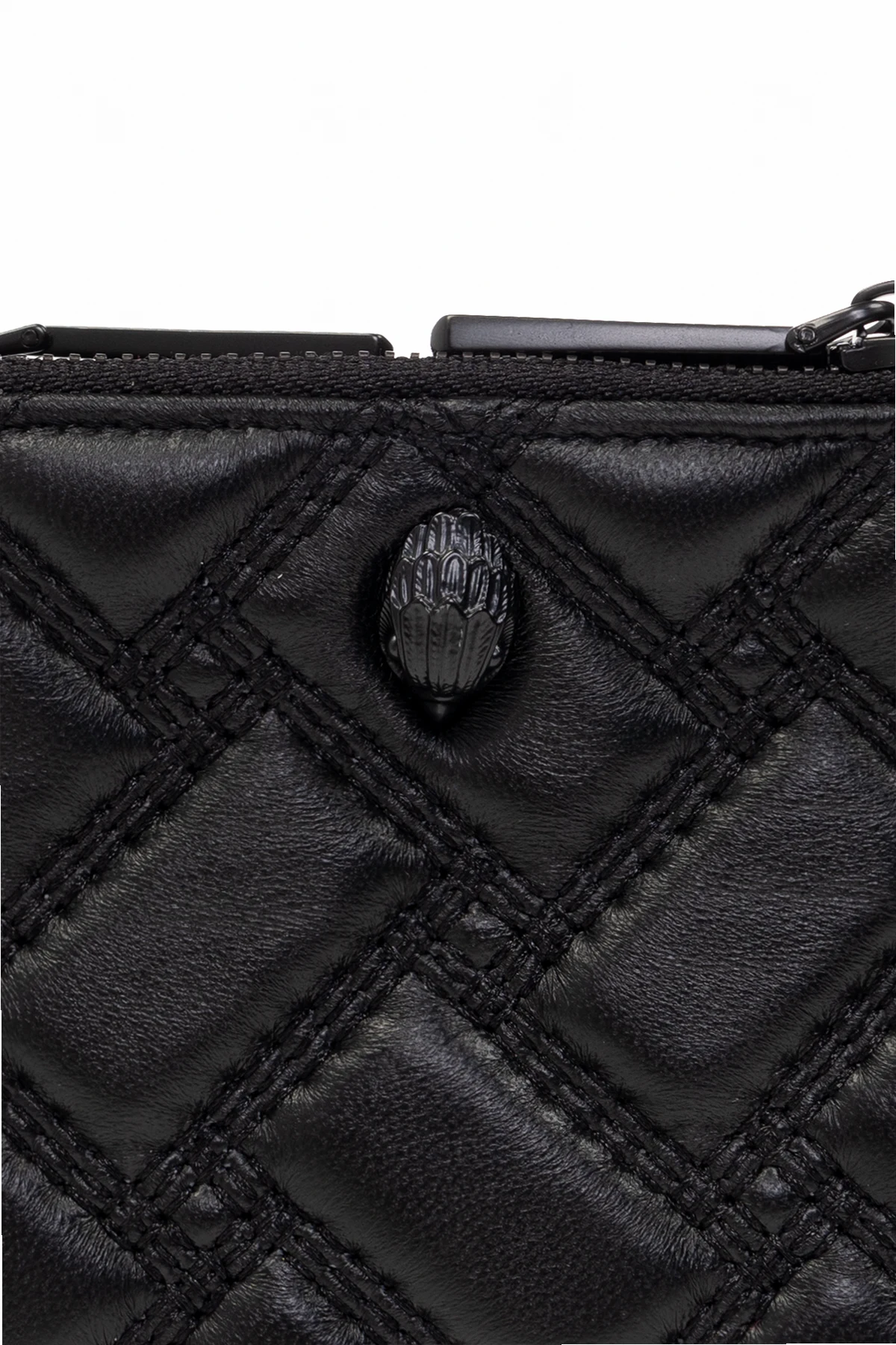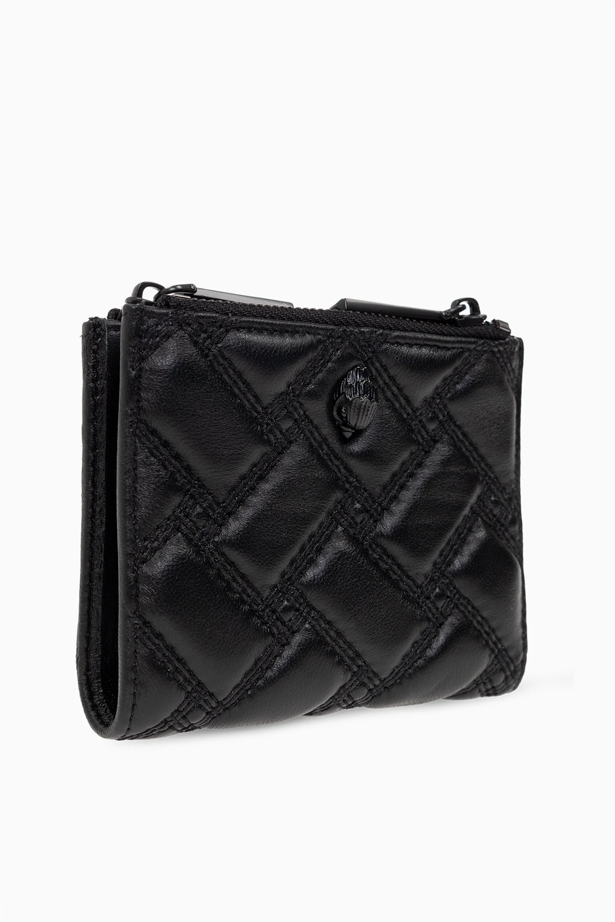 Black ‘Kensington Mini Purse’ quilted wallet from Kurt Geiger. Made from leather, this design fastens with a snap and showcases a crystal-encrusted metal Eagle head plaque, two external zip pockets, black metal hardware and one internal compartment with five slip pockets.