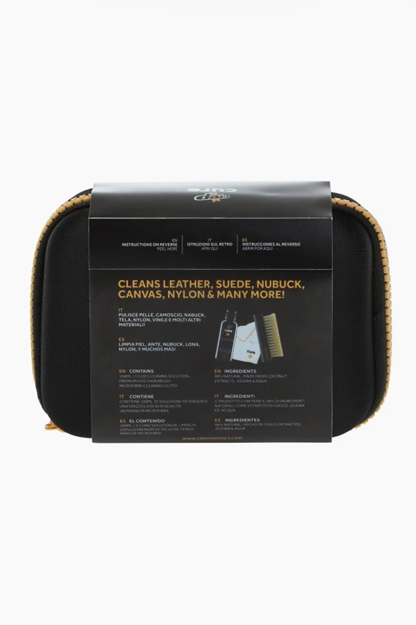 Travel shoe cleaning kit from Crep Protect. Includes: brush with soft bristles, microfiber cloth and 100 ml cleaning solution. Made of 98% natural ingredients. Includes water, coconut extracts and jojoba.