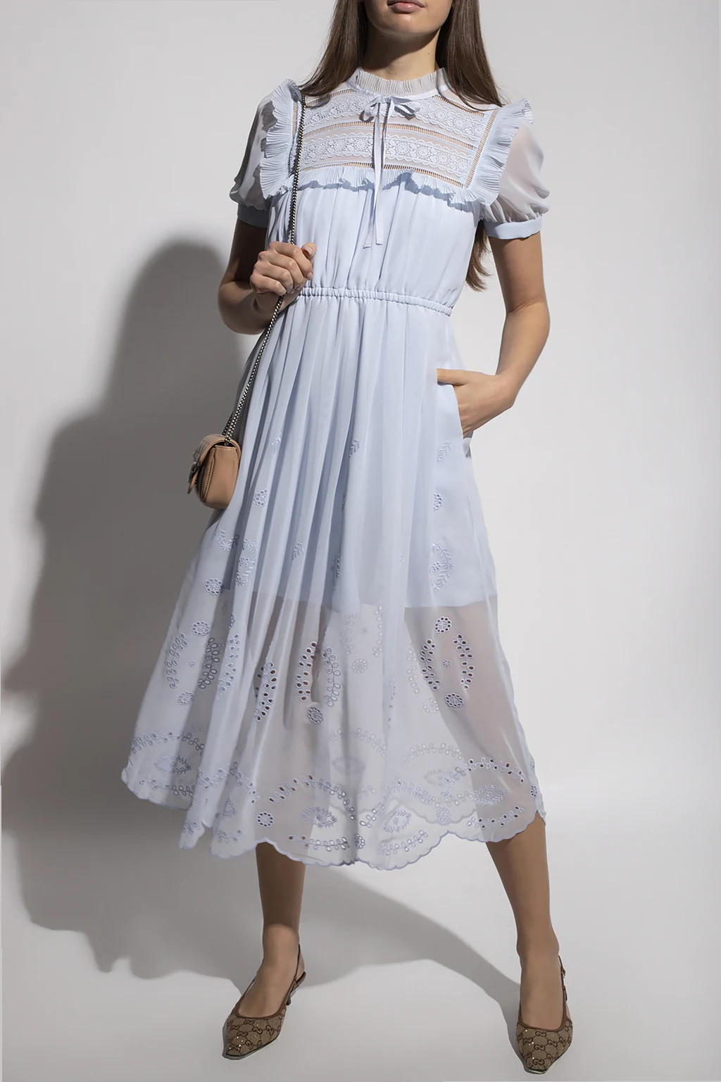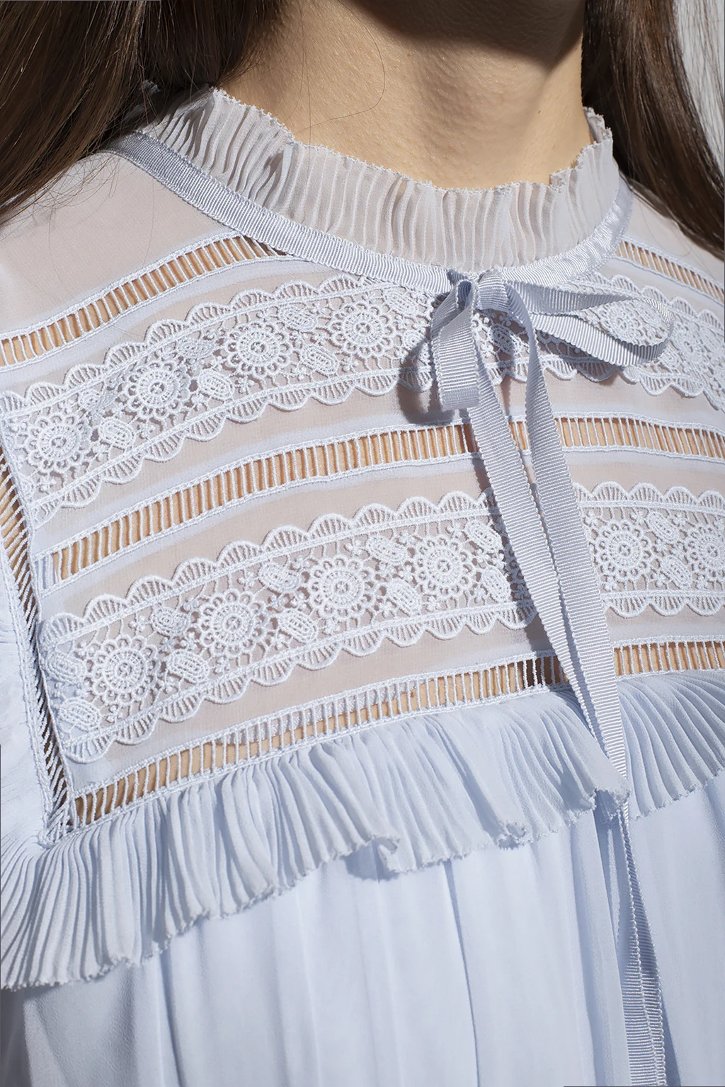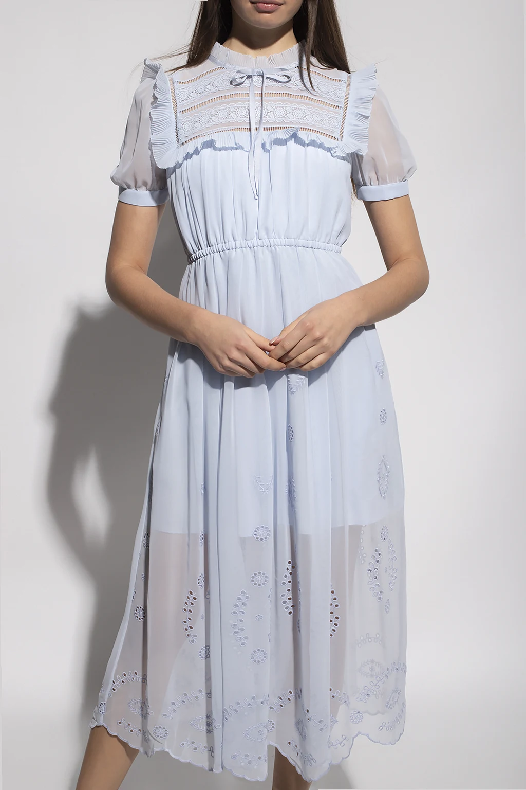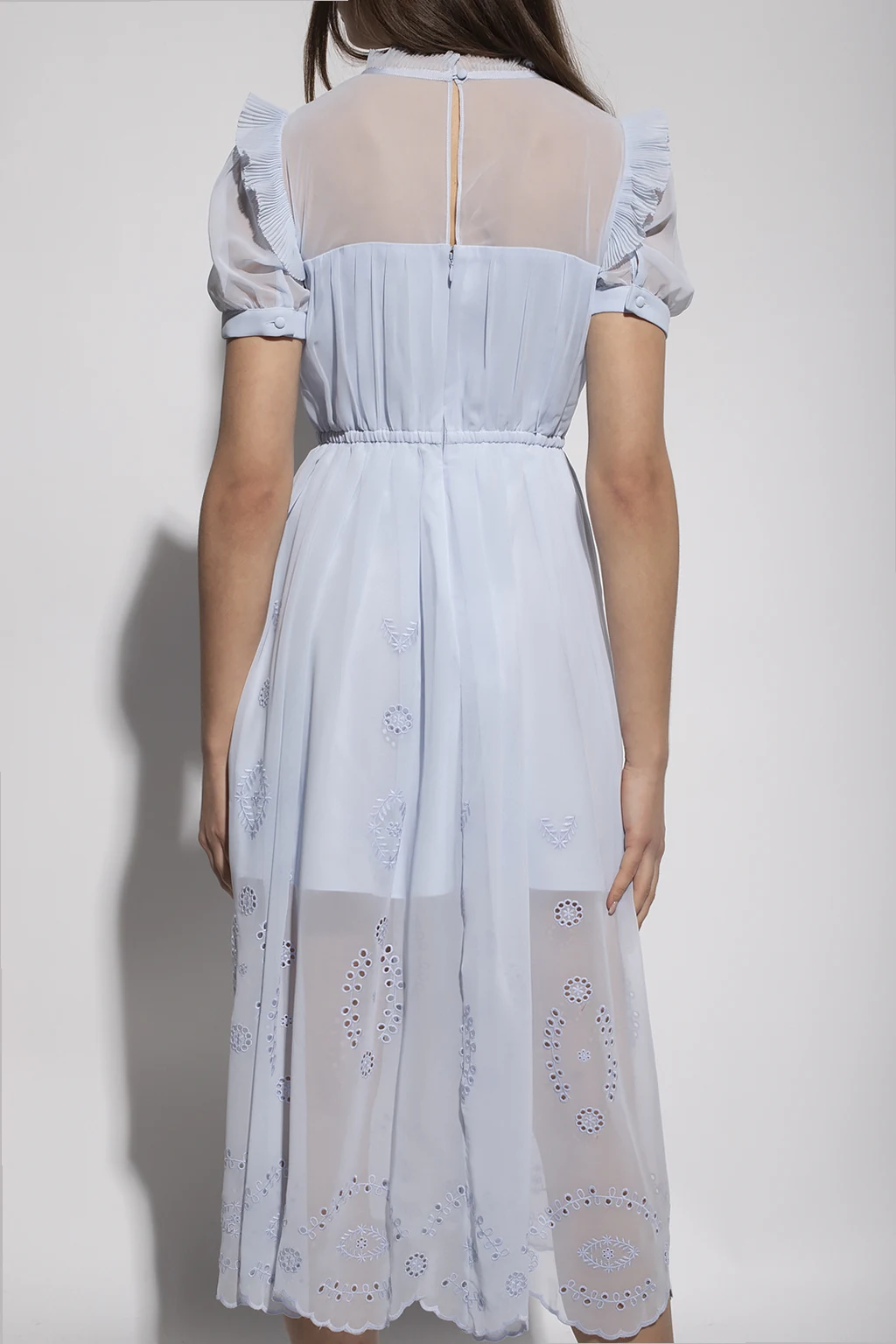 Light blue dress from Self Portrait. Designed with a lace trim bib with a pleated ruffle, this style features a zipper, button and hook & eye closures on the back, an elasticated waistband and short sleeves with button cuffs.