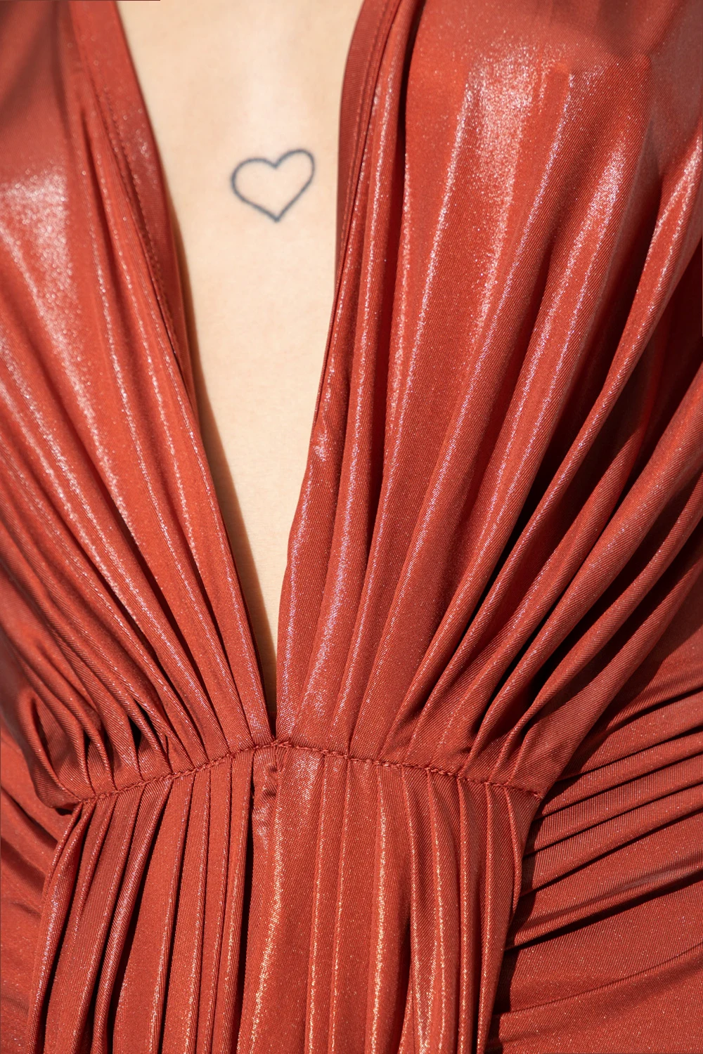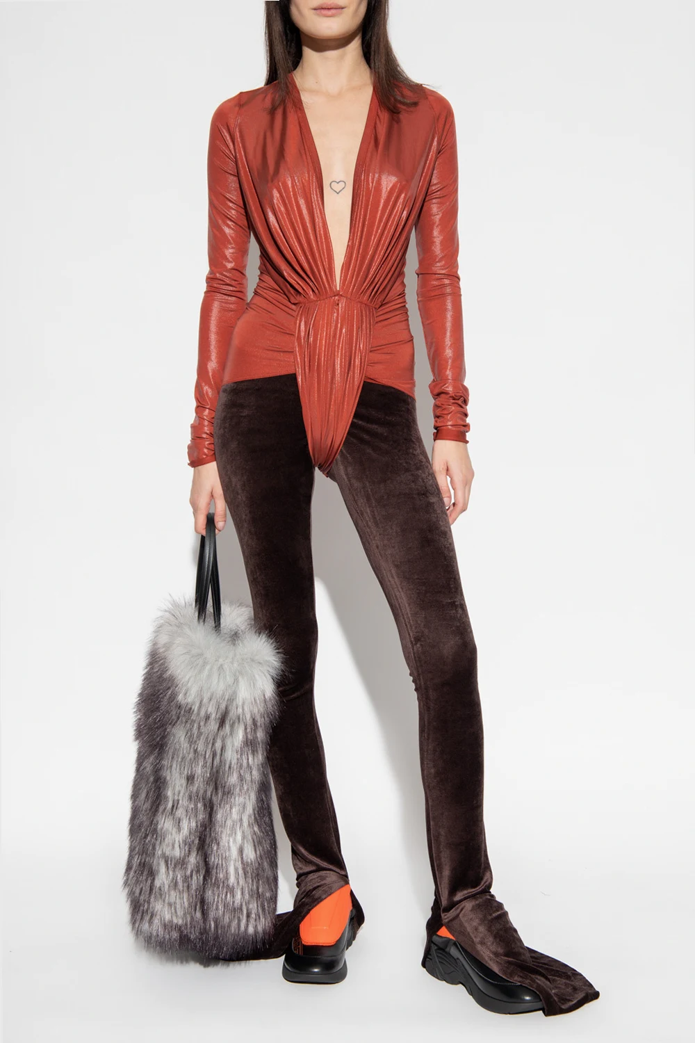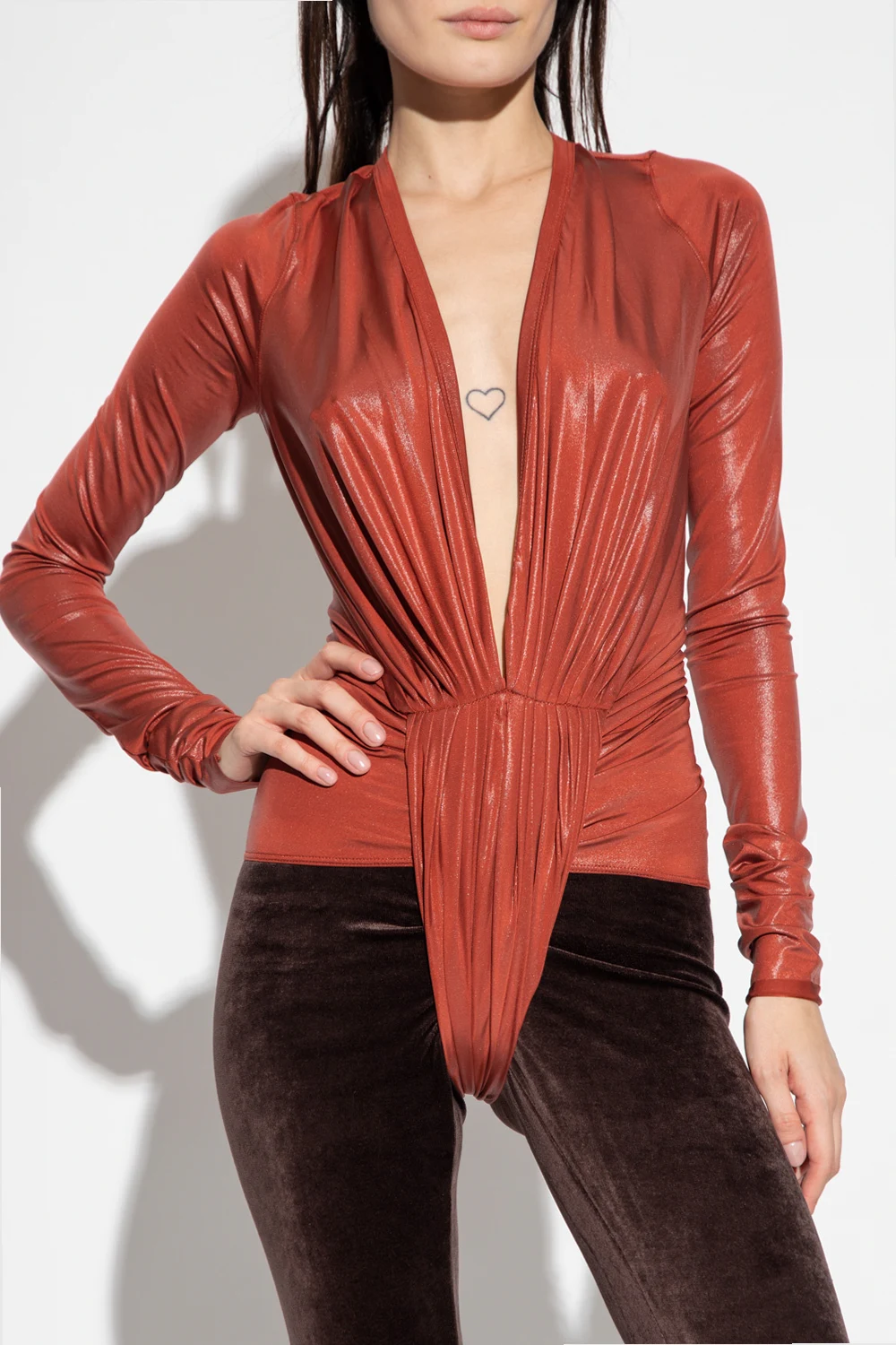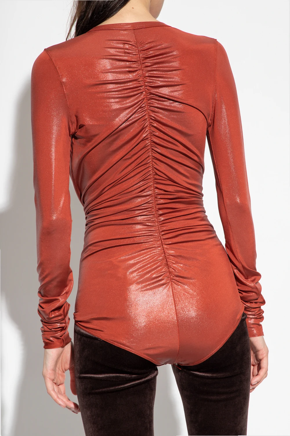 Brownish red ‘Gia’ body with long sleeves from Rick Owens Lilies. Crafted from stretchy fabric with a shiny finish, this design features snap fastenings, pleated panels, decorative gathers, plunging V-neck and long sleeves.
