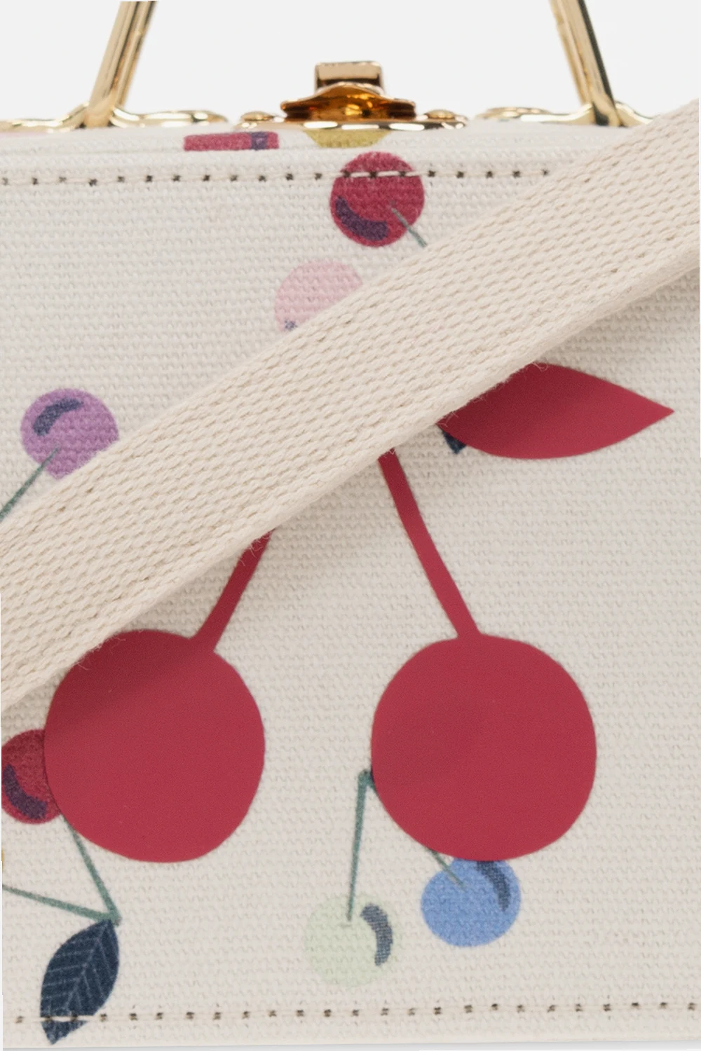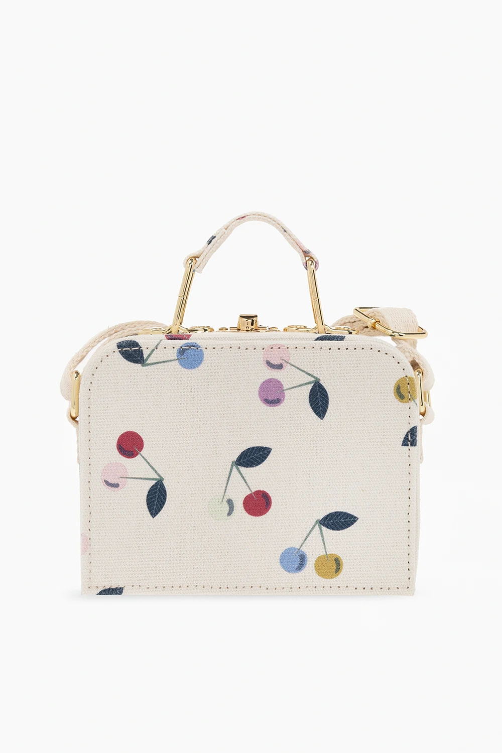 Cream shoulder bag from Bonpoint. Crafted from cotton, this design features a logo pattern, a snap fastening, a shoulder strap, gold-tone metal hardware and one internal compartment.