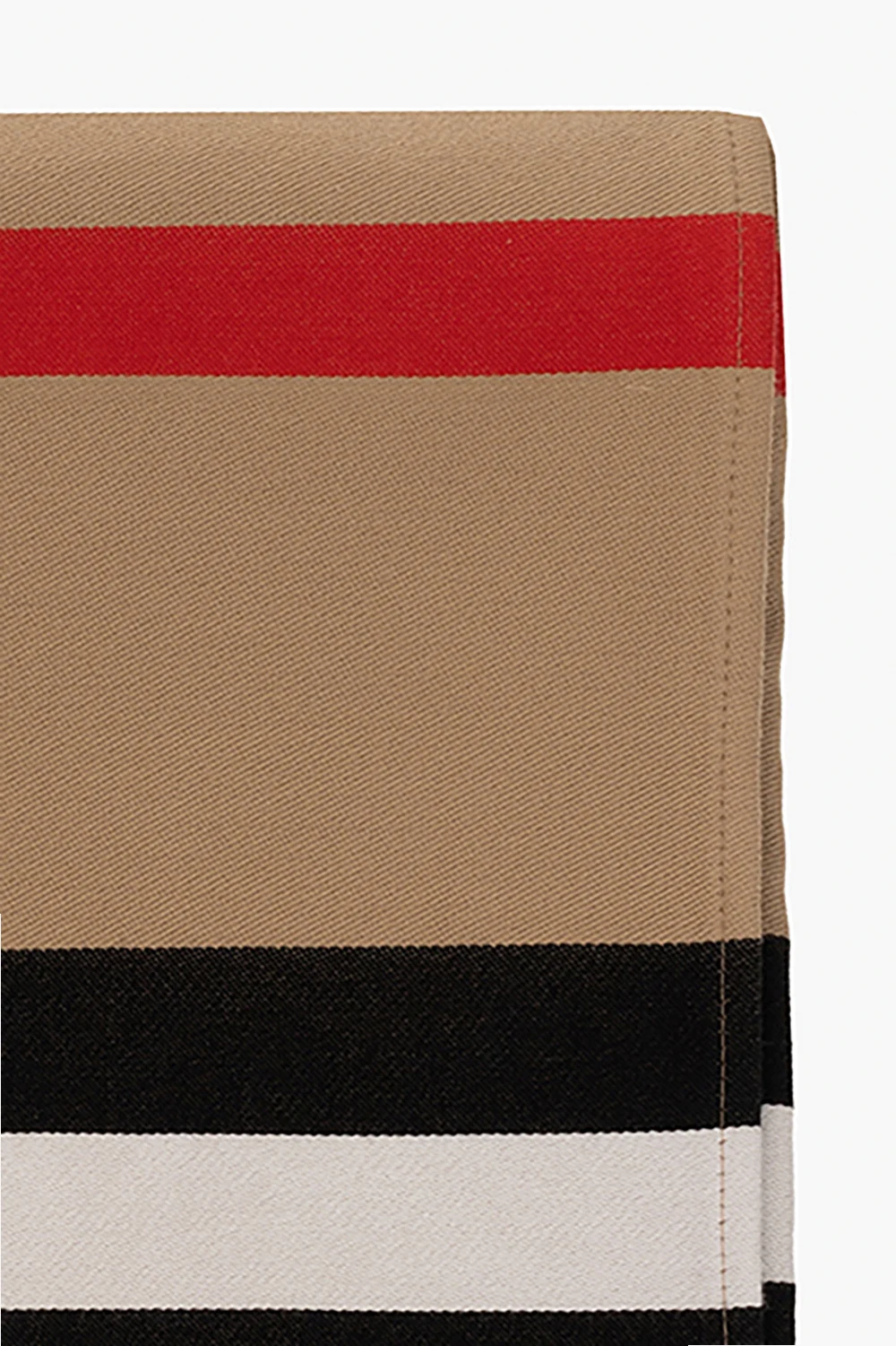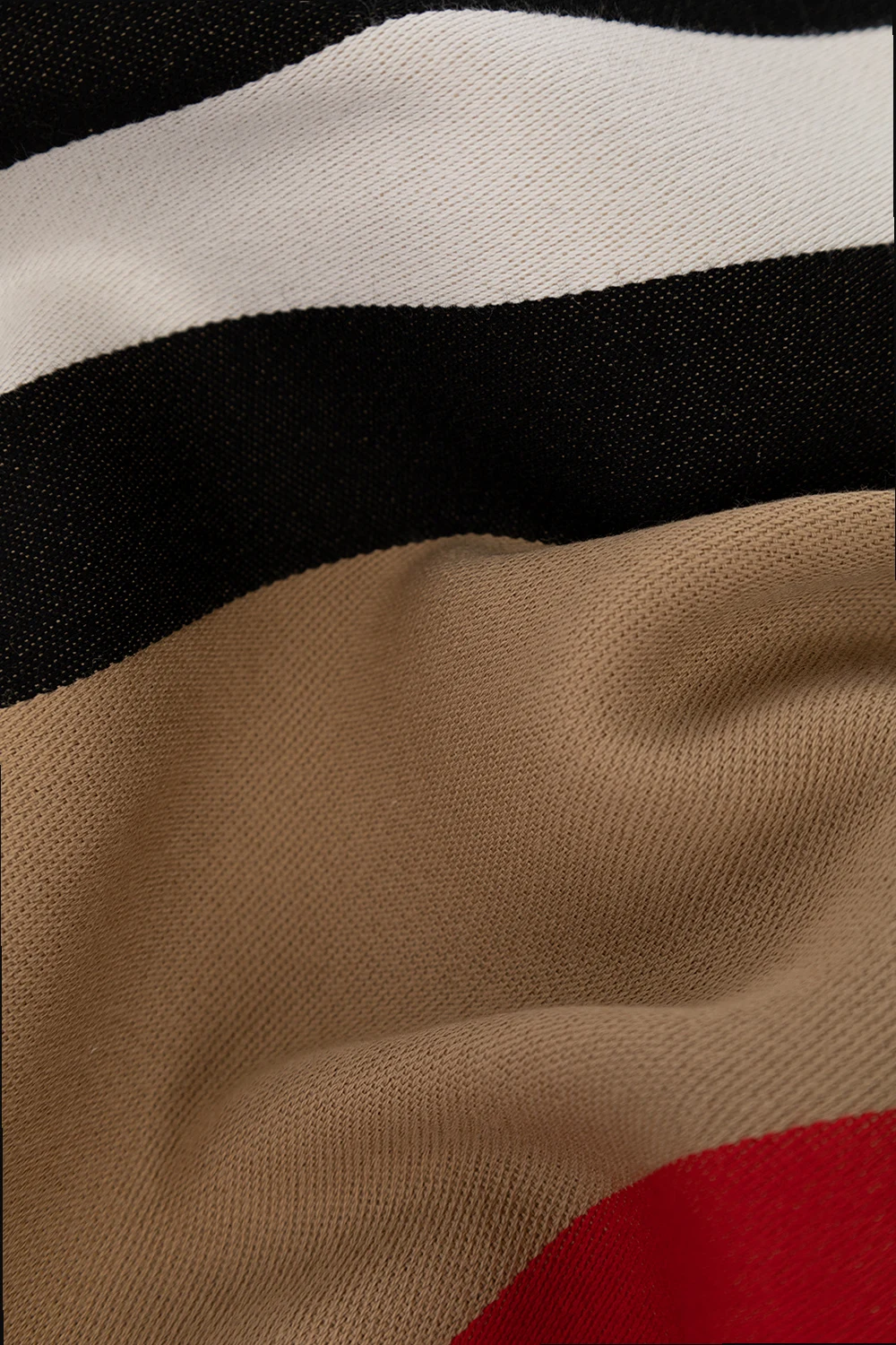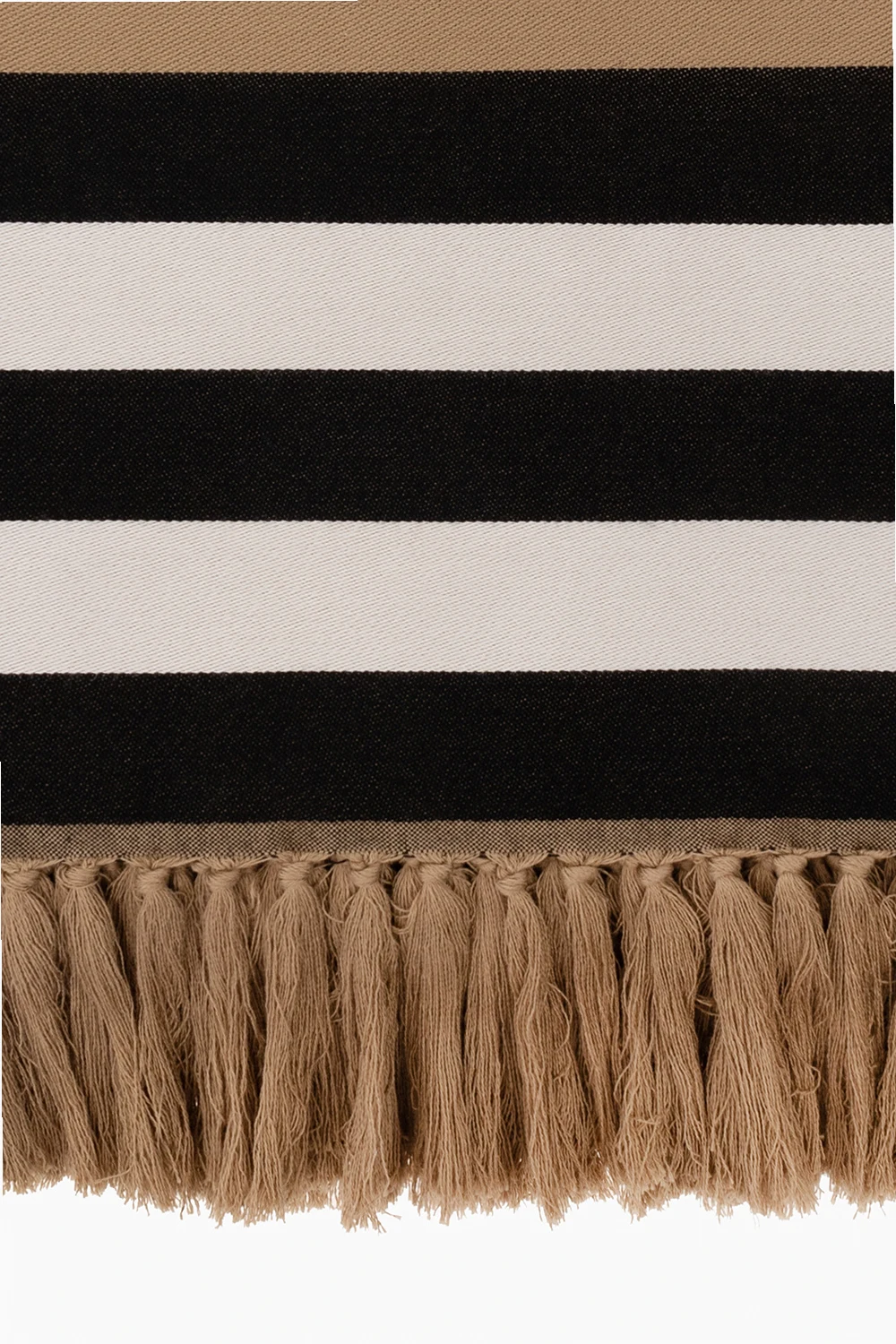 Beige blanket from Burberry. Made of cotton, this item showcases a white, red and black stripe pattern and hand-knotted fringing.