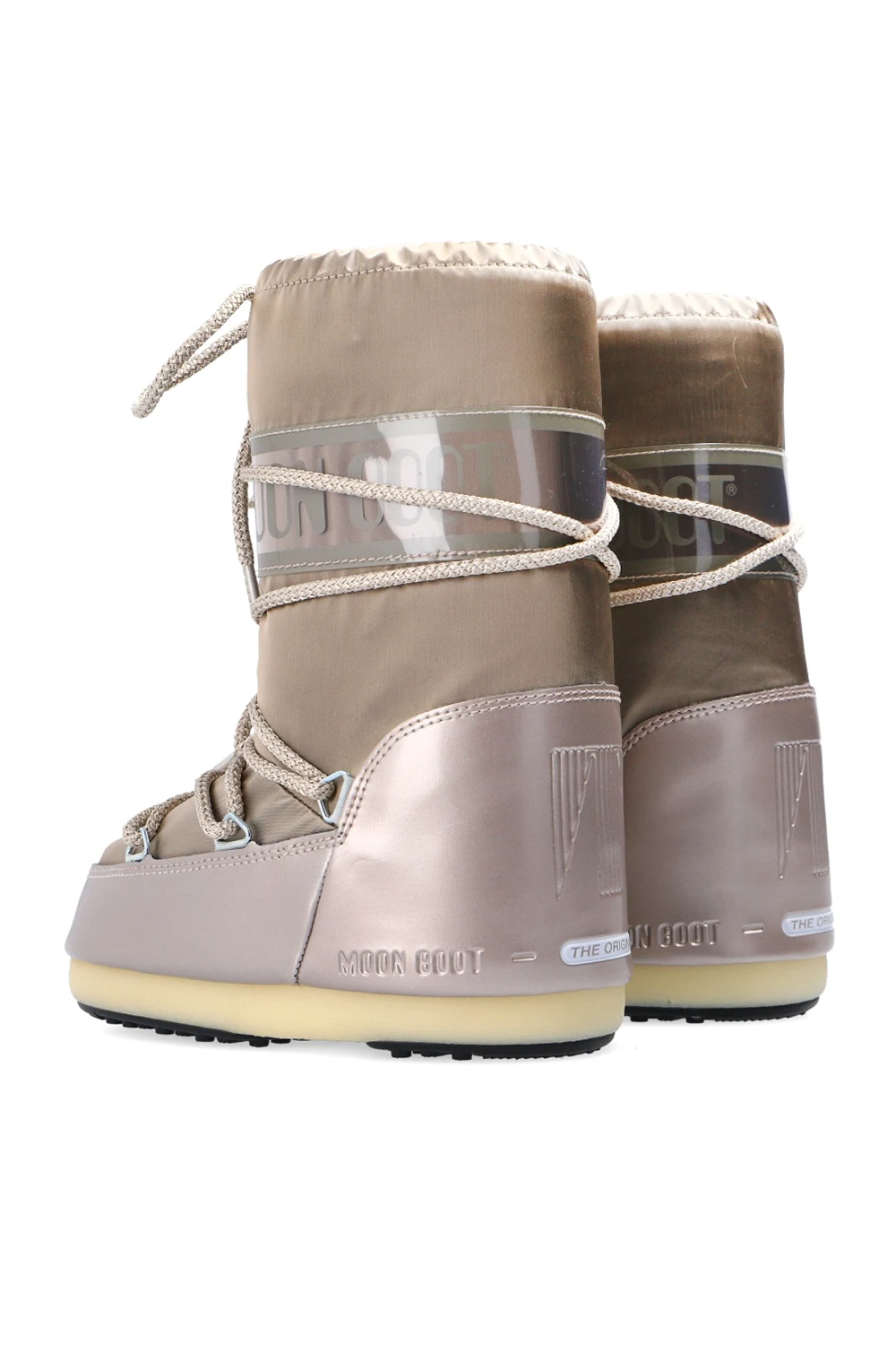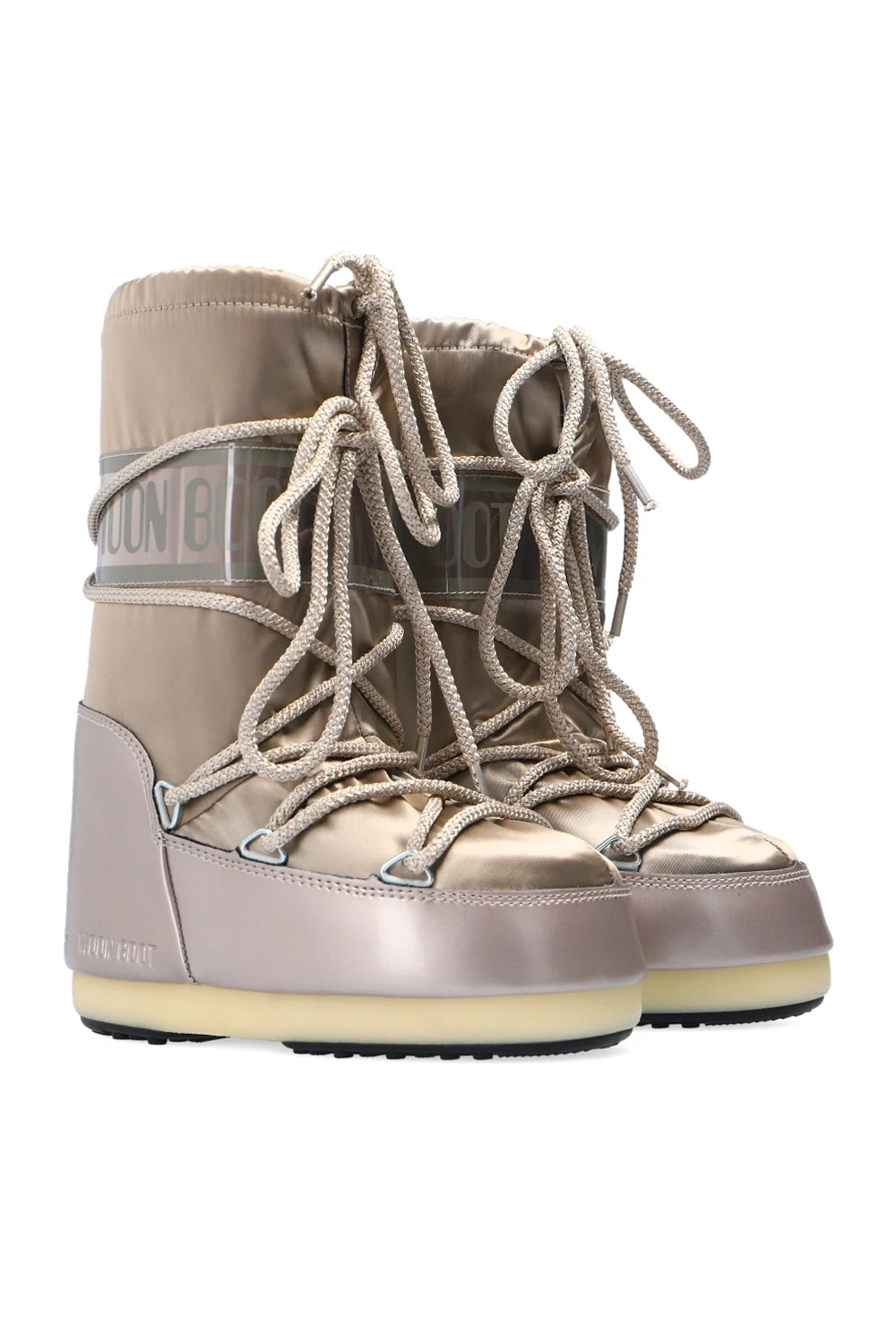 Silver-tone and gold-tone ‘Glance’ snow boots from Moon Boot Kids. Offering waterproof upper, this pair sits on a black and beige rubber sole and showcases lace-up fastening, cinching drawcords at the cuff, a patch and an embossed black logo for the brand recognition.