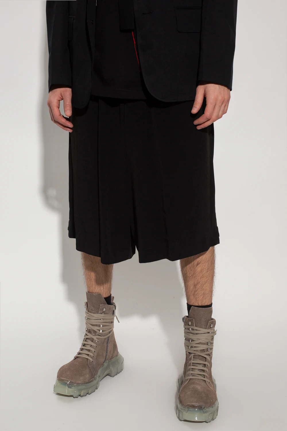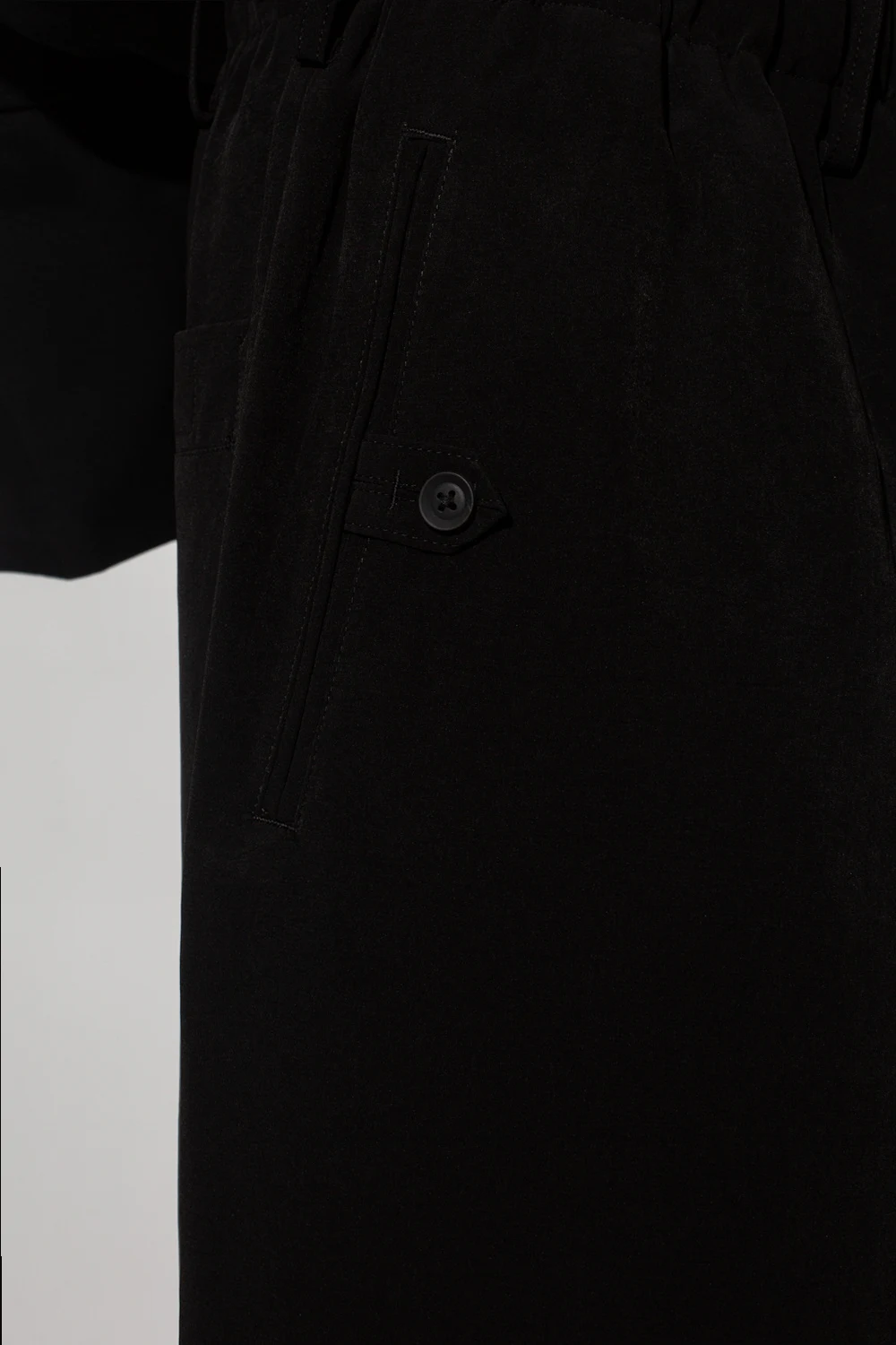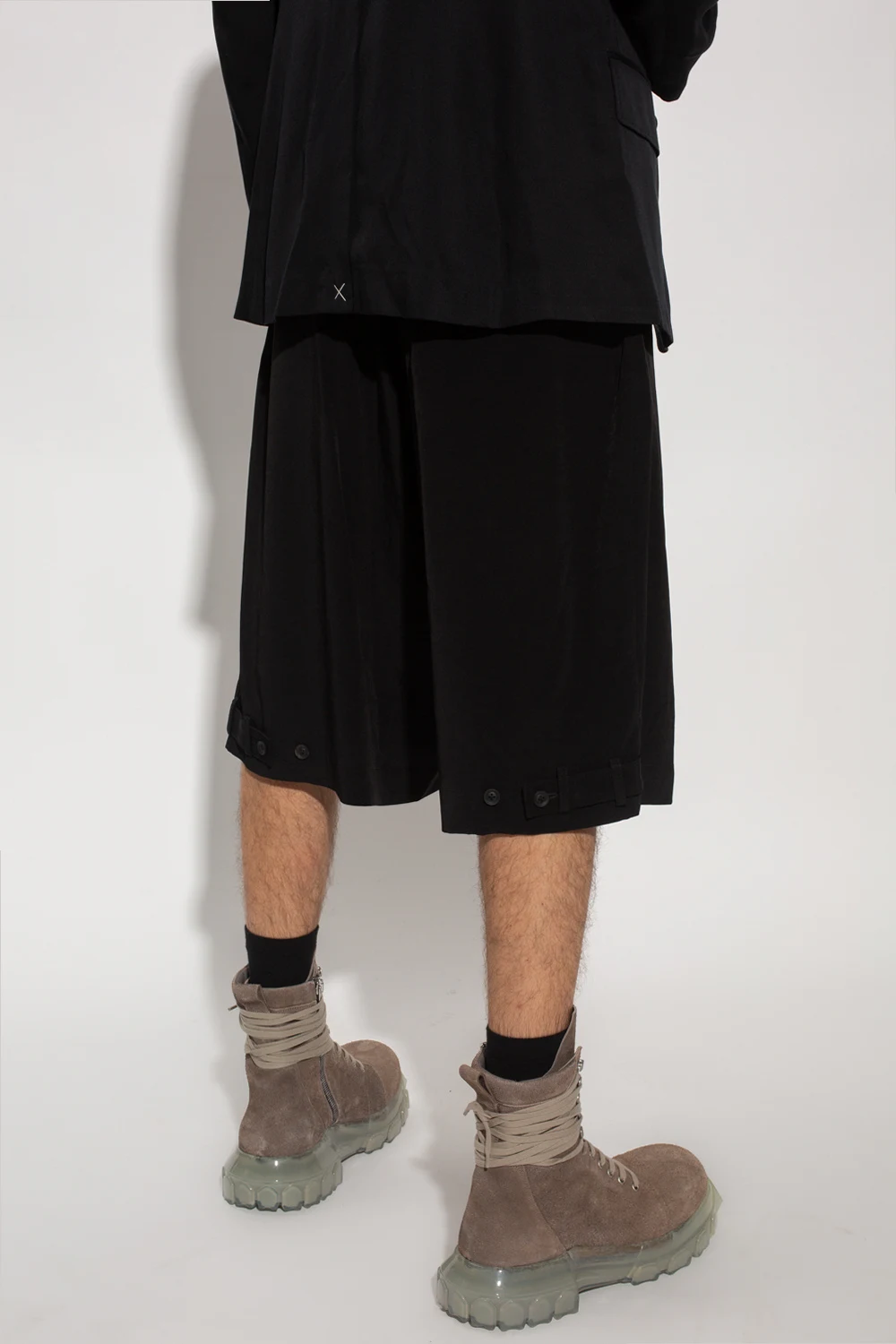 Black shorts from Yohji Yamamoto. Fastened with a zip, button and drawstrings, this pair features an elastic waistband, two slip pockets and two buttoned pockets.