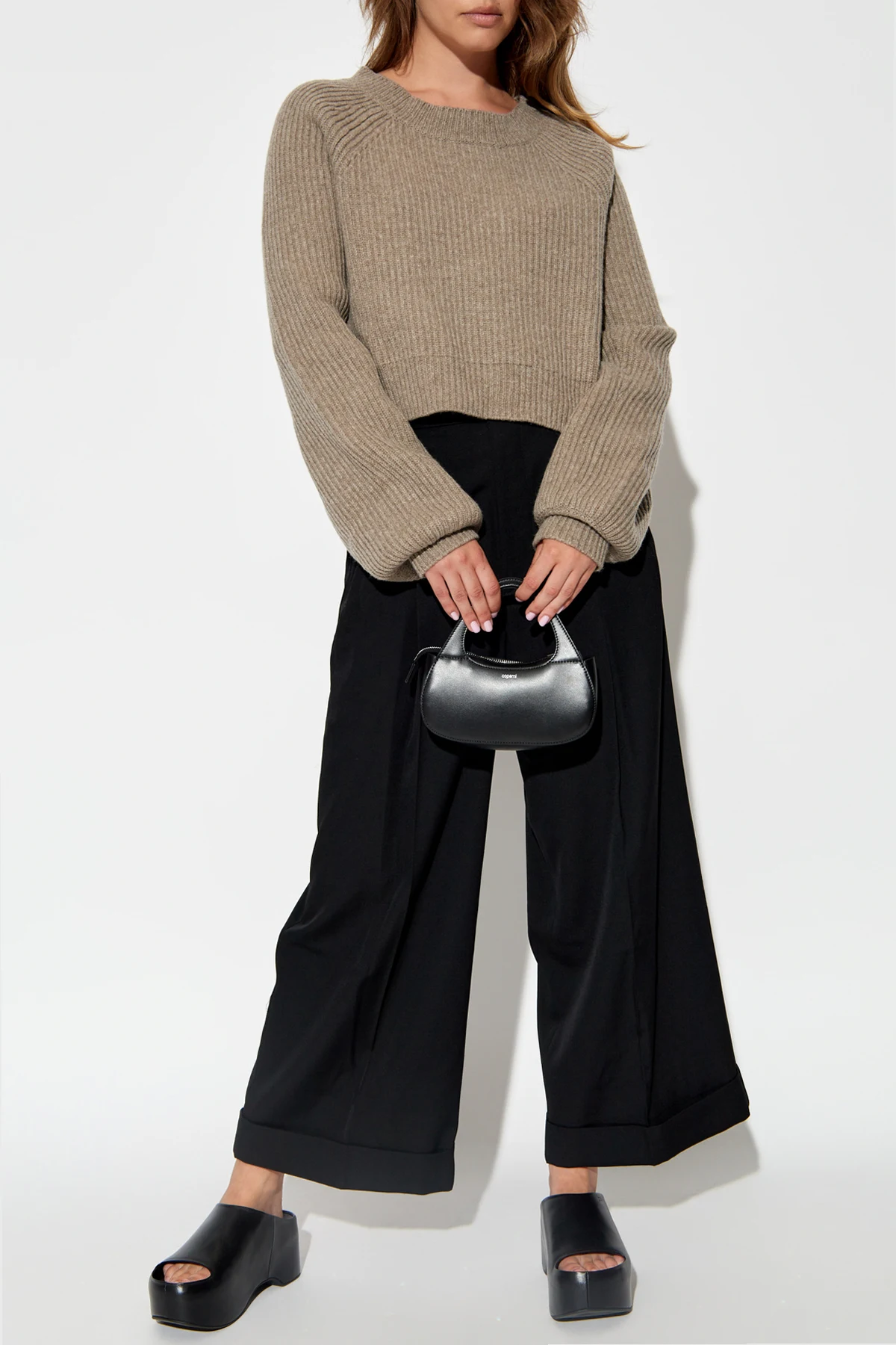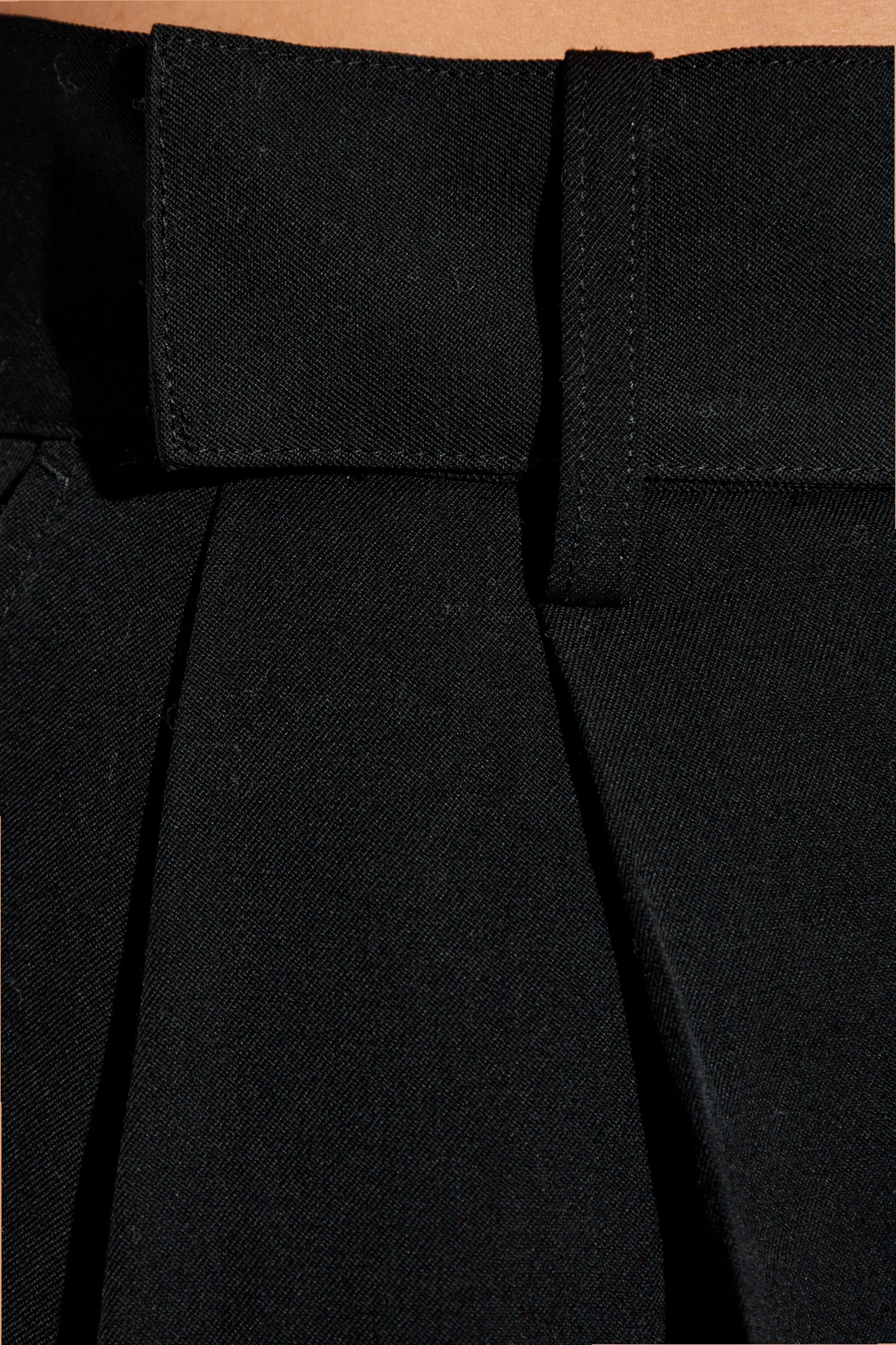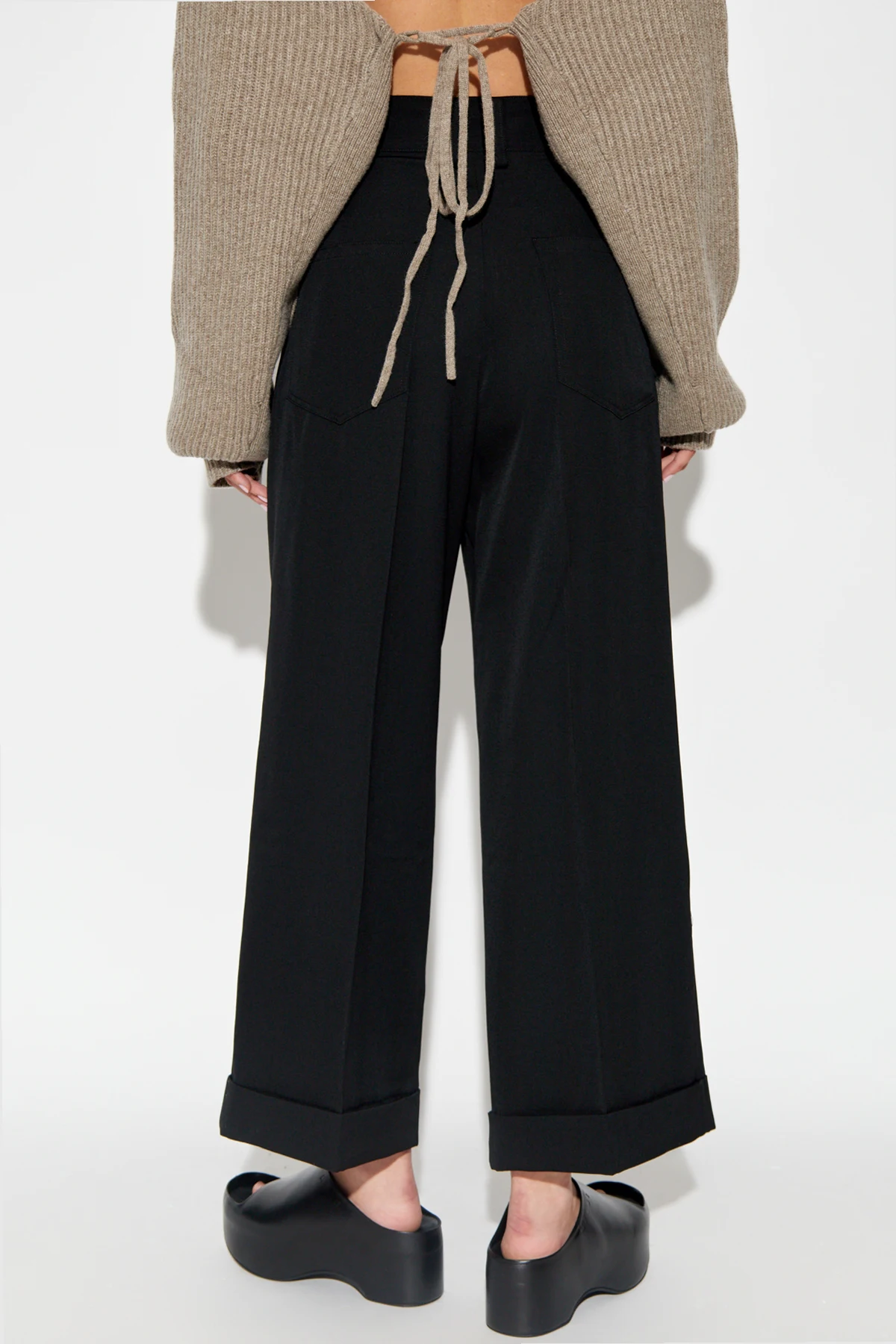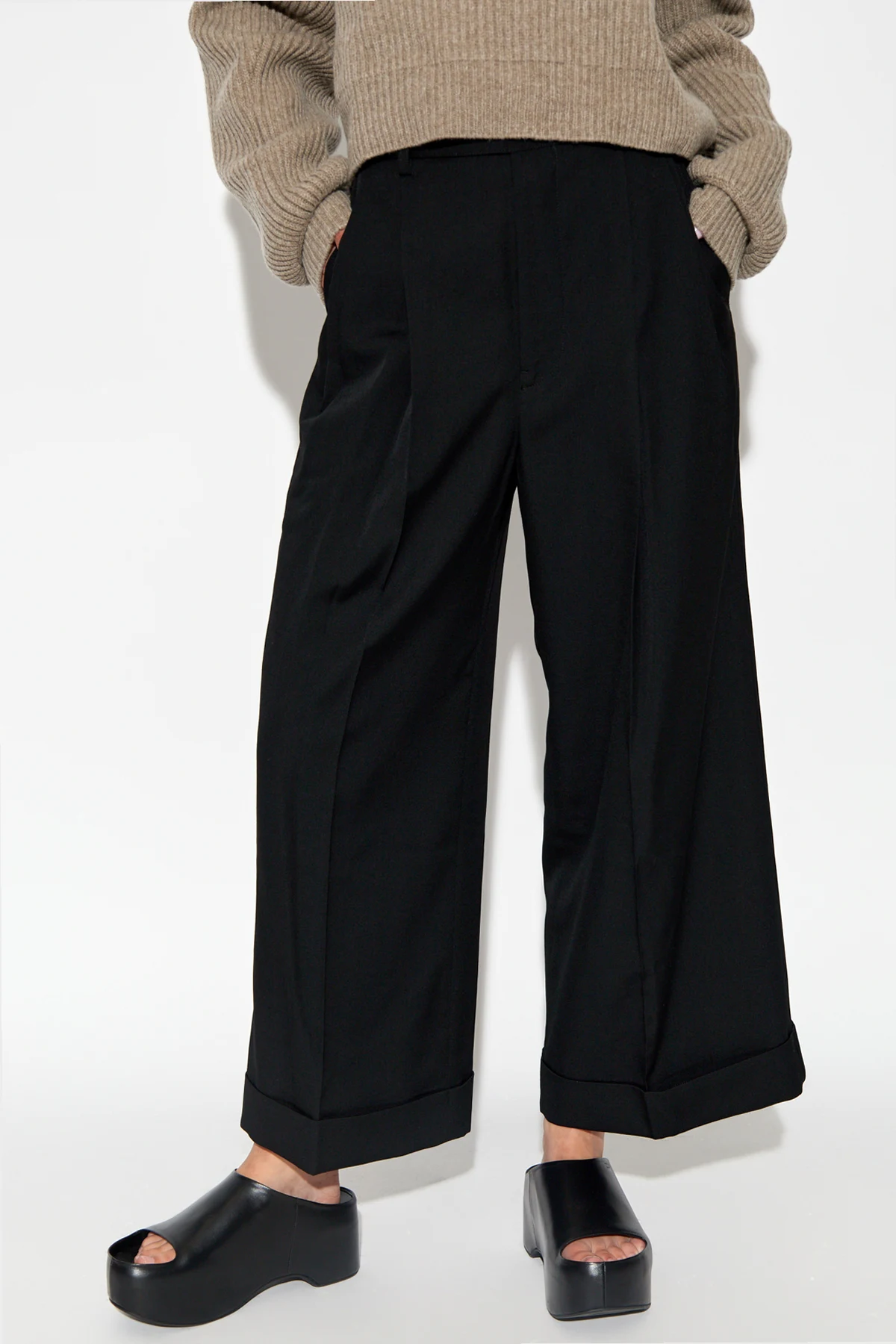 Introducing an exquisite pair of black wool trousers, a testament to the refined craftsmanship of Yohji Yamamoto. Crafted from the finest 100% wool, these trousers exude sophistication with their sleek, matte finish and elegant, wide-leg design that gently flares towards the hem. The high-waisted silhouette is meticulously structured with sharp pleats, offering both form and function without the compromise of comfort. The absence of visible branding ensures an understated elegance, allowing the quality of material and design to speak for itself. These trousers are secured with a button and a concealed zipper, a hallmark of high-standard tailoring. Additionally, belt loops are thoughtfully included, providing versatility in styling options. With four pockets integrated into the design, practicality is woven seamlessly into luxury. Why Purchase This Product? Exemplary quality and craftsmanship from renowned designer Yohji Yamamoto. Versatile styling options with a high-waisted, wide-leg silhouette. Elegant and timeless design, suitable for both business and casual settings. Functional features like four pockets and belt loops enhance practicality without sacrificing style.
