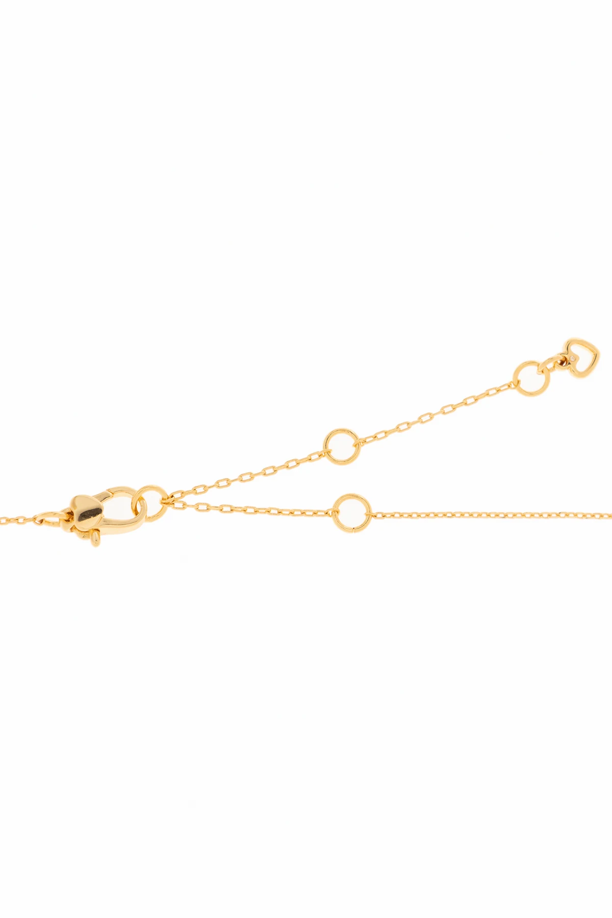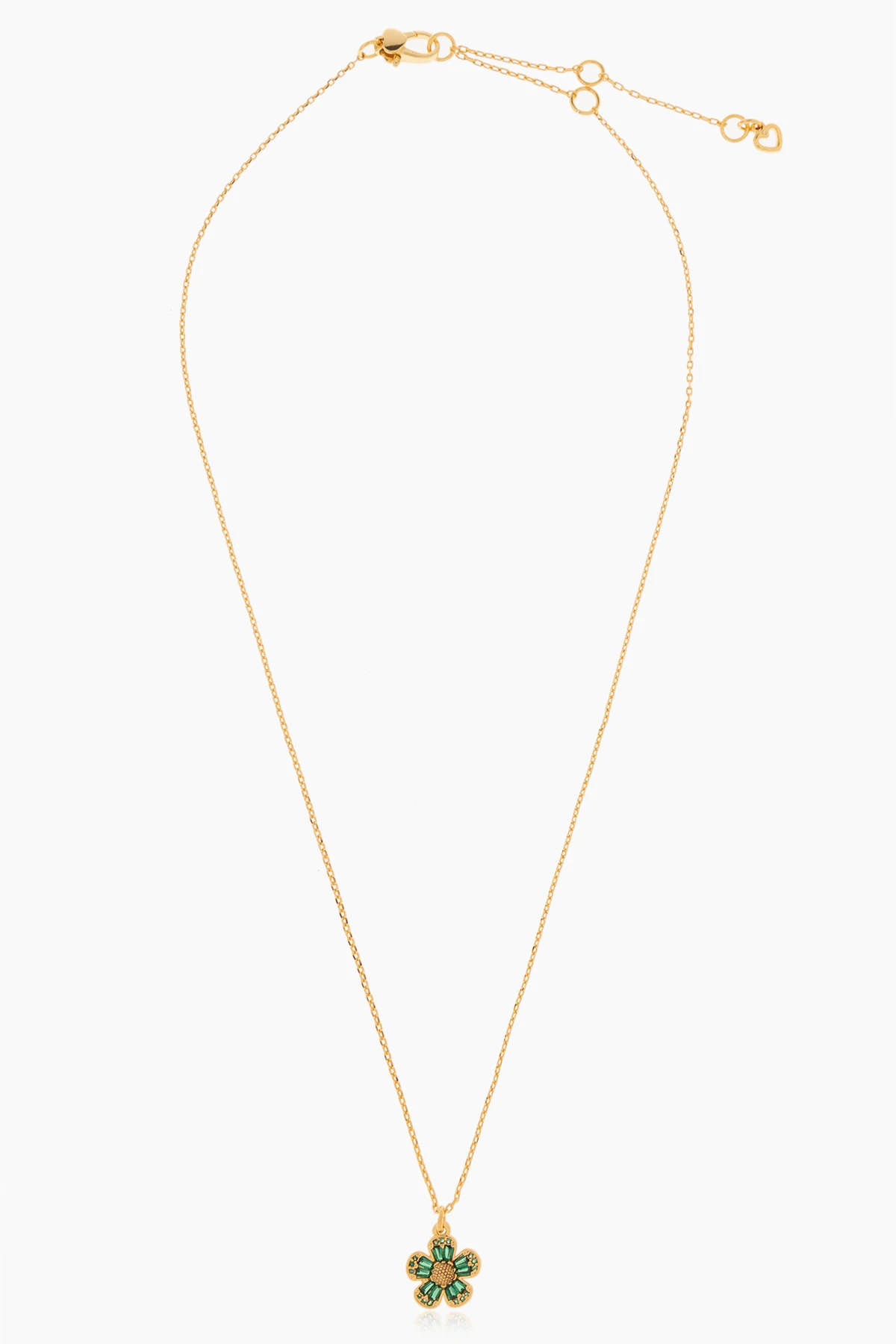 Introducing the exquisite ‘Fleurette’ Necklace from the visionary designer Kate Spade. This piece transcends mere adornment, embodying the essence of sophistication and the bloom of nature in its design. Crafted with a golden hue that glistens under any light, this necklace promises an aura of elegance and a touch of opulence to any ensemble. The pendant, a charming flower with five petals, is intricately detailed with green elements that mimic the allure of precious gems. These elements, set against the golden metallic sheen of both the pendant and the chain, evoke a sense of luxury and refinement. The chain itself is adorned with spherical embellishments, evenly spaced to add a whisper of elegance and allowing for adjustable lengths to suit any neckline. Whether showcased on the décolletage or paired with an ensemble for a festive occasion, this necklace’s classic design and versatile color scheme ensure it is a timeless addition to any jewelry collection. Why Purchase This Product? Designed by the renowned Kate Spade, ensuring a blend of contemporary elegance and timeless style. Crafted with high-quality metal and cubic zirconia for durability and lasting shine. The distinctive flower design, part of the ‘Fleurette’ collection, offers a unique and graceful aesthetic. Adjustable length and classic design make it suitable for both everyday wear and special occasions. The golden hue and green elements provide a versatile accessory that complements a wide range of outfits.