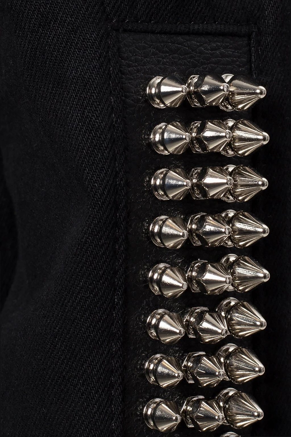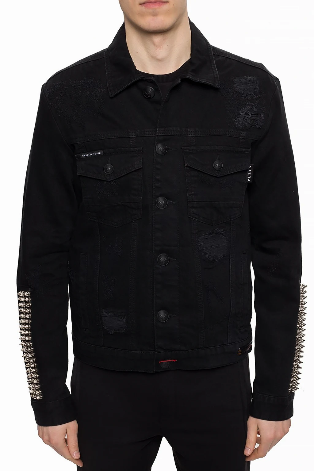 Black distressed denim jacket from Philipp Plein. Sleeves decorated with silver-tone studs and buttons embossed with a pattern.
