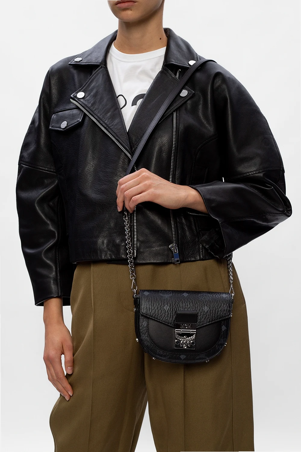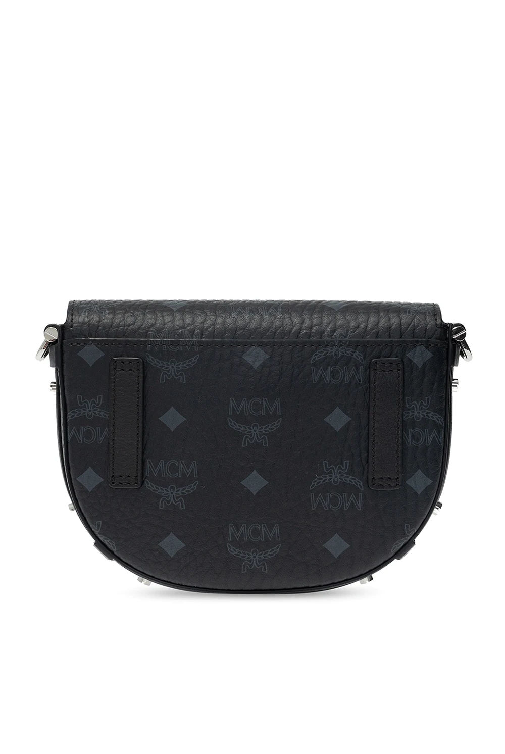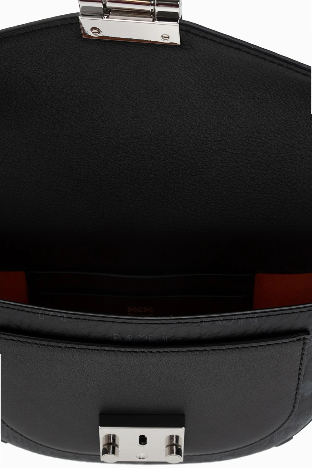 Black \'Patricia\' shoulder bag from MCM. Size mini. Crafted from the label\'s signature canvas with grey monogram print, this design is complete with silver-tone metal hardware, including logo plaque, leather trims and orange suede clad interior with one compartment and two card slots.