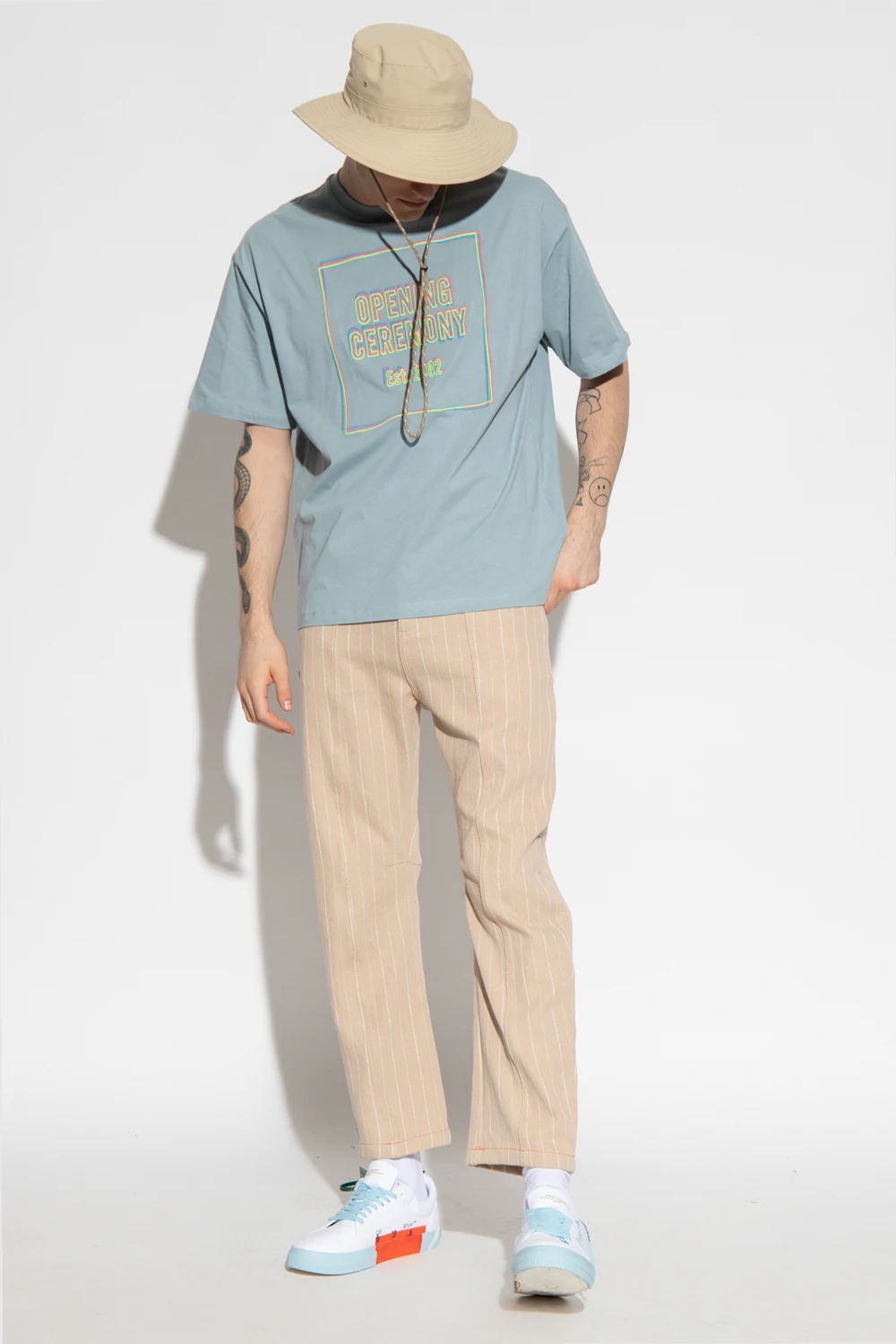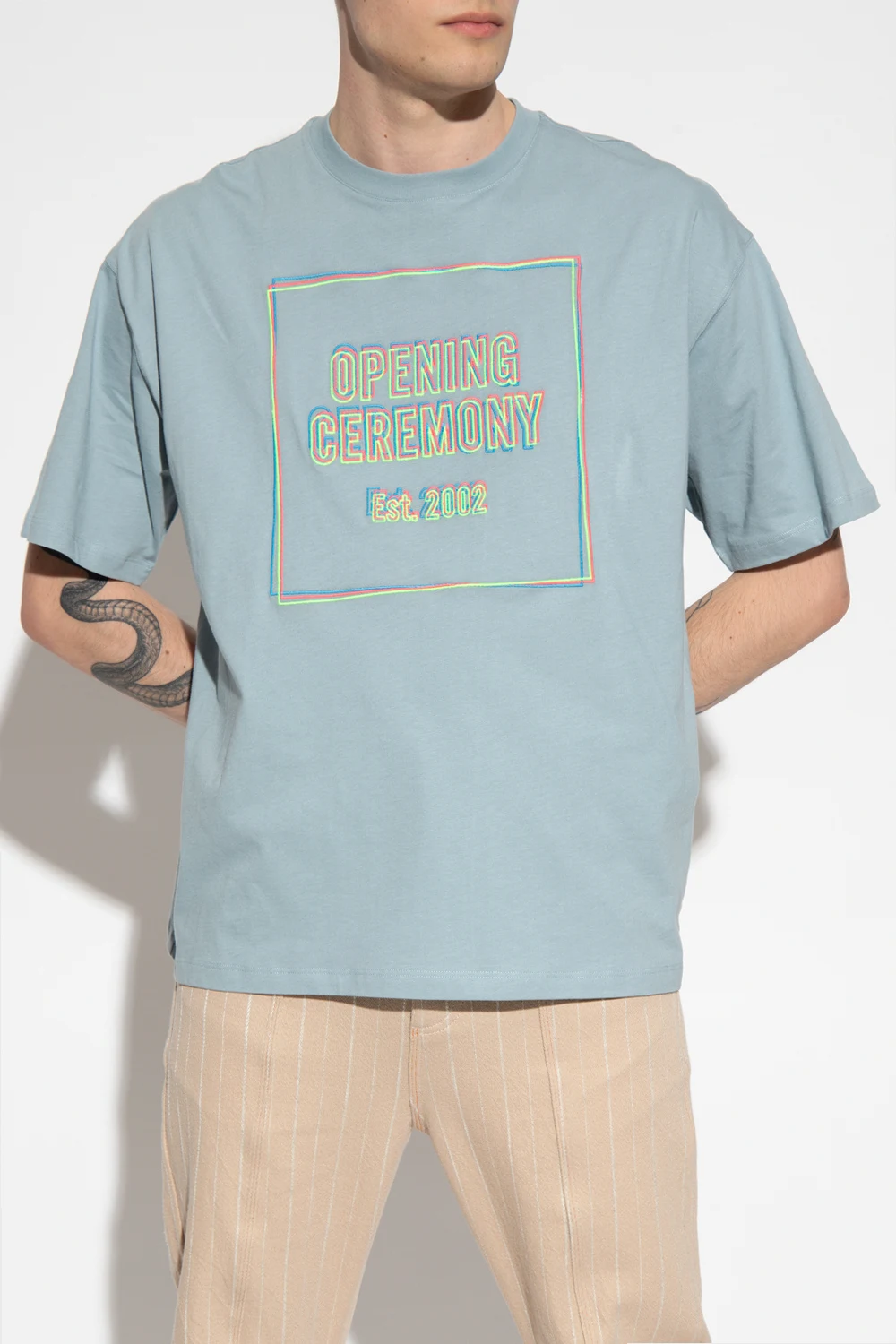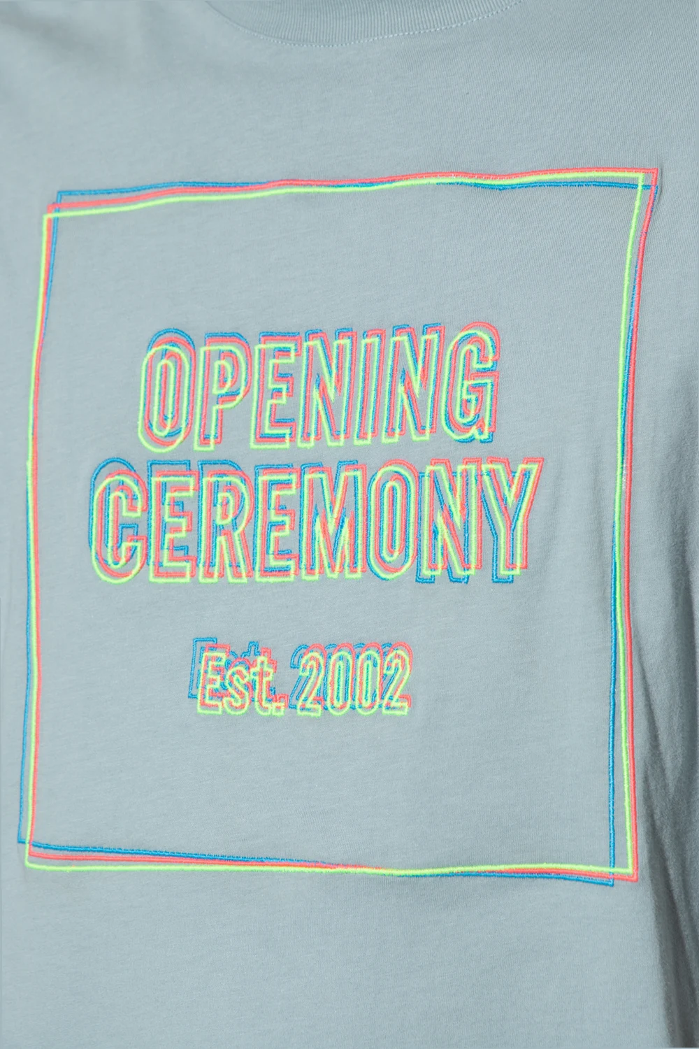 Blue crewneck T-shirt from Opening Ceremony. Made of cotton, this style features short sleeves, an elasticated collar and an embroidered colourful logo pattern.