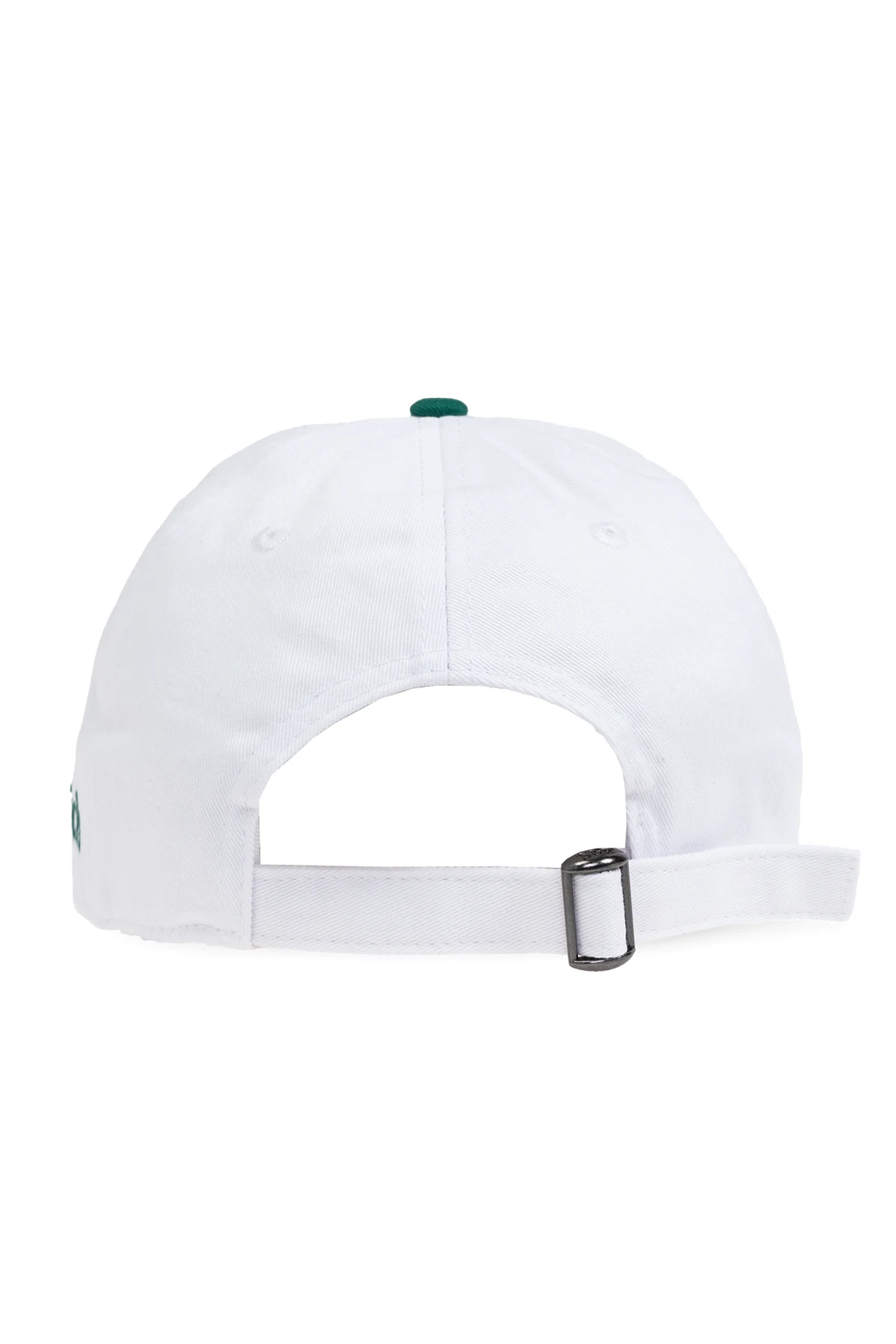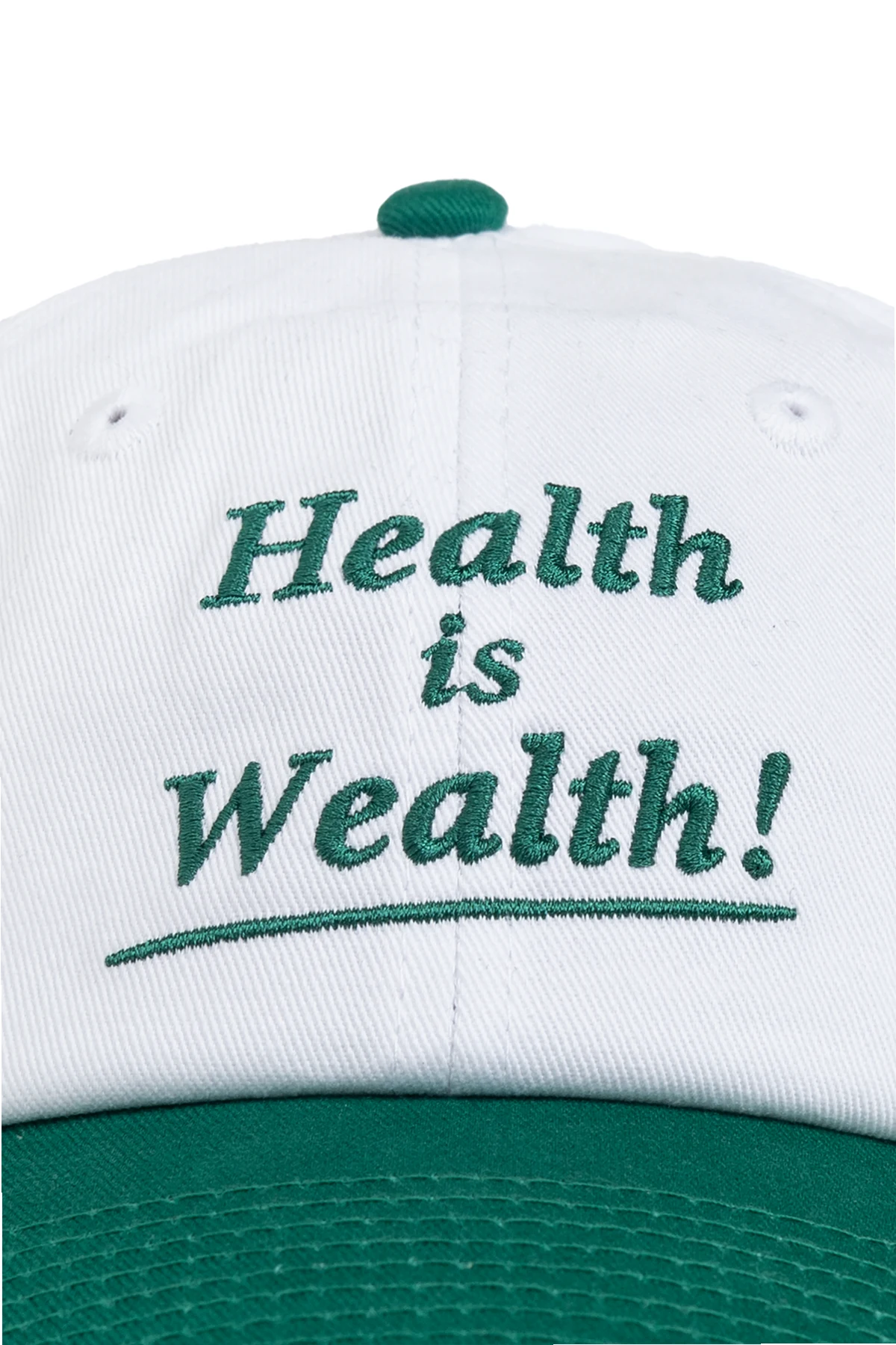 Introducing the Health is Wealth! cap from the exclusive collection by Sporty & Rich. This unisex accessory features a pristine white body contrasted by a vibrant green visor, creating a striking and stylish look that is sure to turn heads. Adorning the front is the elegantly embroidered slogan \"Health is Wealth!\" in green, serving as a bold statement of well-being and sophistication. The right side proudly displays the designer\'s logo, also in green, signifying the prestigious brand behind this masterpiece. Crafted from premium-quality cotton, this cap promises comfort and durability. Its classic six-panel design with a gently curved visor ensures a timeless appeal, while the adjustable strap with a metal buckle at the back allows for a perfect fit for all head sizes. Why Choose This Product? Unisex Design: Perfect for both men and women. High-Quality Material: Made from 100% premium cotton for ultimate comfort. Adjustable Fit: Metal buckle ensures a customizable fit. Exclusive Branding: Featuring the iconic Sporty & Rich logo. Stylish Contrast: White cap with a striking green visor. Distinctive Embroidery: \"Health is Wealth!\" slogan embodies elegance and wellness.