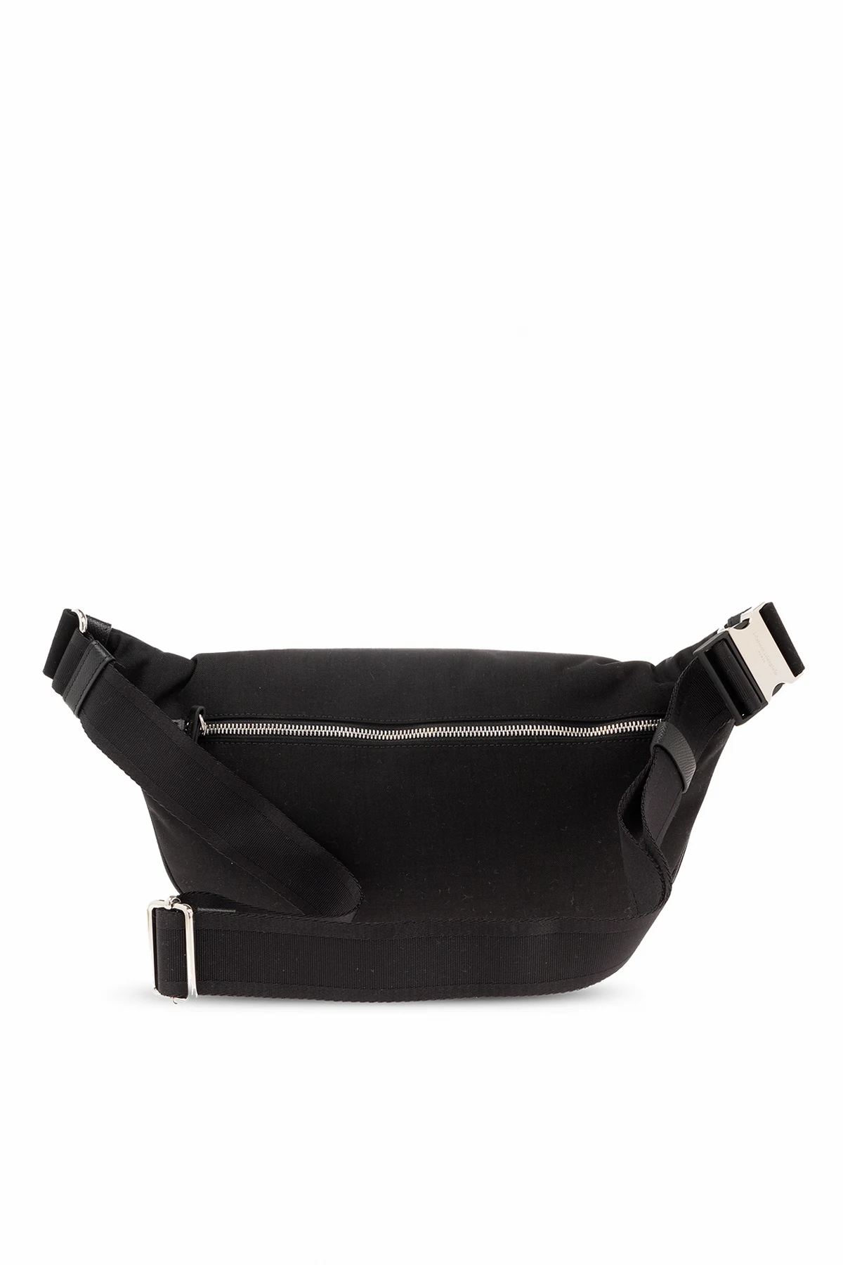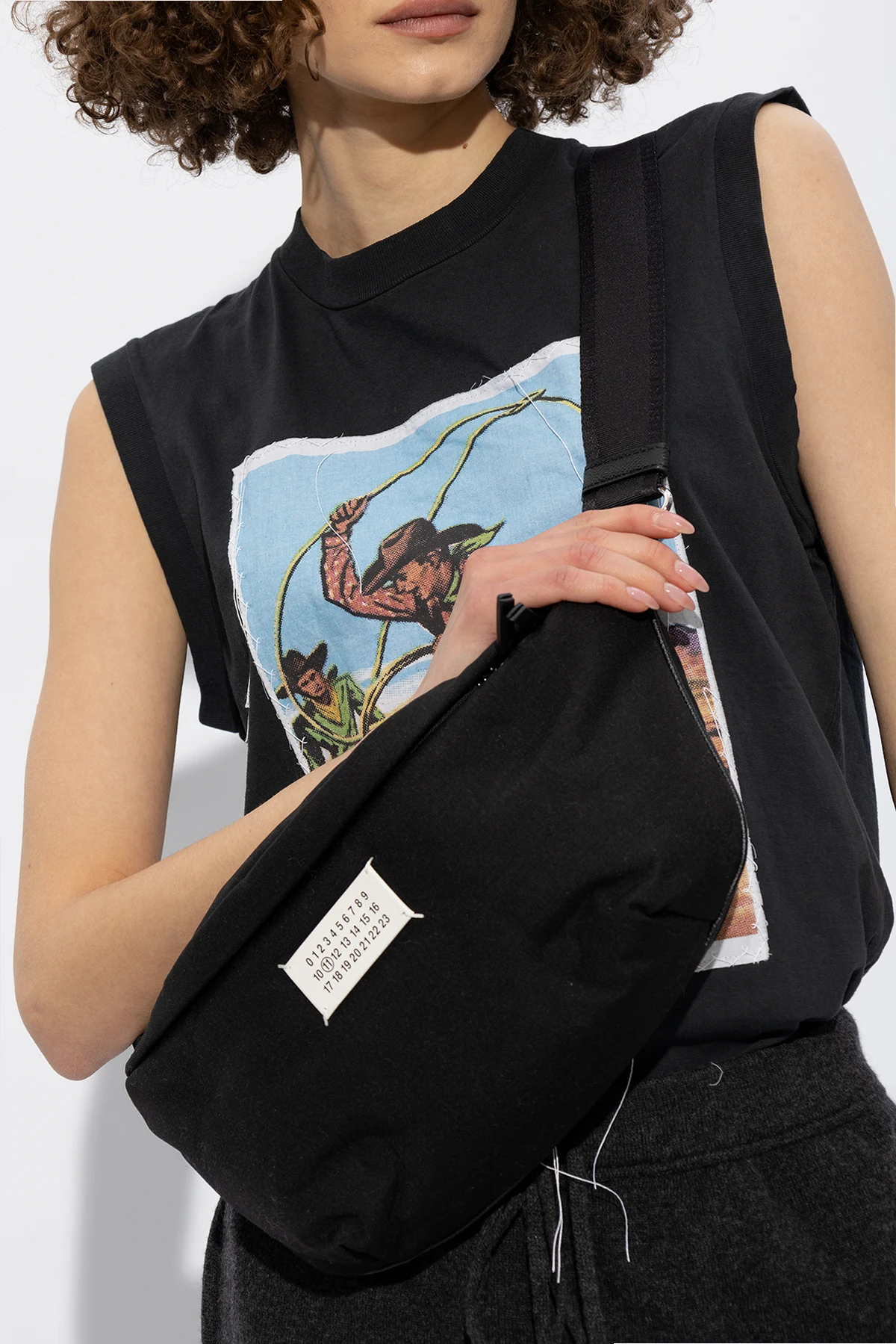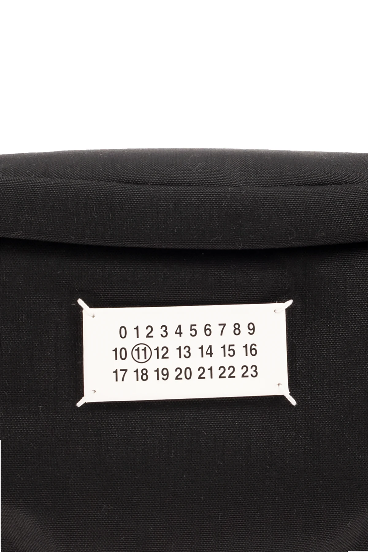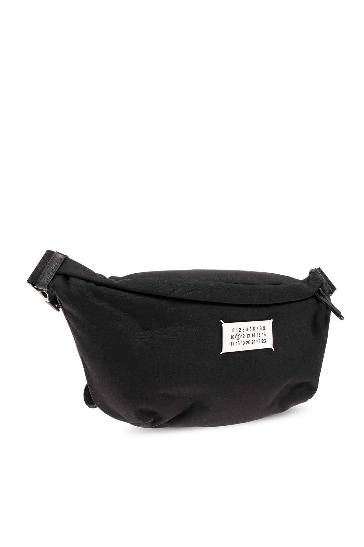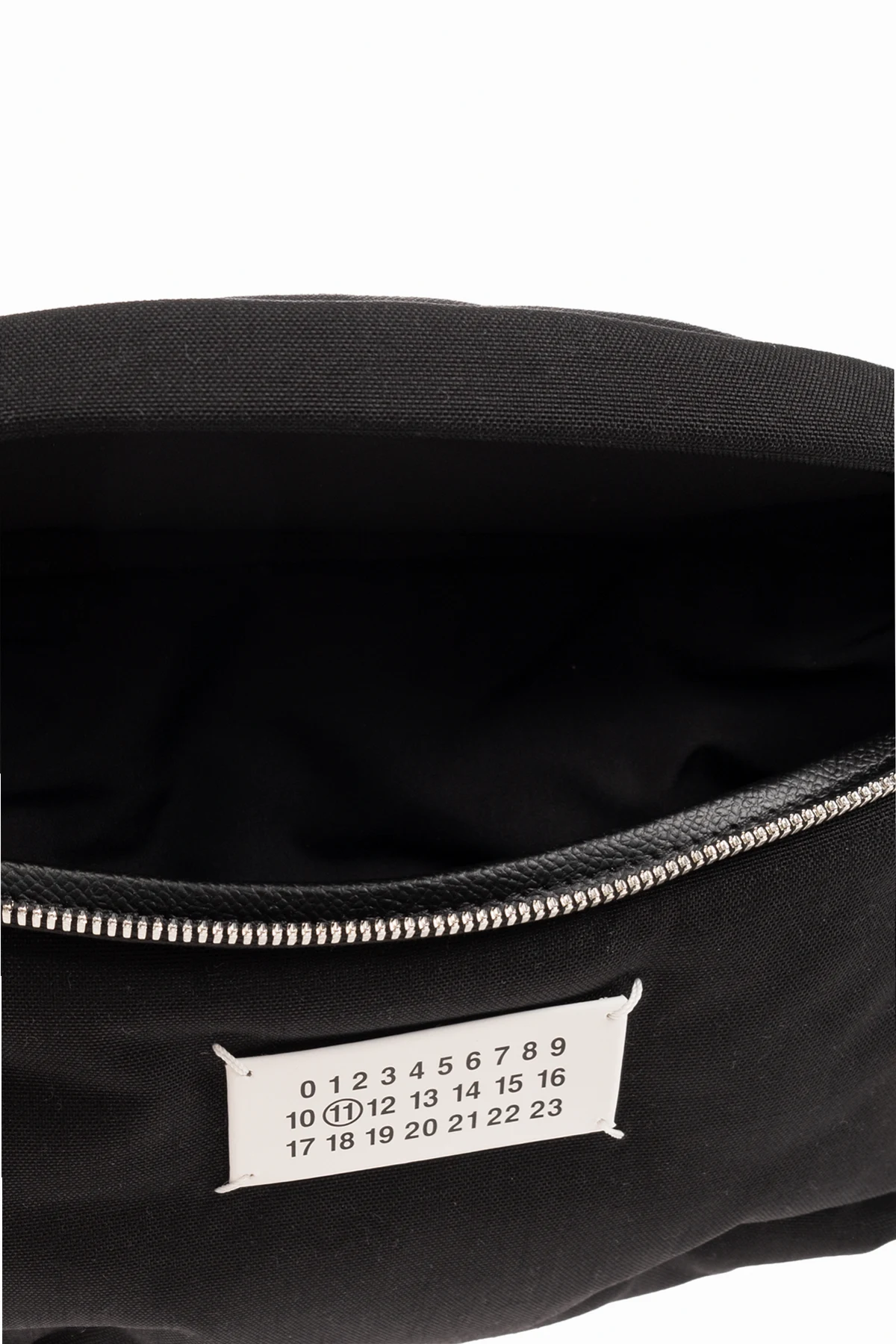 Black belt bag from Maison Margiela. Fastened with a two-way zip, this design features a white patch with a black numerical logo, zipped back pocket, adjustable belt, silver-tone metal hardware and one internal compartment with one zip pocket.