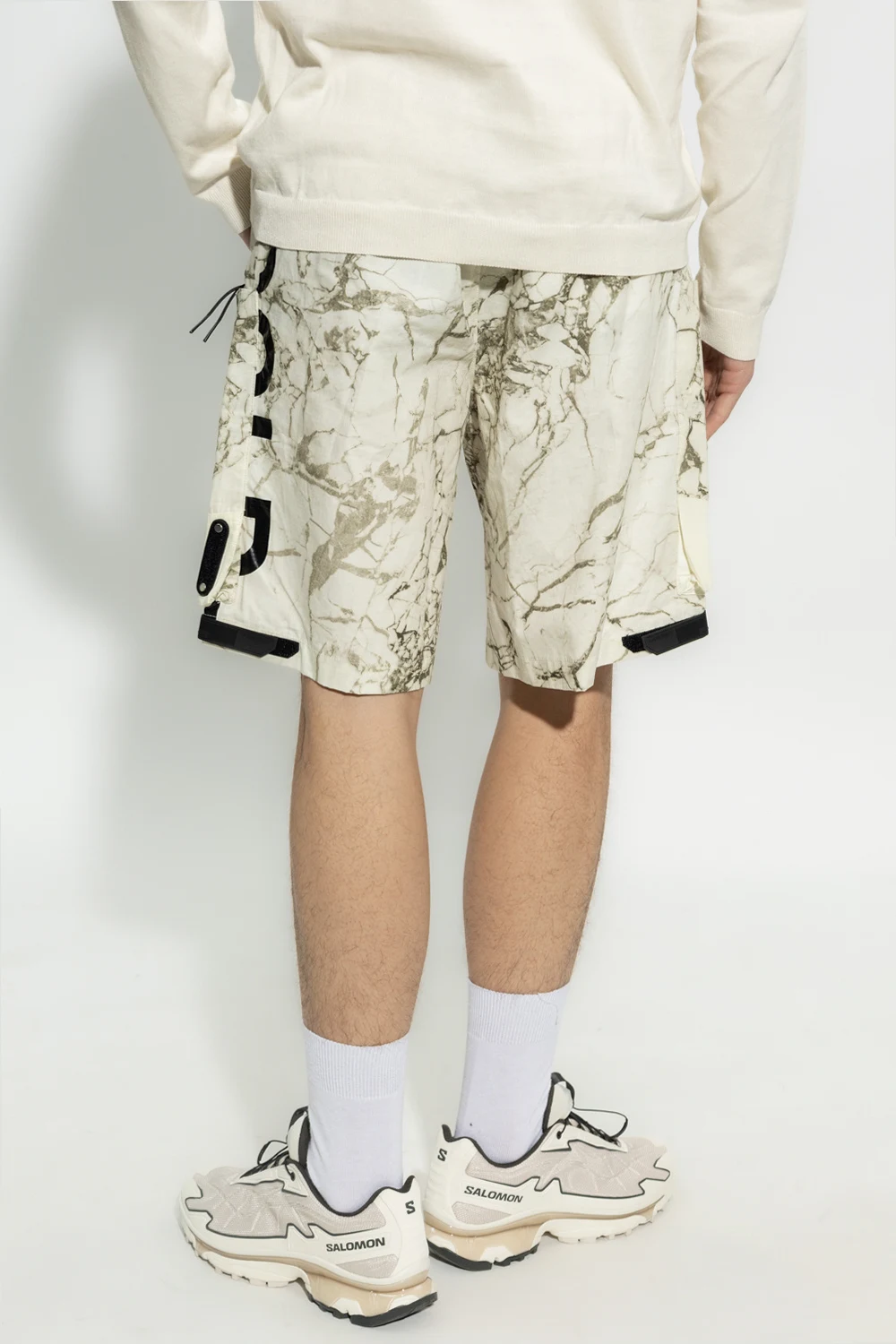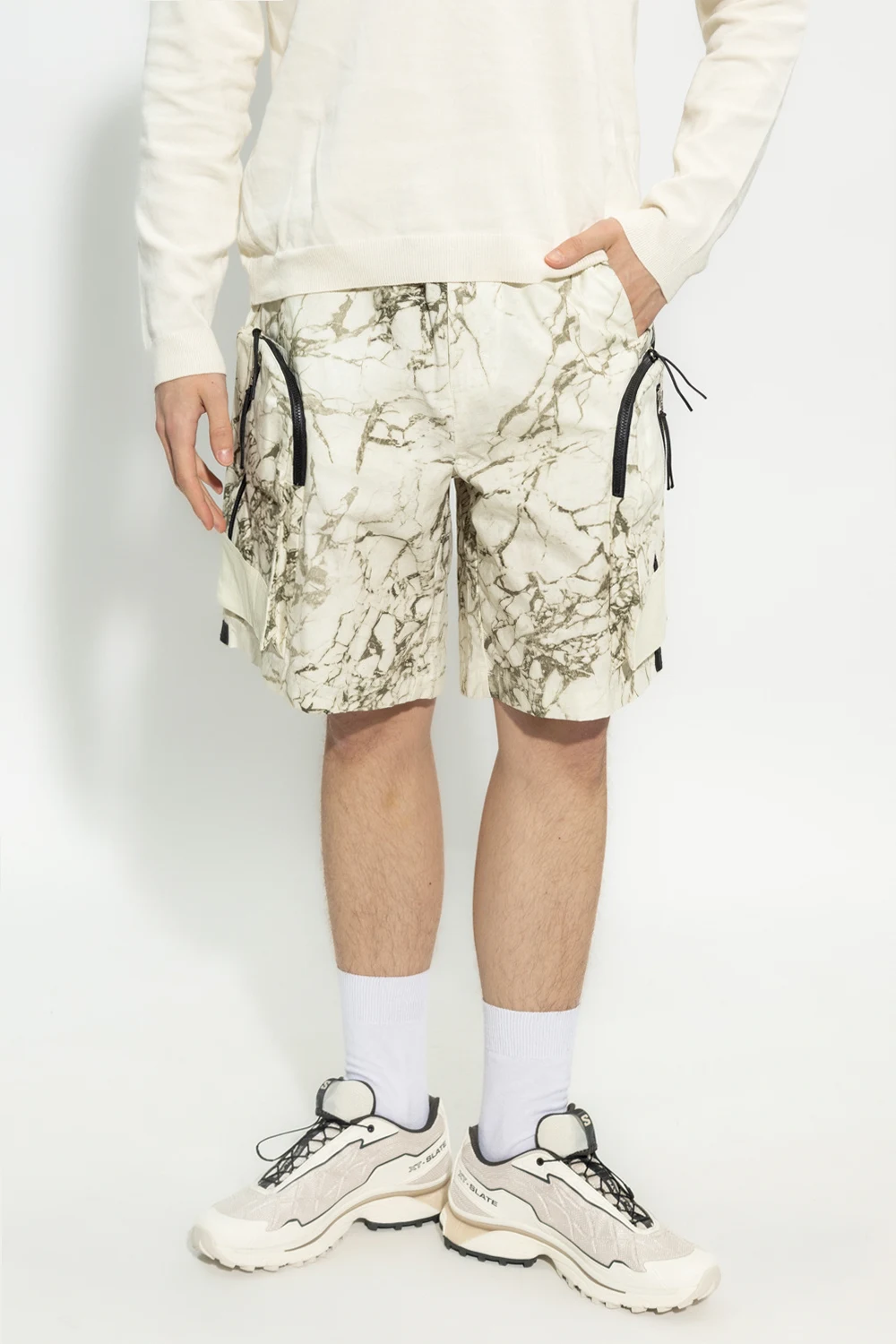 Cream, grey and green cargo shorts from A-COLD-WALL*. Made of ripstop cotton, this pair is complete with an elastic drawstring waistband, zip fastening, marble pattern, black logo print, two slip pockets, five zip pockets and black rubber tabs fastened with velcro at the legs.