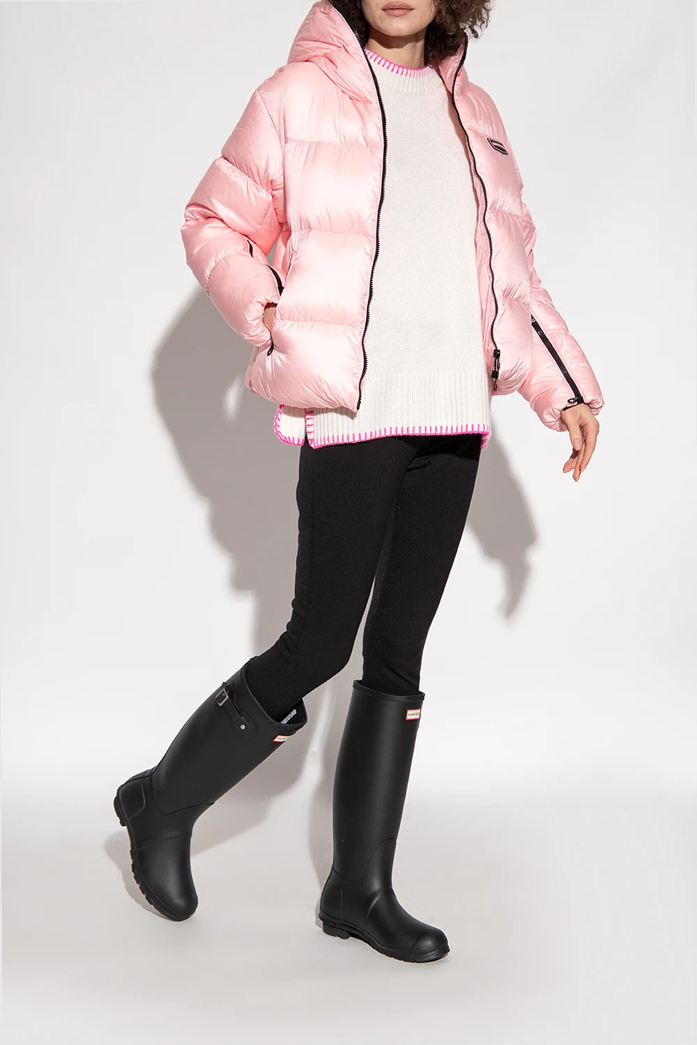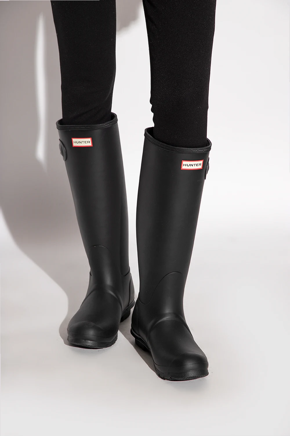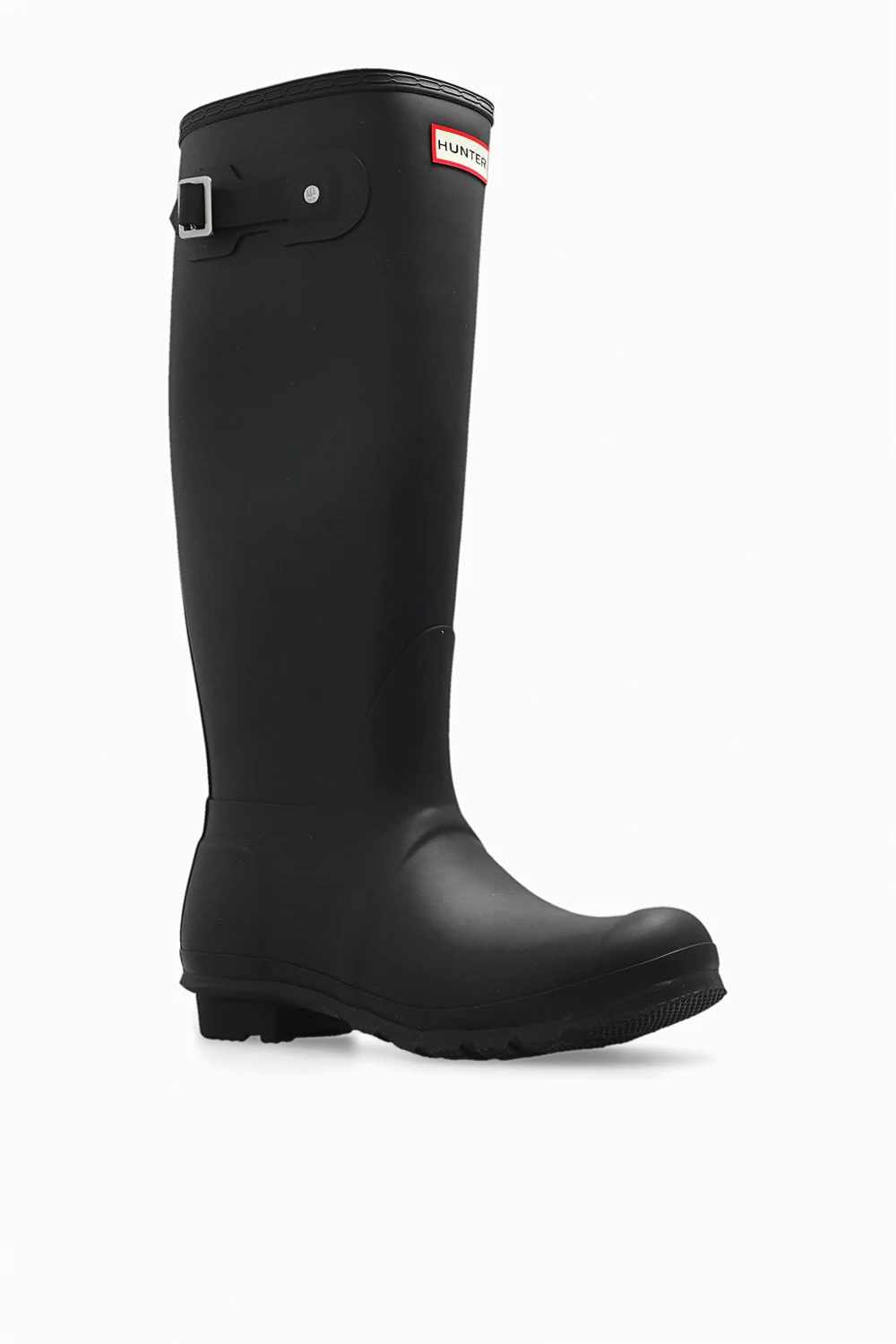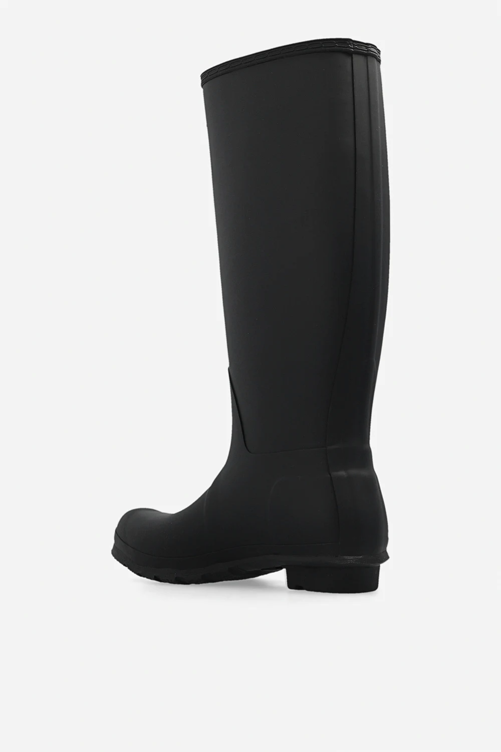 Black ‘Refined Tall Wellington’ slip-on rain boots from Hunter. Handcrafted from fewer rubber layers for a more lightweight feel, this design features a red, cream and black logo pattern, matte finish and black rubber sole.