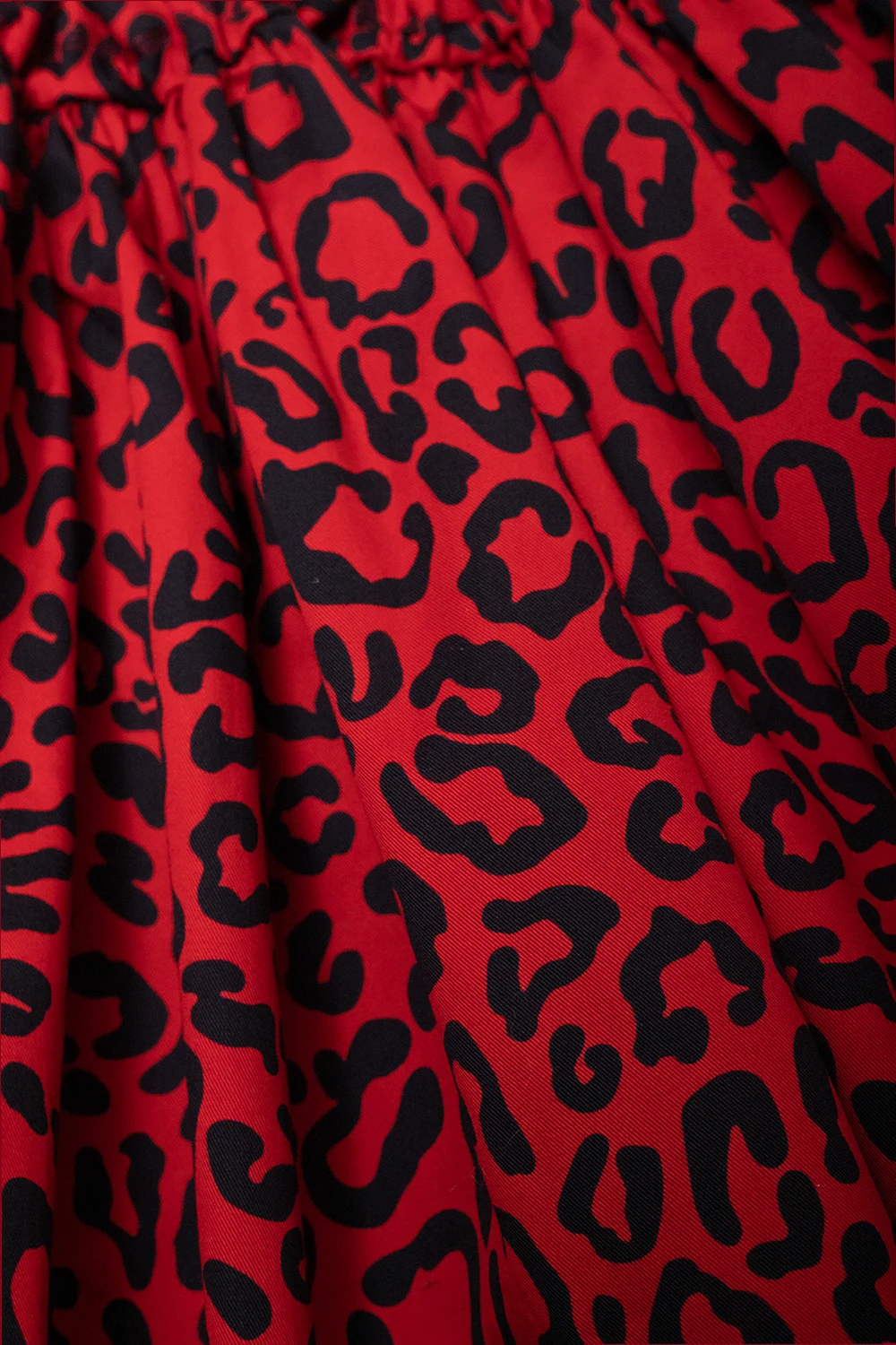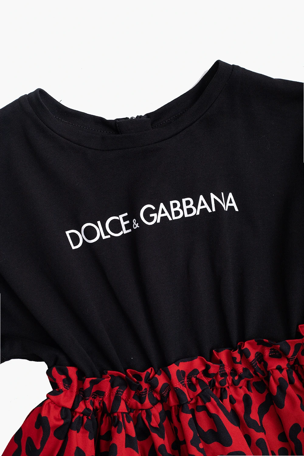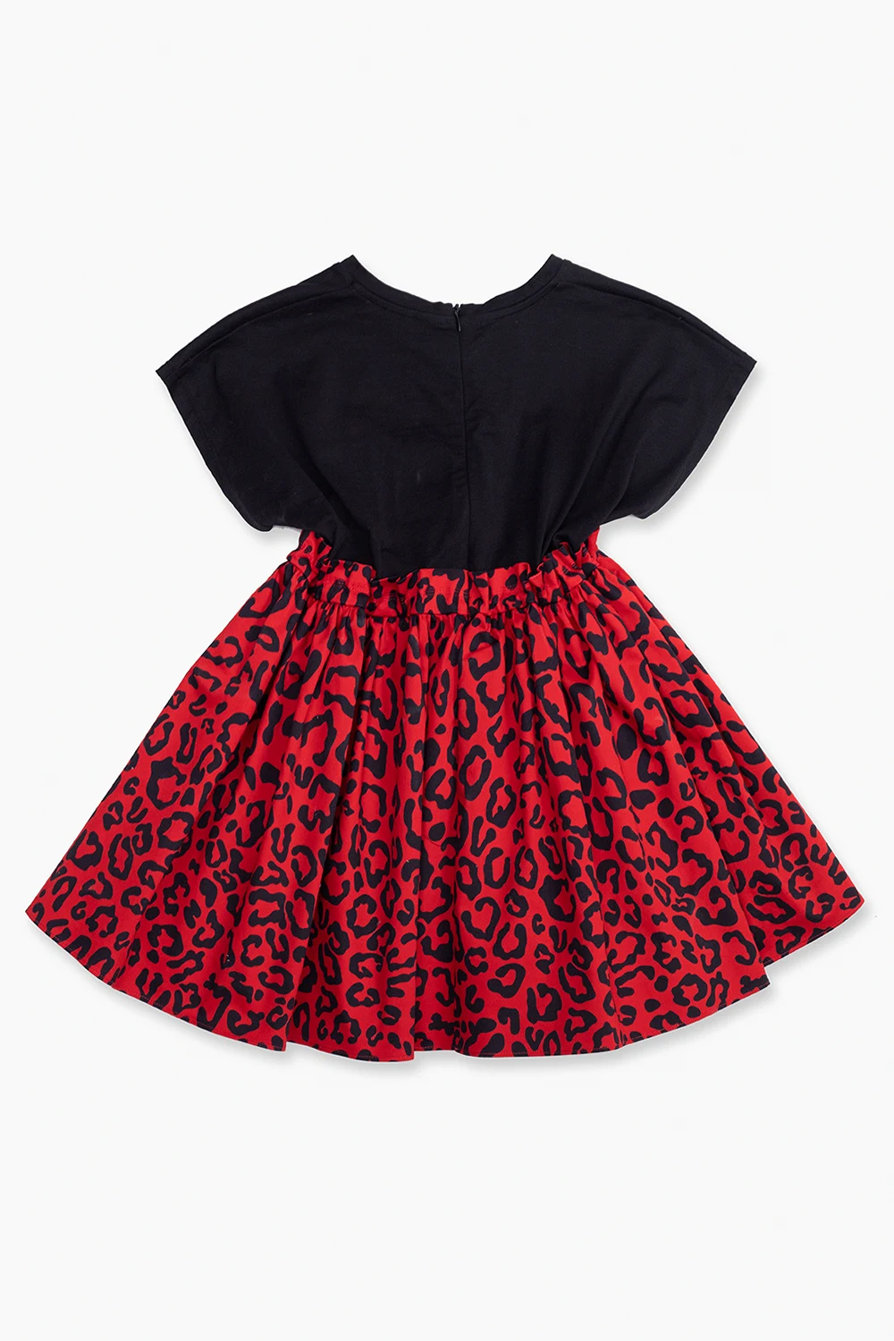 Black and red dress from Dolce & Gabbana Kids. Made of cotton, this design features a concealed back zip, round neck with ribbed trims, short sleeves with a white logo print and flared skirt with a leopard print.