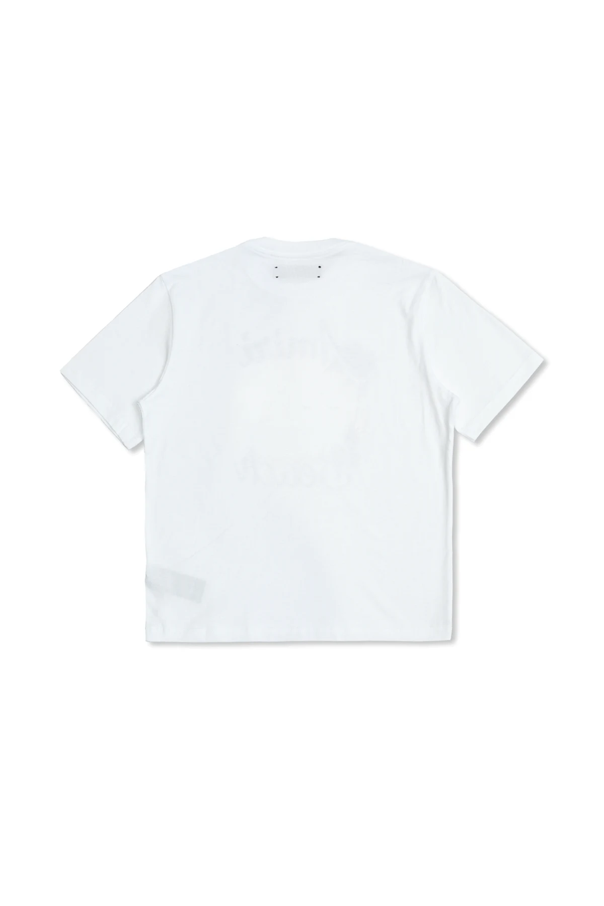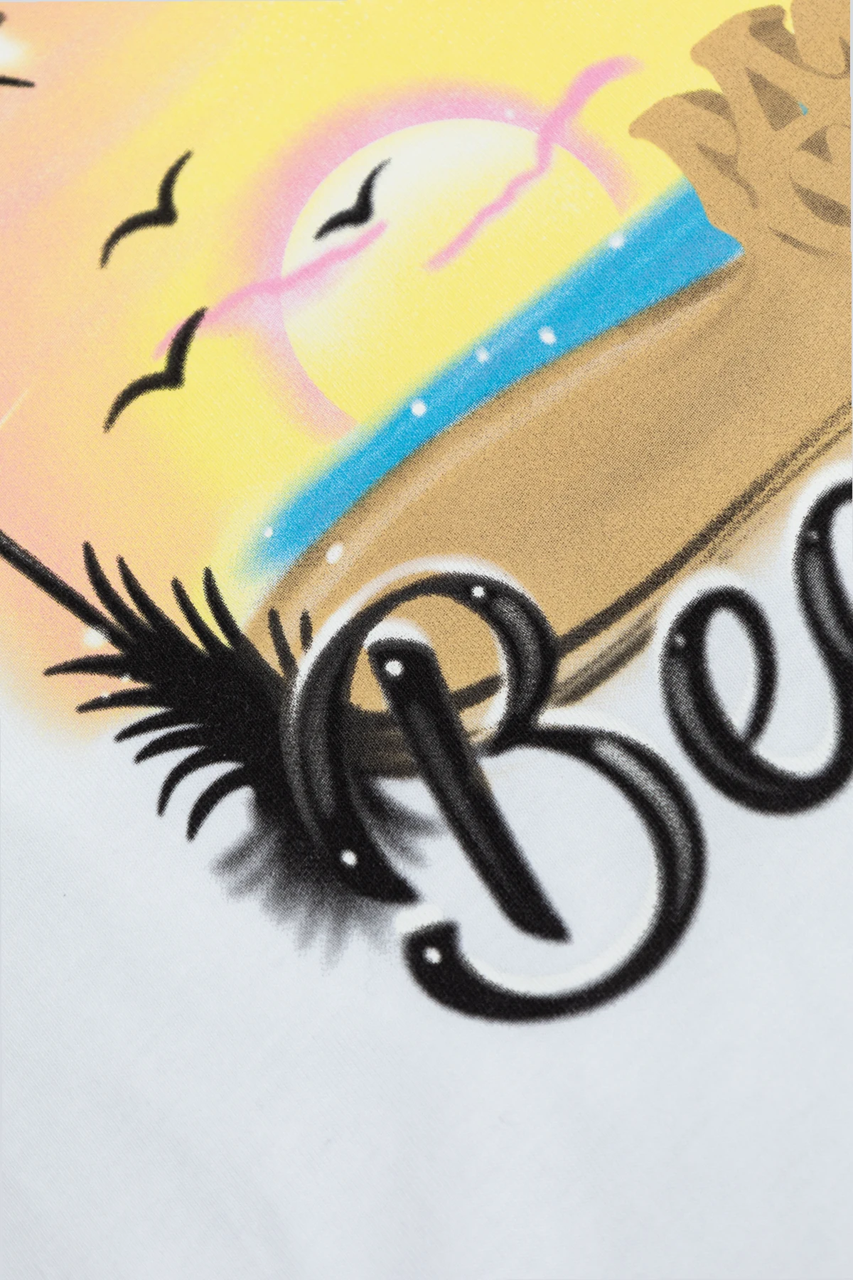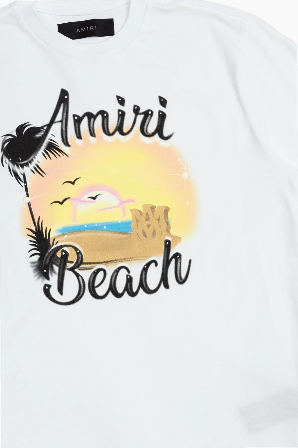 Introducing the quintessence of summer vibes encapsulated within the Amiri Beach T-shirt. Crafted with meticulous care, this piece is a symphony of vibrant hues and intricate details, rendered on a canvas of pristine white. The T-shirt, made from 100% premium cotton, promises not only unparalleled comfort but also enduring quality. The front is adorned with a mesmerizing print that captures the essence of a beach at sunset. The vivid portrayal of a palm, the sun setting into the sea, and birds in flight, all in rich shades of yellow, blue, and brown, evoke a sense of serene beauty. The \"Amiri Beach\" inscription, in a stylized, embossed black font, adds a distinctive, fashionable allure to the garment. Turning to the back, one finds a harmonious continuation of simplicity and elegance, with the sole addition of a subtle, jacquard brand emblem in the lower left corner, echoing the front\'s design narrative. Upon closer examination, the print\'s exquisite craftsmanship becomes evident. The seamless color transitions and the texture details of the sand and palm demonstrate a commitment to high precision and attention to detail, marking the T-shirt as a piece of exclusive fashion. Why Purchase This Product? Exquisite Design: Unique, eye-catching beach sunset print with stylish \"Amiri Beach\" branding. Premium Material: Crafted from 100% high-quality cotton for comfort and durability. Attention to Detail: High-precision print with detailed texture work, showcasing the exclusivity of the product. Elegant Simplicity: A clean, elegant design on the back with a subtle brand emblem.