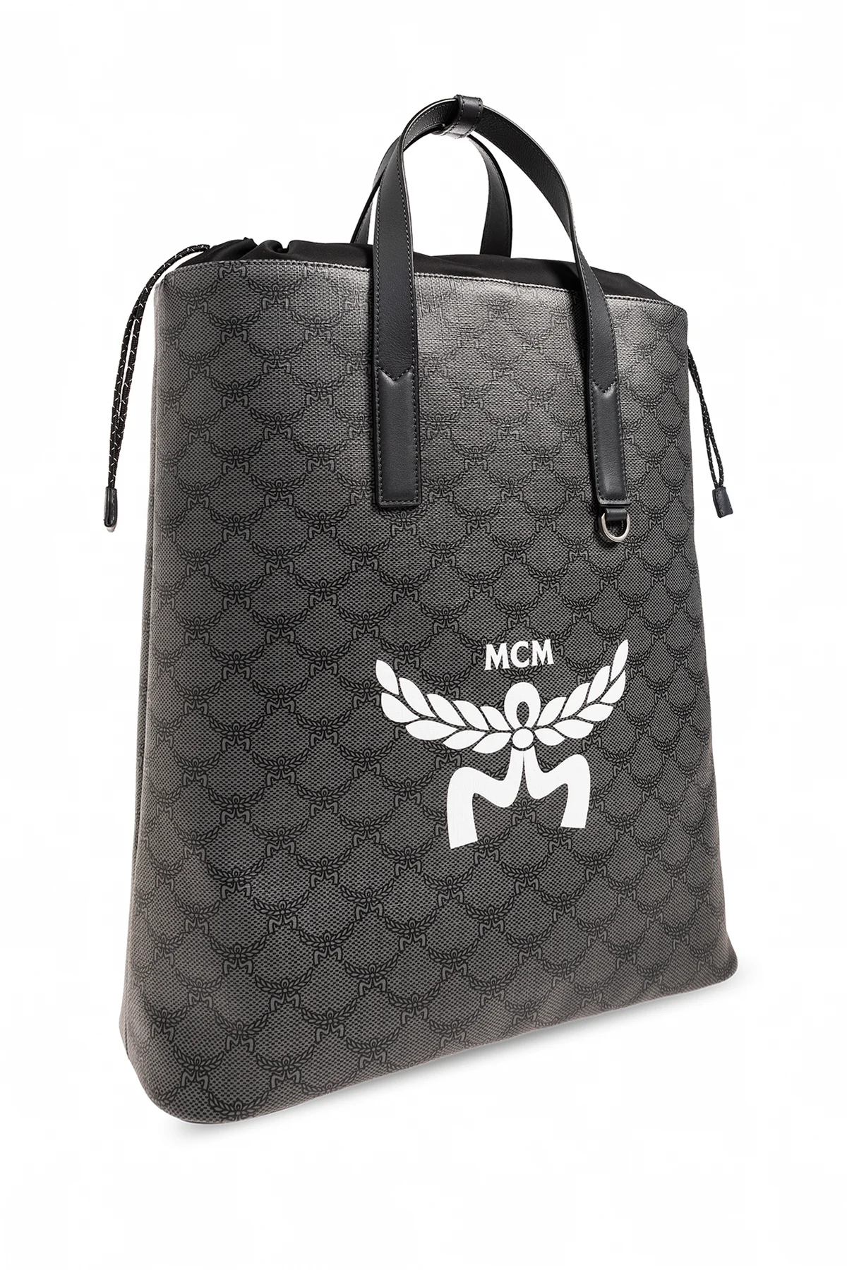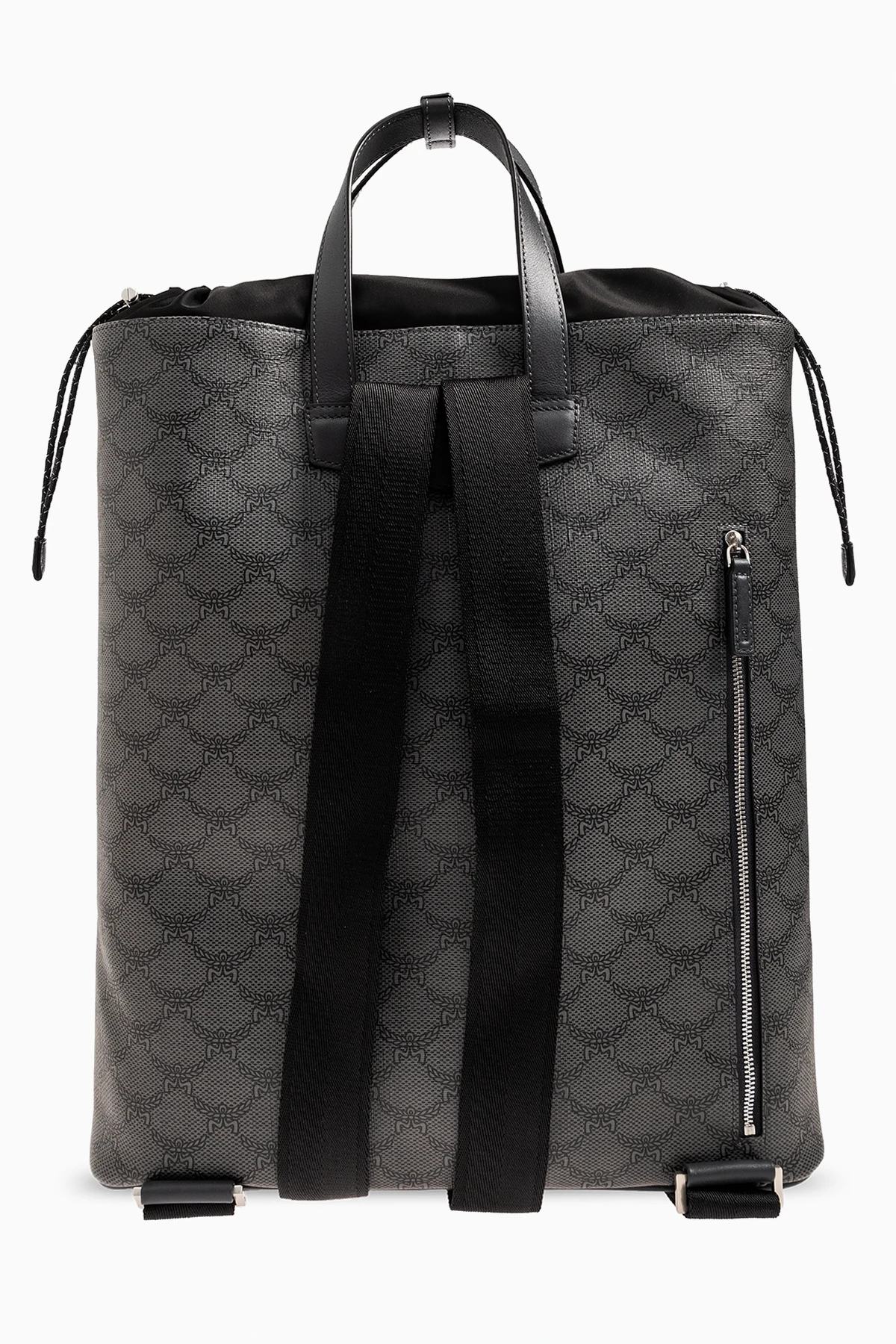 Grey ‘Himmel’ backpack from MCM. Made from coated canvas with a signature ‘Lauretos’ monogram, this item cinches closed with drawstrings on the sides and showcases a printed white logo on the front, one back zip pocket, two half-round handles, adjustable shoulder straps and one internal compartment with one zip pocket and two slip pockets.