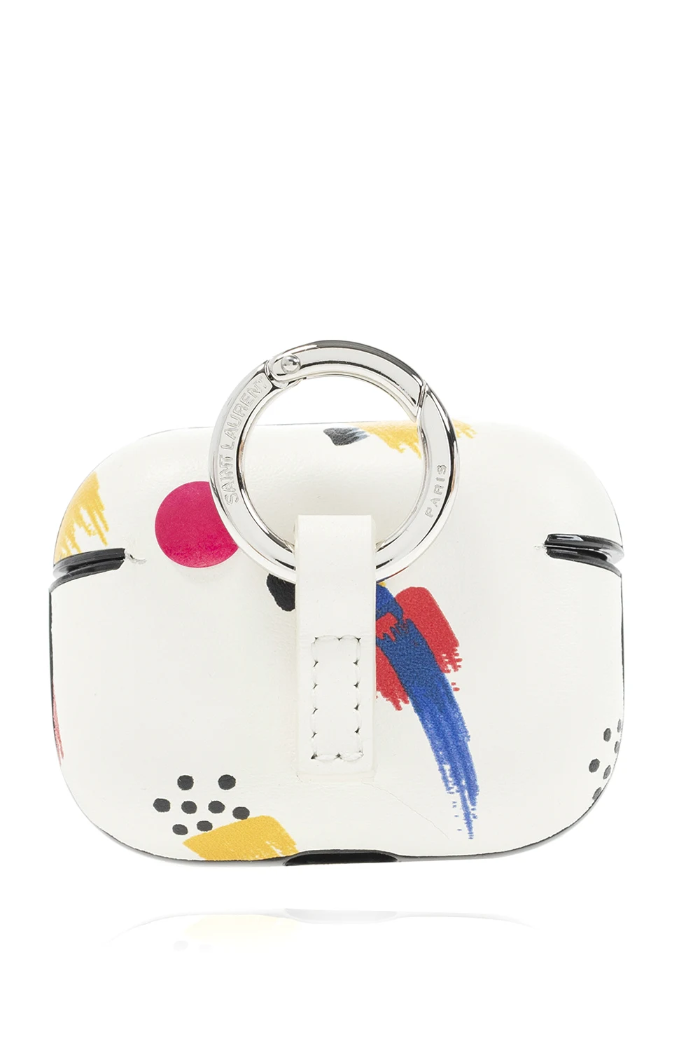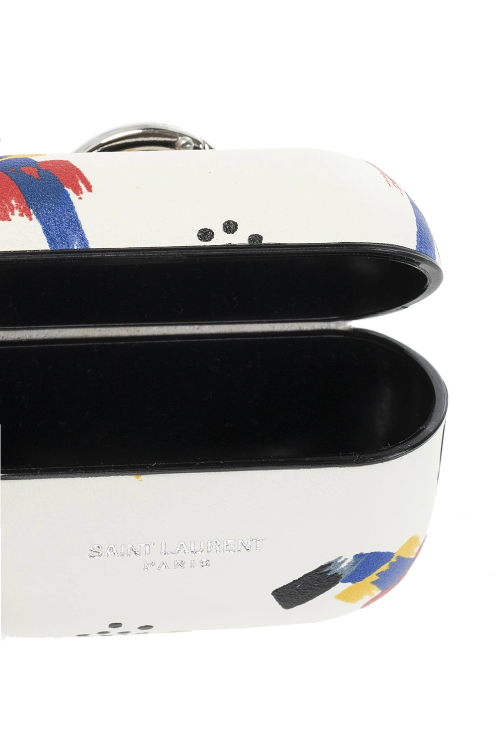 White AirPods case from Saint Laurent. This item comes with a silver-tone logo-embossed keyring and is decorated with a multicolored print and an embossed logo in silver-tone.