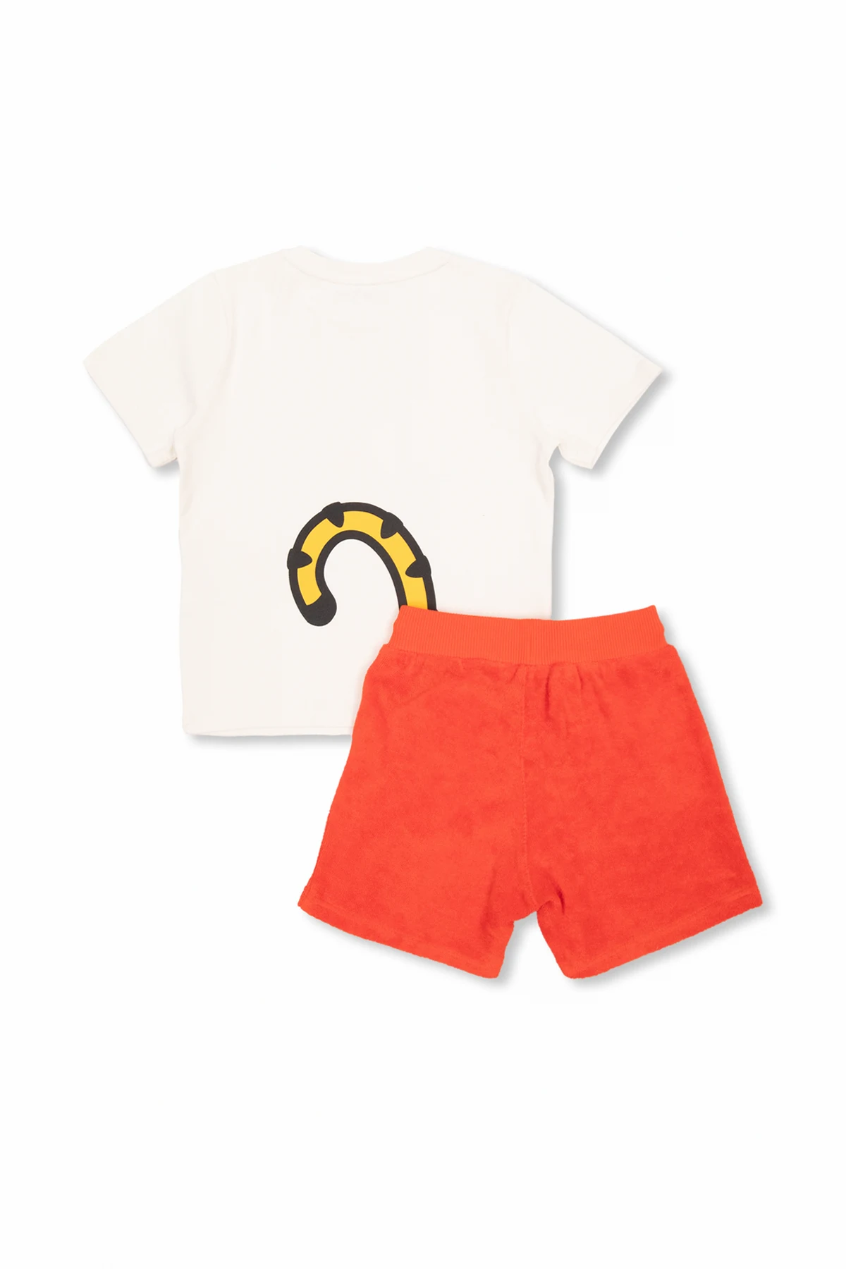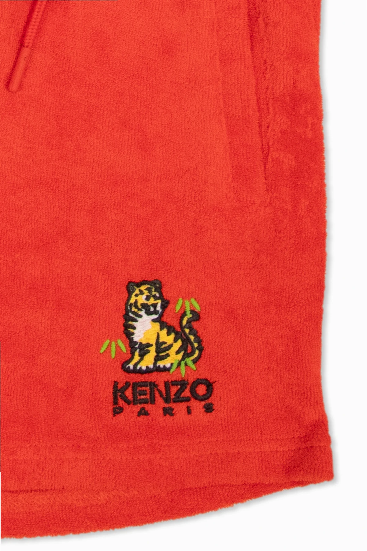 Immerse yourself in the vibrancy of summer with the Kenzo Kids T-shirt and Shorts Set. This ensemble, a harmonious blend of comfort and iconic style, showcases the prowess of Kenzo\'s design philosophy. The pristine white t-shirt, adorned with a vivid, colorful tiger print and the statement \"KENZO PARIS\" in bold black letters, pairs seamlessly with the striking red shorts. Crafted from a soft, breathable blend of cotton and modal, these shorts feature an elastic waist with drawstring adjustment for the perfect fit, complemented by a matching miniature tiger motif and logo on the left leg. The set\'s design ensures a relaxed, yet stylish silhouette, with the shorts\' visible seams underscoring their loose, comfortable cut. The absence of prints on the back of the t-shirt adds a touch of sophistication, allowing the front design to command attention. The detailed close-up views of the prints on both the t-shirt and shorts confirm the meticulous attention to detail that Kenzo Kids is renowned for, making this set not just clothing, but a piece of wearable art. Why Purchase This Set? Exquisite blend of 100% cotton and cotton-modal fabrics, offering unparalleled comfort and breathability. Iconic, eye-catching tiger print design, a hallmark of the Kenzo brand. Versatile and vibrant, perfect for both casual outings and stylish summer engagements. Adjustable, elastic waist shorts ensuring a perfect fit for all-day wear. Represents a fusion of high fashion and playful spirit, characteristic of Kenzo Kids.