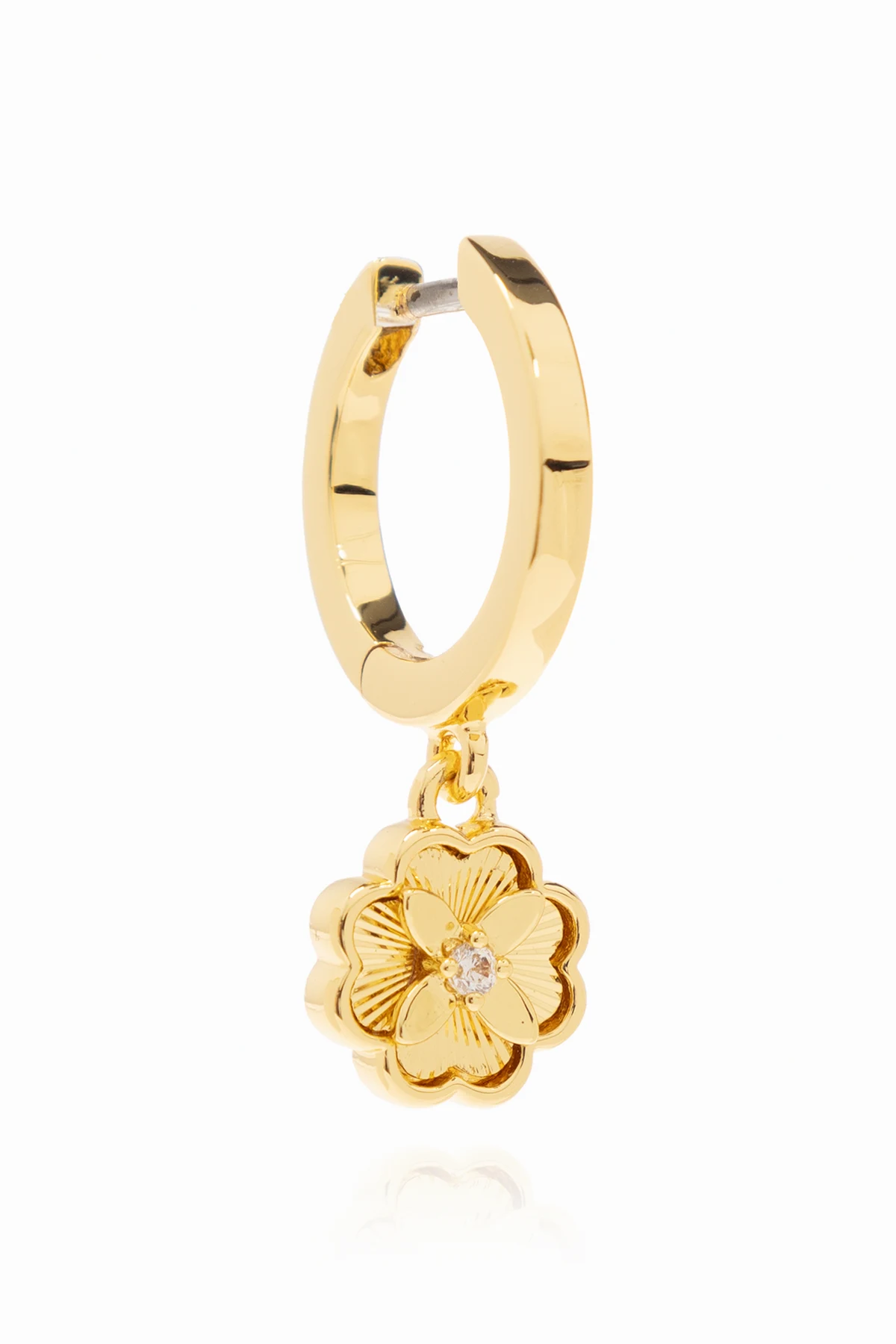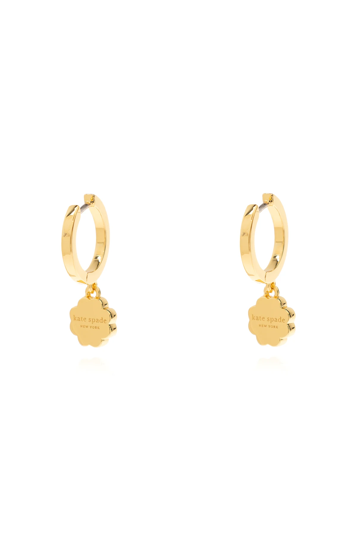 Immerse yourself in the delicate allure of the \"Bloom Huggies\" earrings by Kate Spade, where elegance meets whimsical charm. Crafted with meticulous attention to detail, these hoop earrings feature an exquisite golden hue that encapsulates the essence of luxury and grace. Each earring dangles from a slender golden chain, culminating in an ornamental flower. This botanical motif, a hallmark of the \"Bloom\" collection, showcases intricately designed petals and engraved details, with a shimmering accent at its core, reminiscent of a precious gemstone or a contrasting material, adding a touch of radiance and sophistication. The symmetrical design of these earrings, with each showcasing a singular floral element, reflects a harmonious balance between nature\'s beauty and artful craftsmanship. The proportions, as observed on a model, accentuate the face with subtlety and elegance, making the \"Bloom Huggies\" a testament to the wearer\'s refined taste. Moreover, the presence of the designer\'s logo assures authenticity and heralds the quality associated with Kate Spade\'s creations. Crafted from premium metal and adorned with cubic zirconia, these earrings are not just jewelry; they are a statement of sophistication and a tribute to the perennial beauty of nature. Why Purchase This Product? Elegant Design: Captures the essence of botanical beauty with a modern twist. Premium Materials: Made with high-quality metal and cubic zirconia for lasting brilliance. Authenticity: Branded with Kate Spade\'s logo, ensuring genuine craftsmanship. Versatile Wear: Perfect for both everyday elegance and special occasions.
